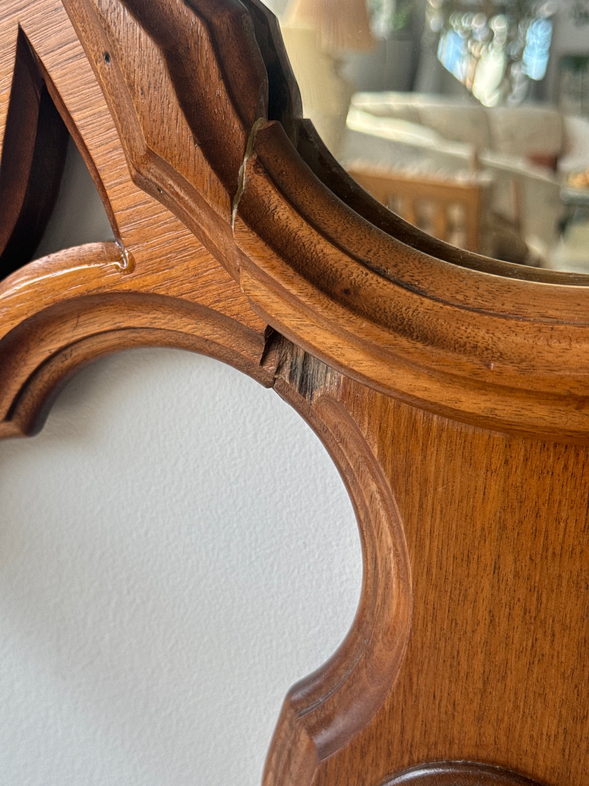 Great vintage condition. Some small area around mirror with missing wood pieces, and repair, as shown. Some oxidation on cast iron piece.