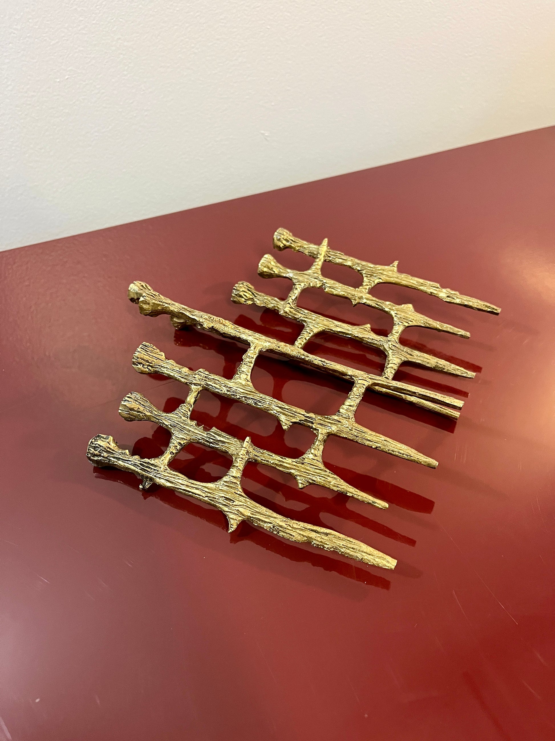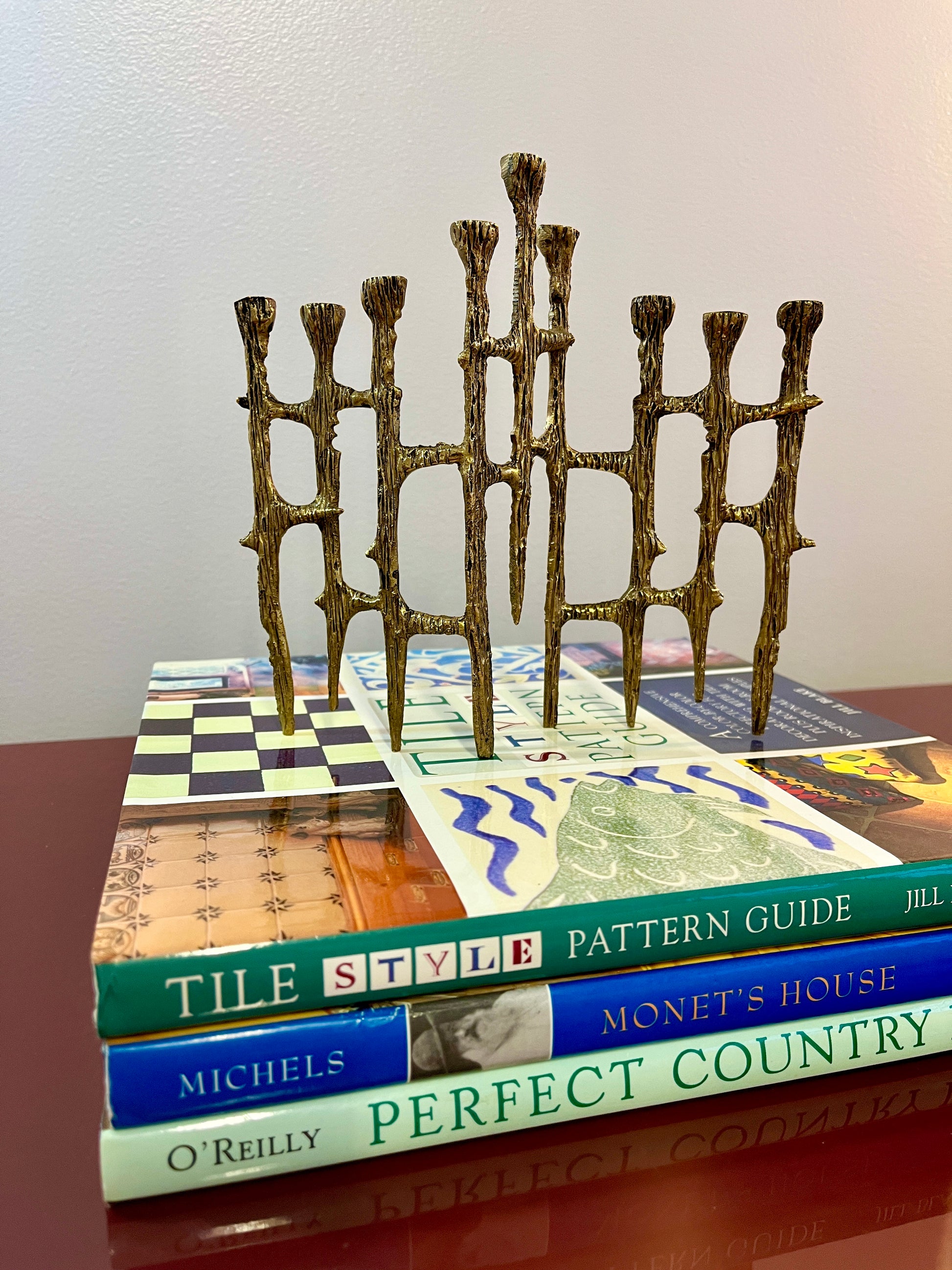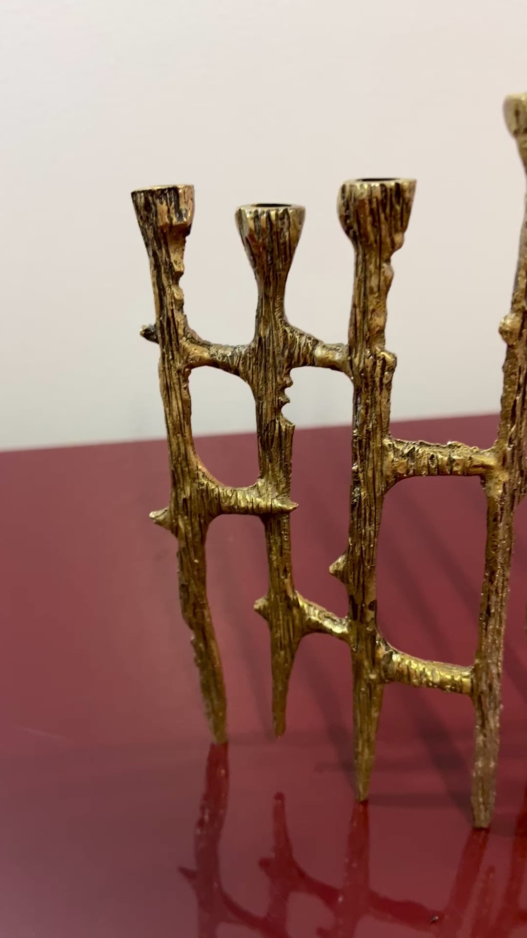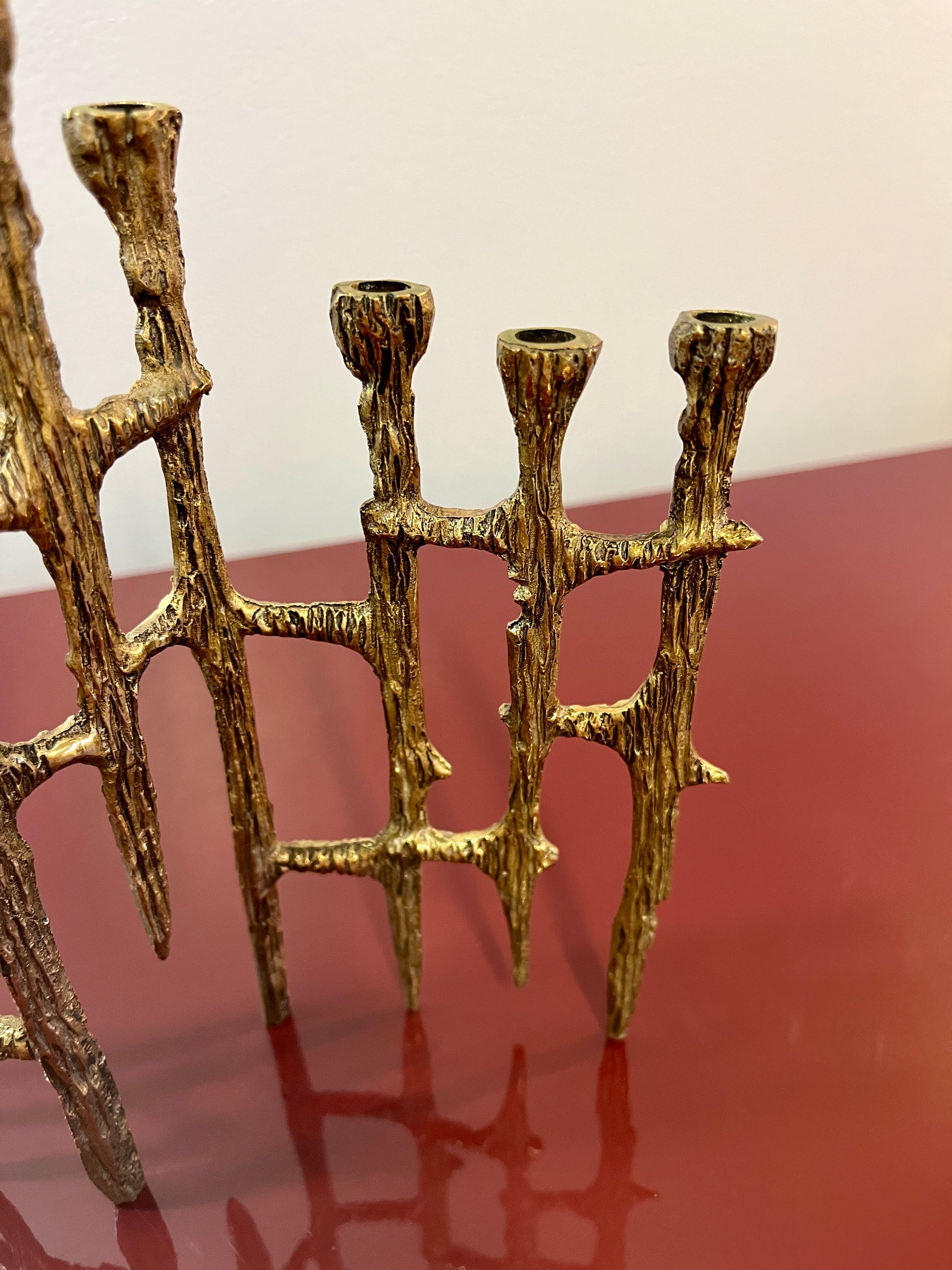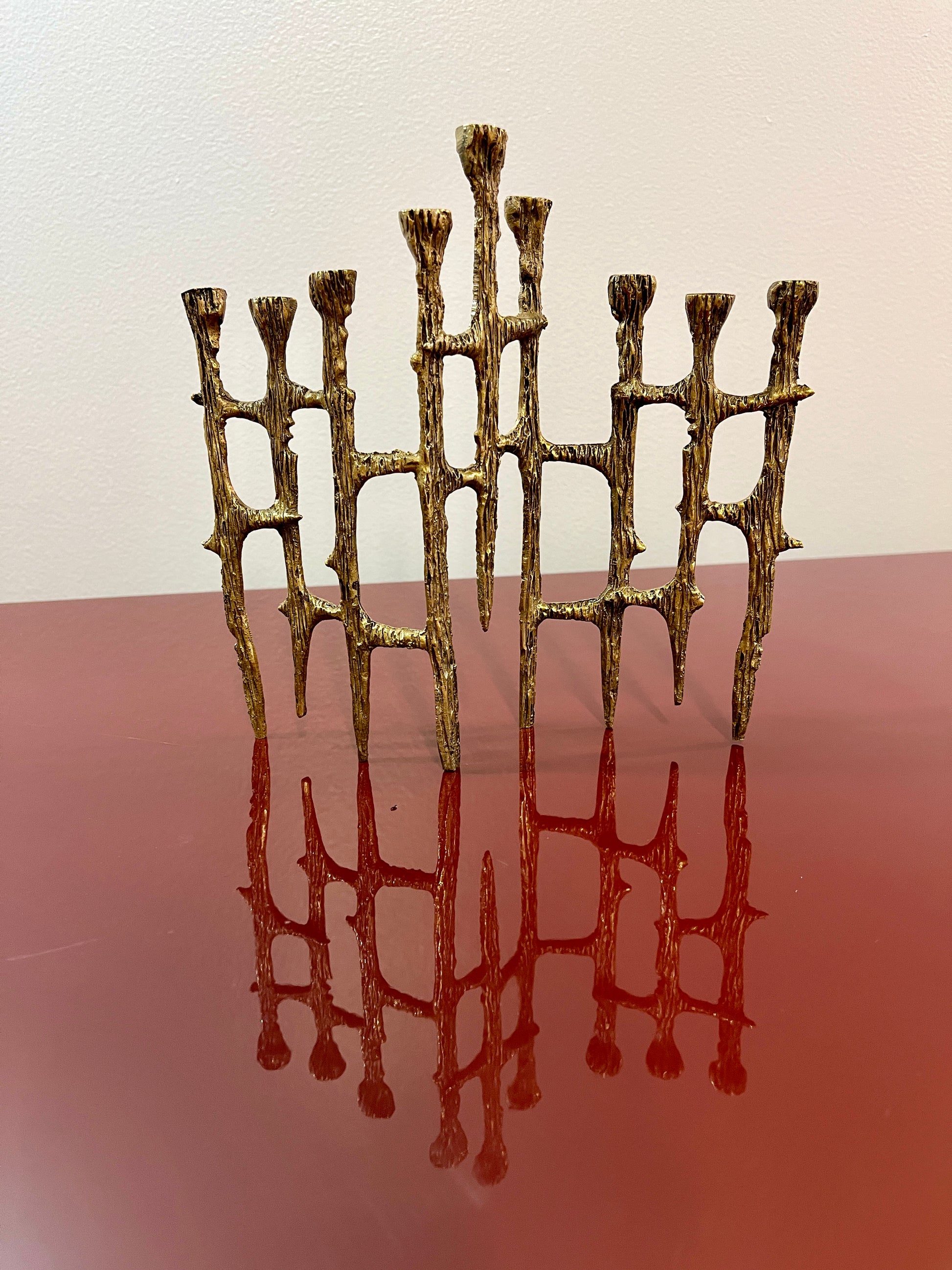Striking mid-century Brutalist-style menorah. Glowing textured brass.
