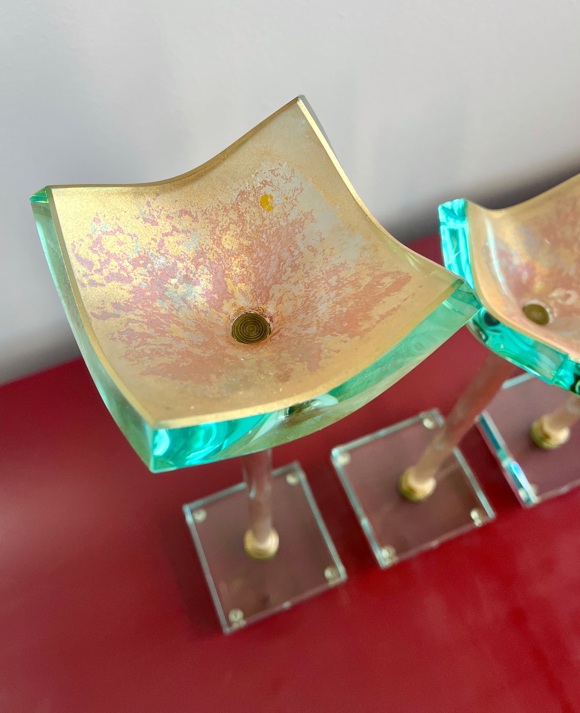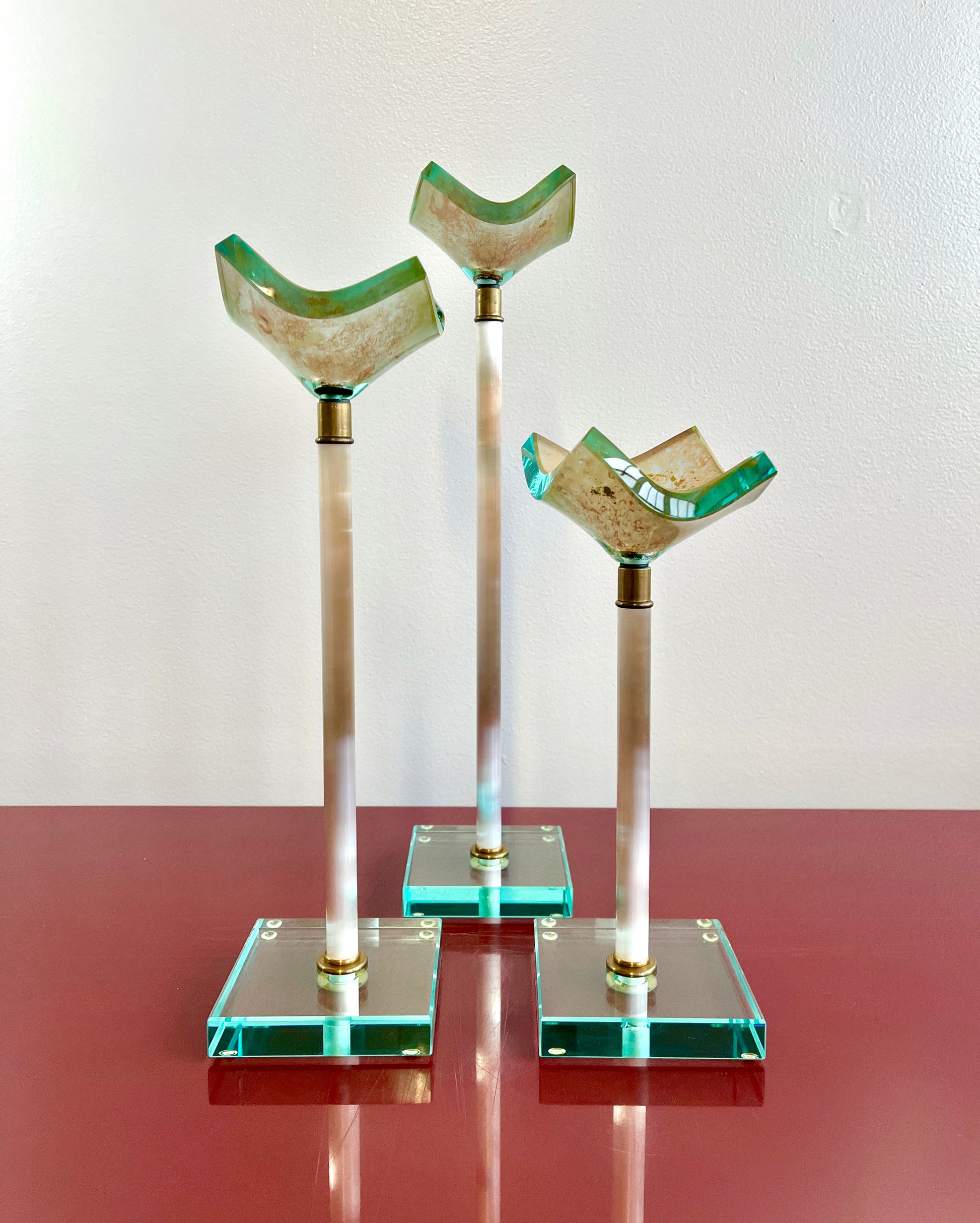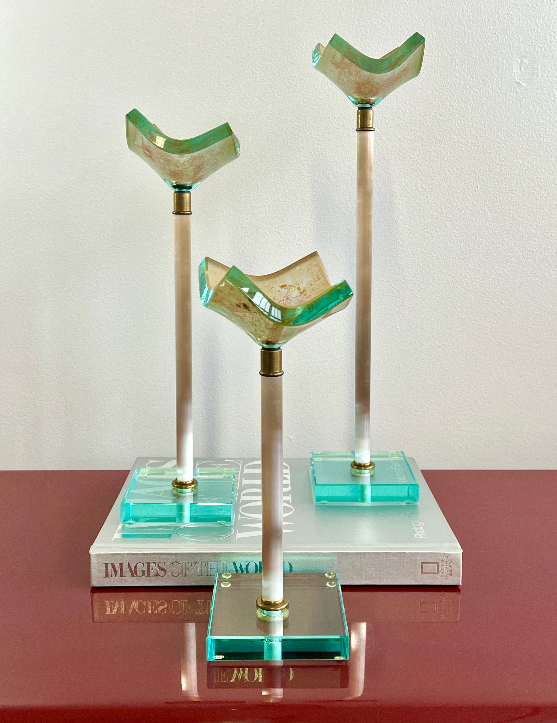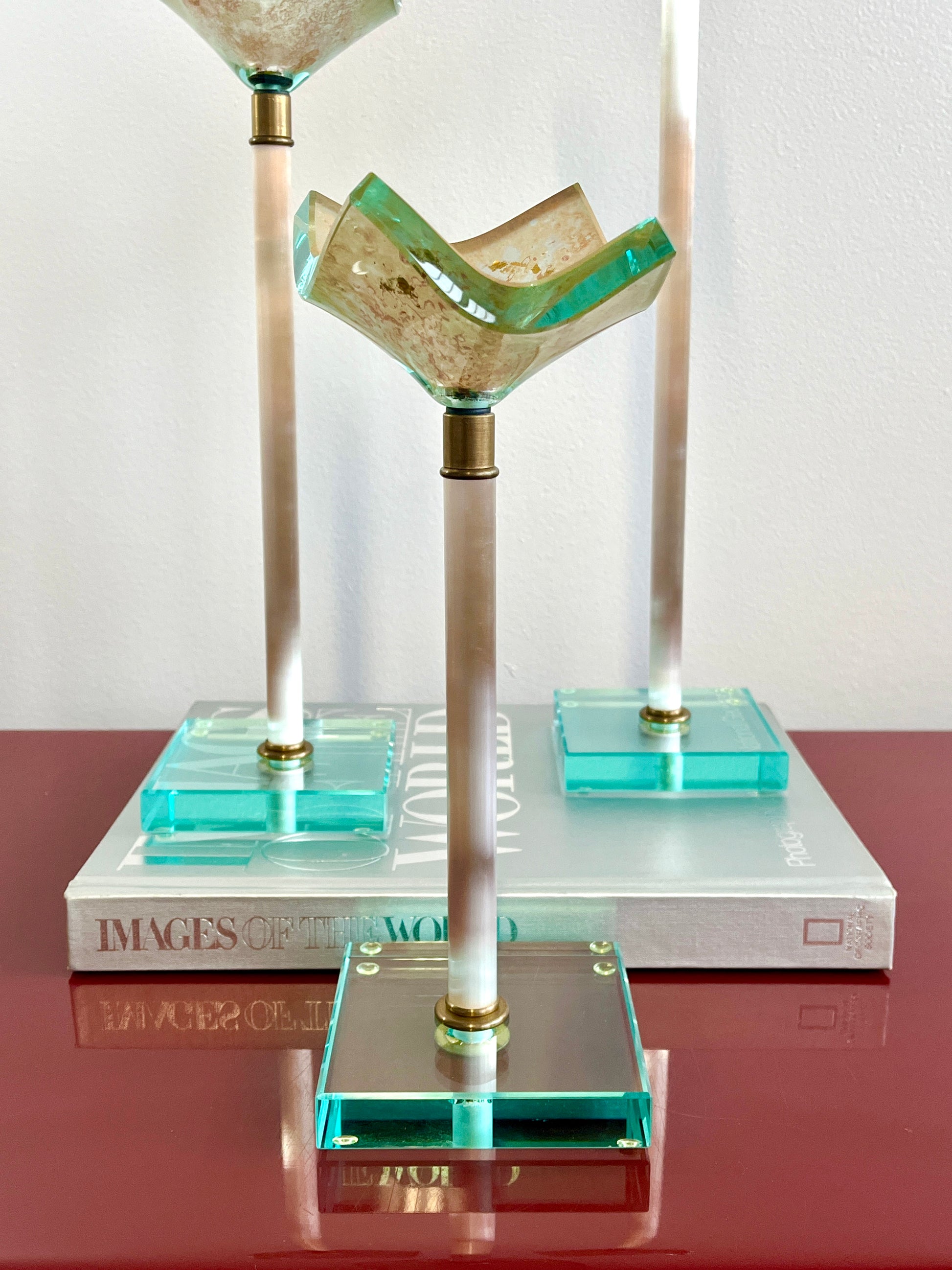 Gorgeous and rare vintage mid-century trio of art glass candlesticks by renowned potter Tony Evans. Square bases of solid blue-tinted glass. Iridescent white glass columns lead to blue-tinted glass candleholders that look like petals. The internal side of candleholders has a matte gold-bronze finish similar to the look of raku, which Evans was known for. These would be lovely with small round votives. They would also be wonderful as sculptural pieces without candles. Signed on base of one. Rubber feet on bottoms.