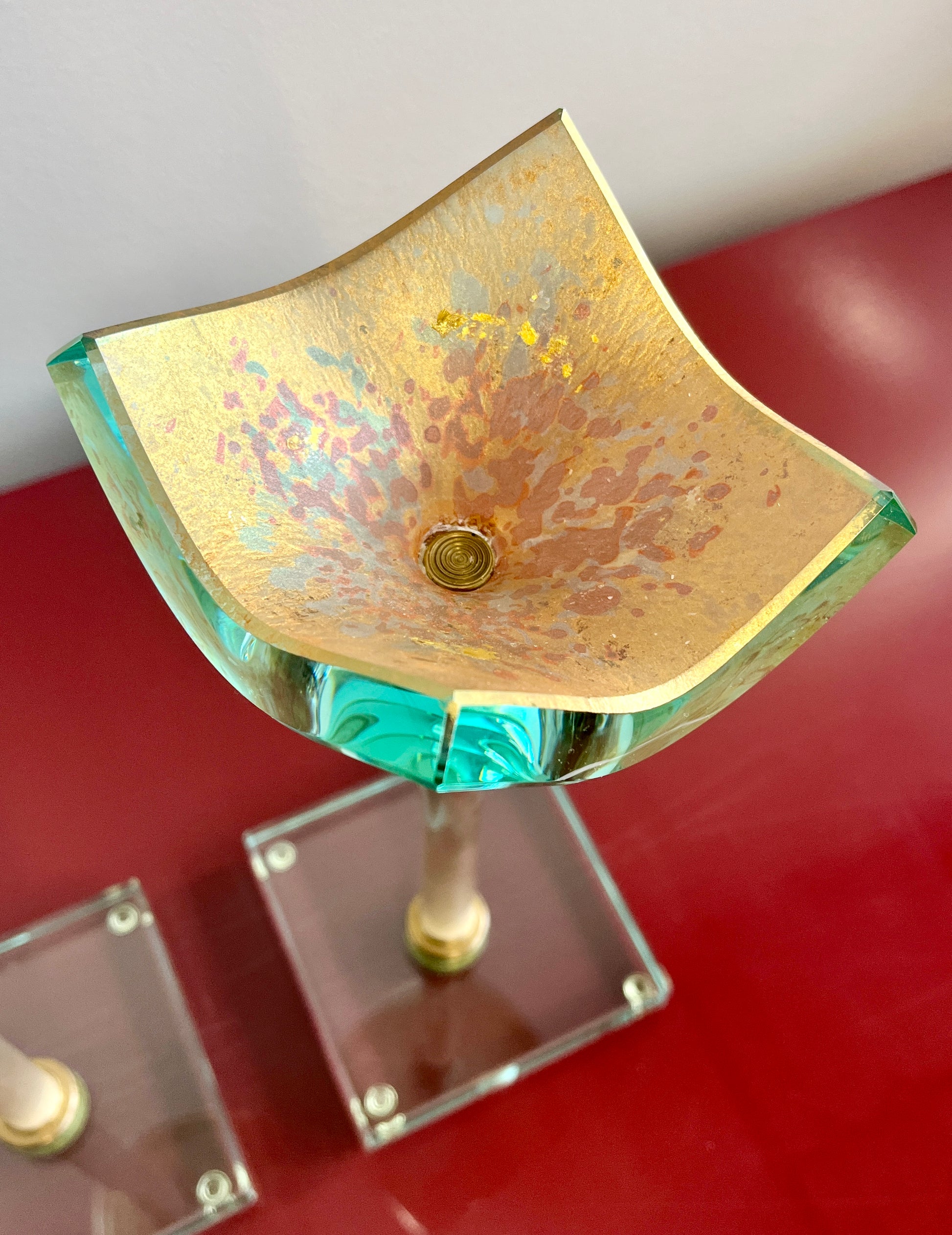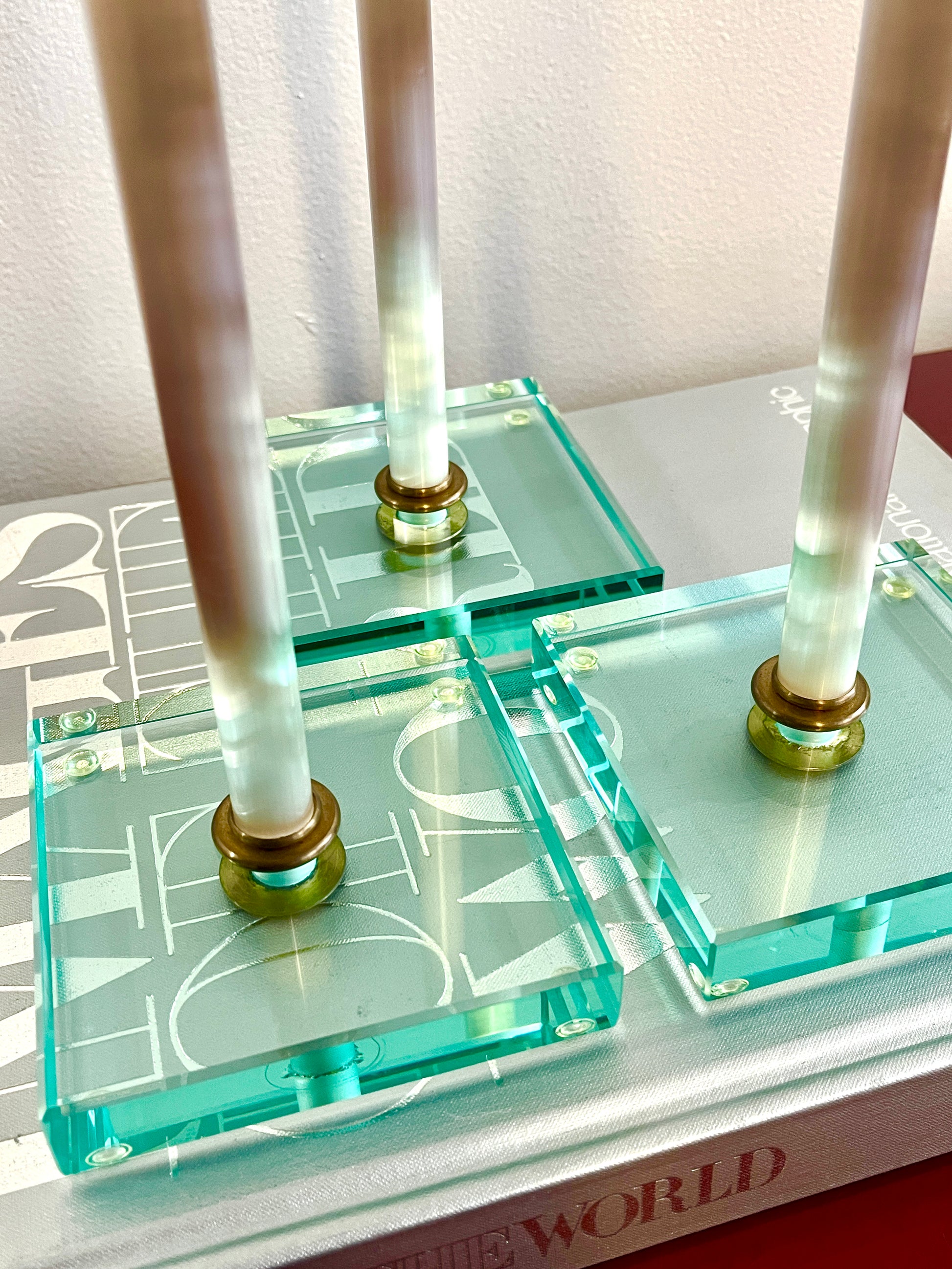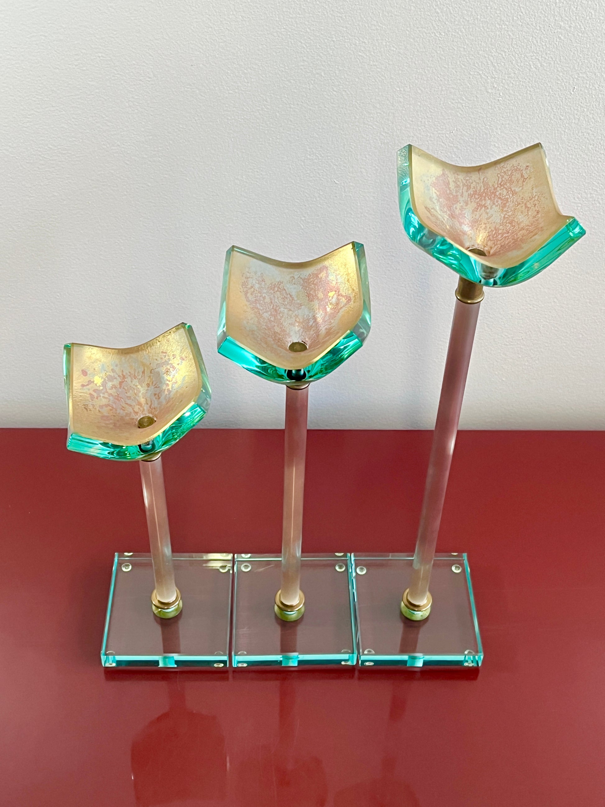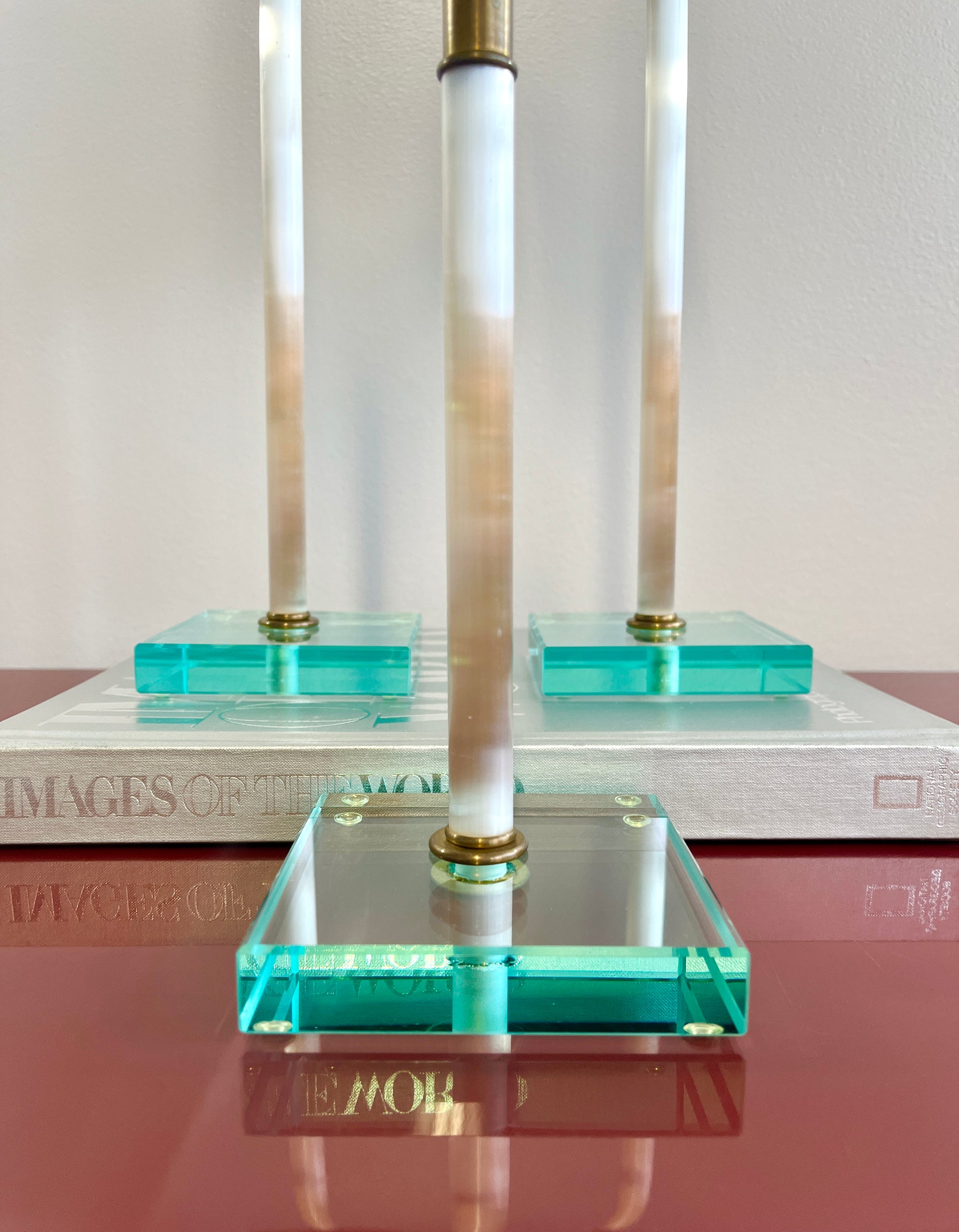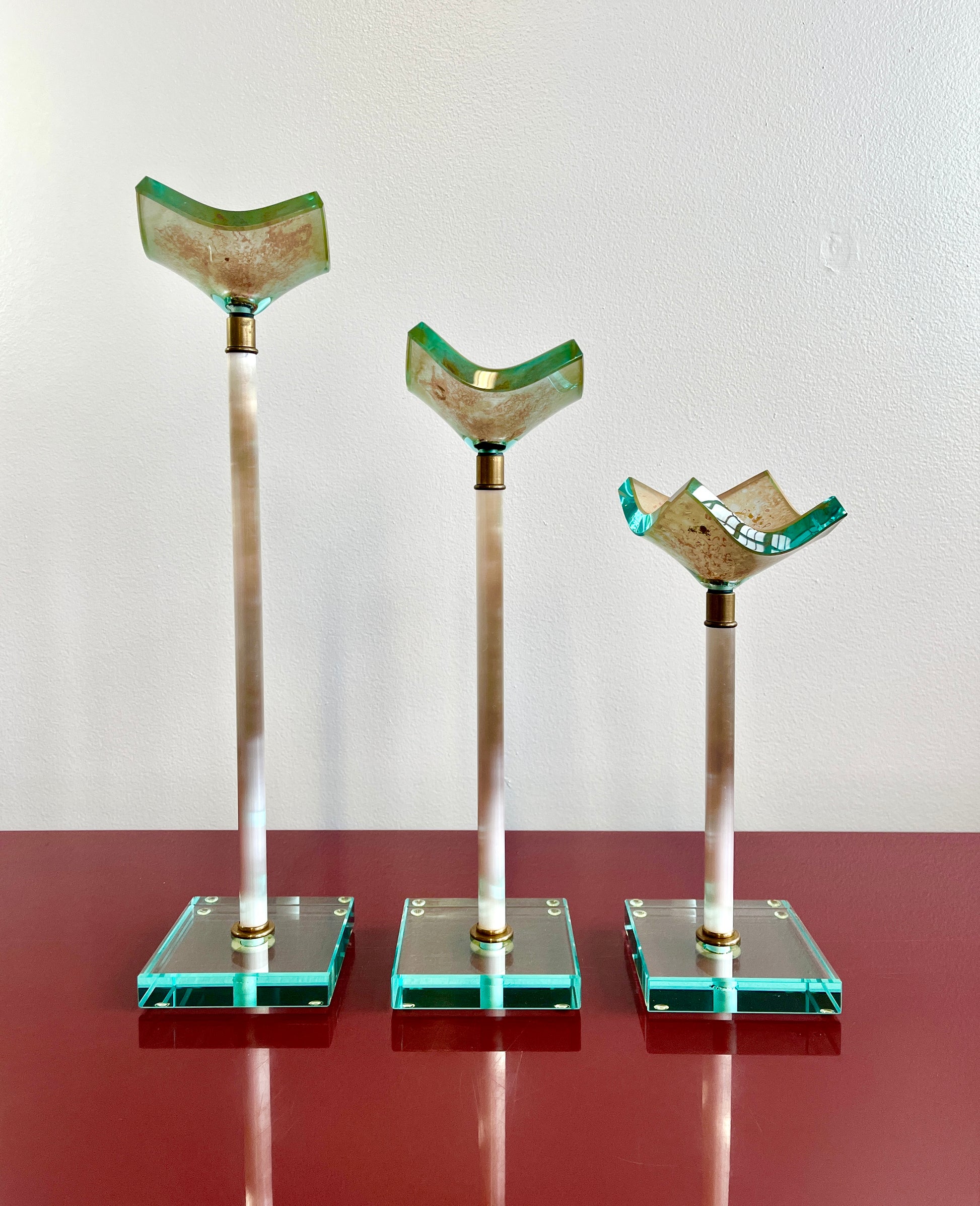 Gorgeous and rare vintage mid-century trio of art glass candlesticks by renowned potter Tony Evans. Square bases of solid blue-tinted glass. Iridescent white glass columns lead to blue-tinted glass candleholders that look like petals. The internal side of candleholders has a matte gold-bronze finish similar to the look of raku, which Evans was known for. These would be lovely with small round votives. They would also be wonderful as sculptural pieces without candles. Signed on base of one. Rubber feet on bottoms.