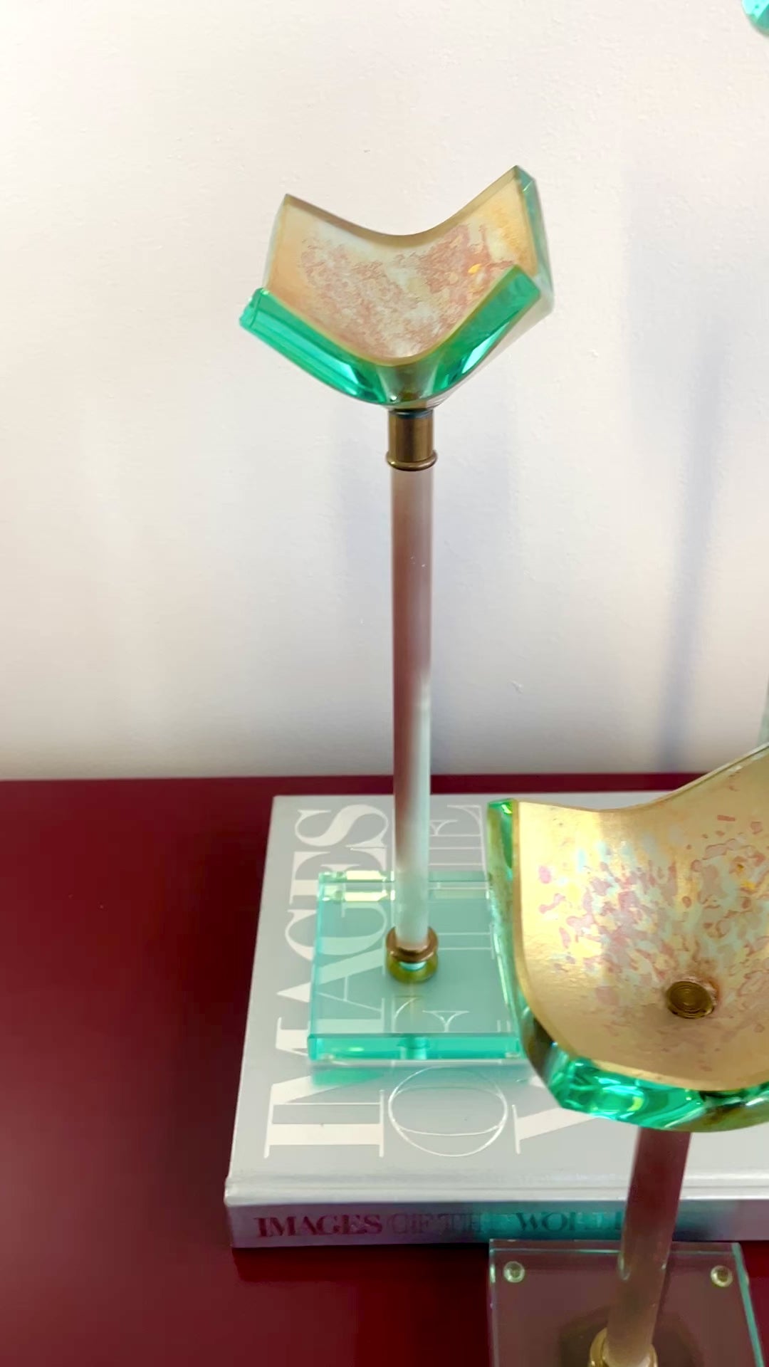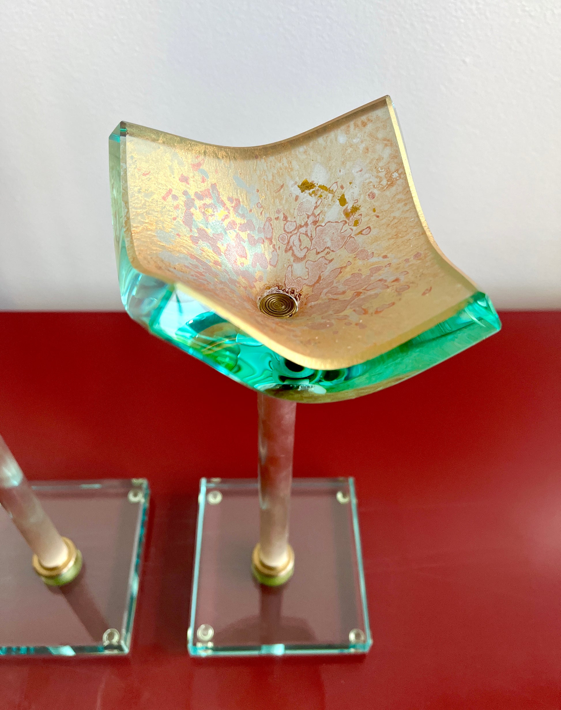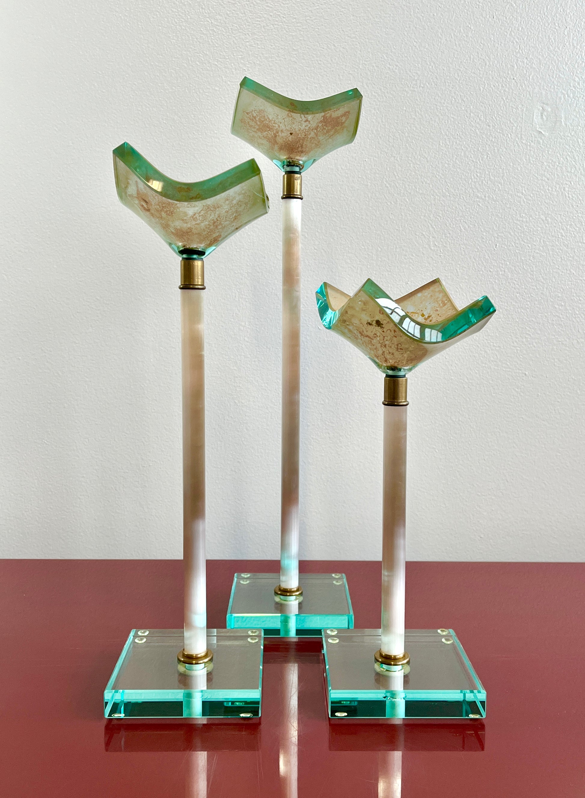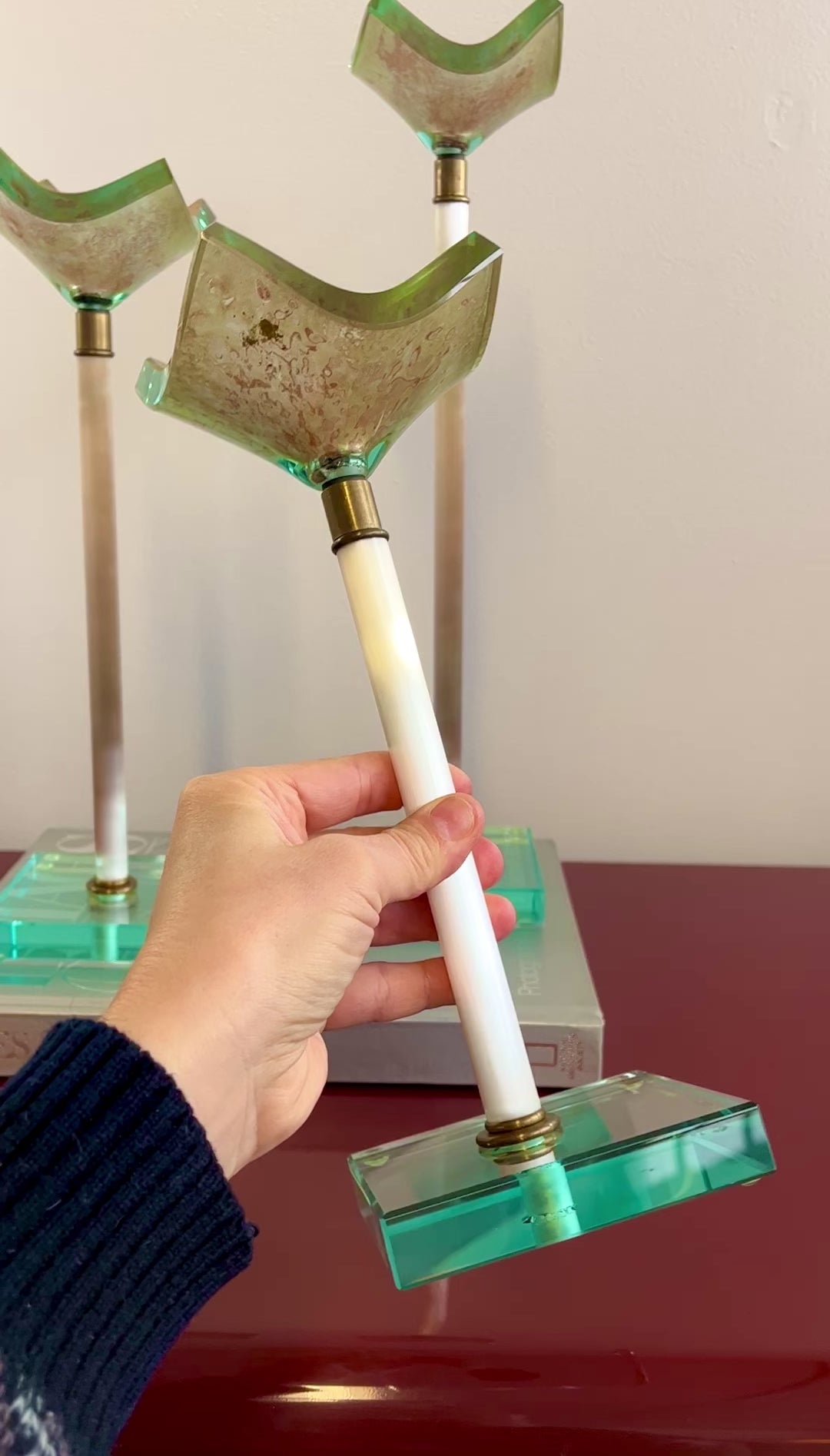 Gorgeous and rare vintage mid-century trio of art glass candlesticks by renowned potter Tony Evans. Square bases of solid blue-tinted glass. Iridescent white glass columns lead to blue-tinted glass candleholders that look like petals. The internal side of candleholders has a matte gold-bronze finish similar to the look of raku, which Evans was known for. These would be lovely with small round votives. They would also be wonderful as sculptural pieces without candles. Signed on base of one. Rubber feet on bottoms.