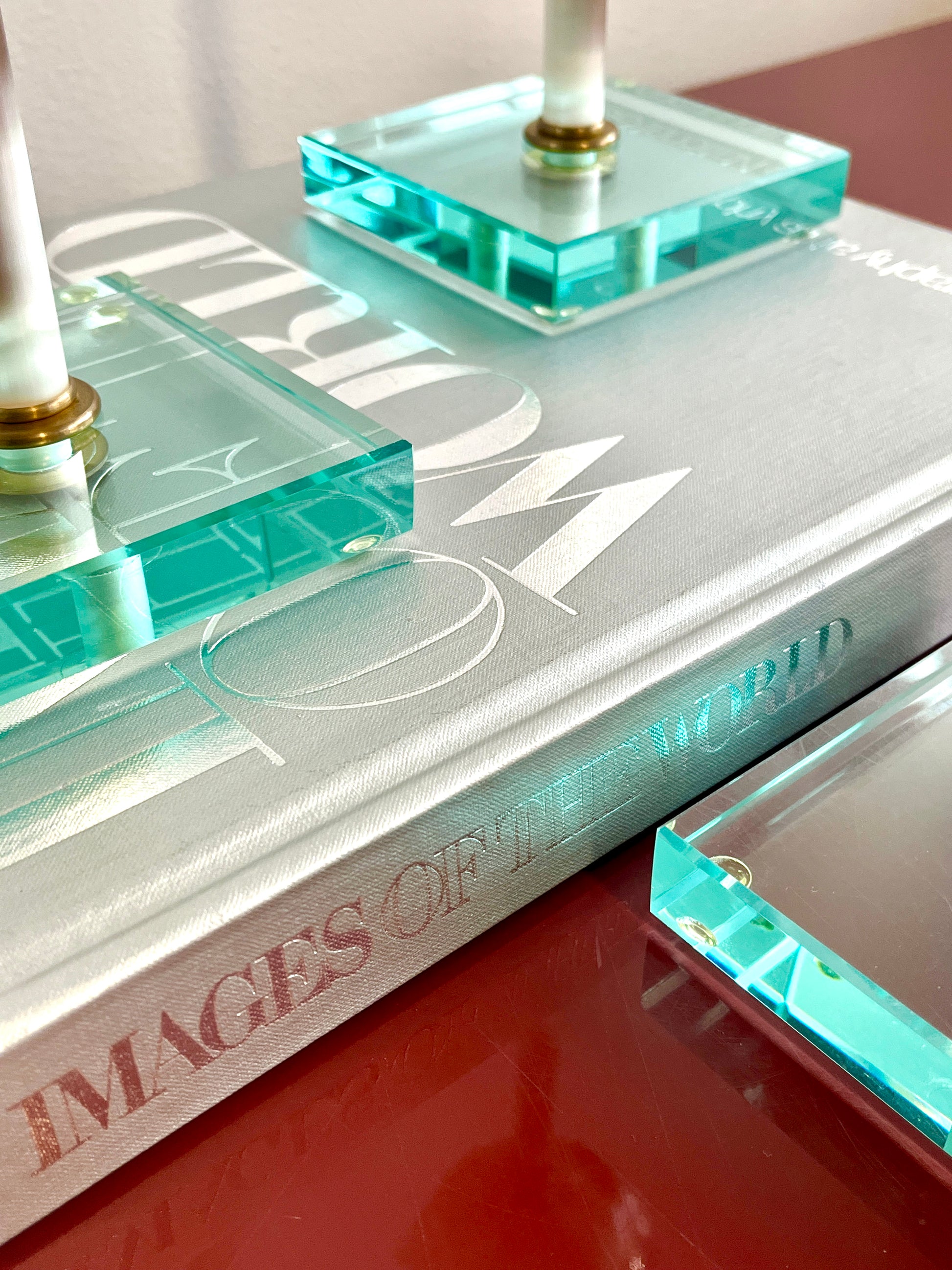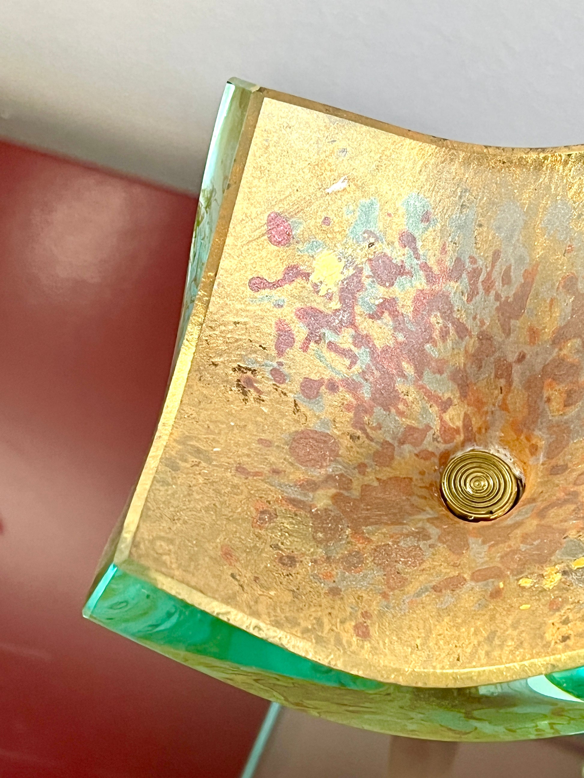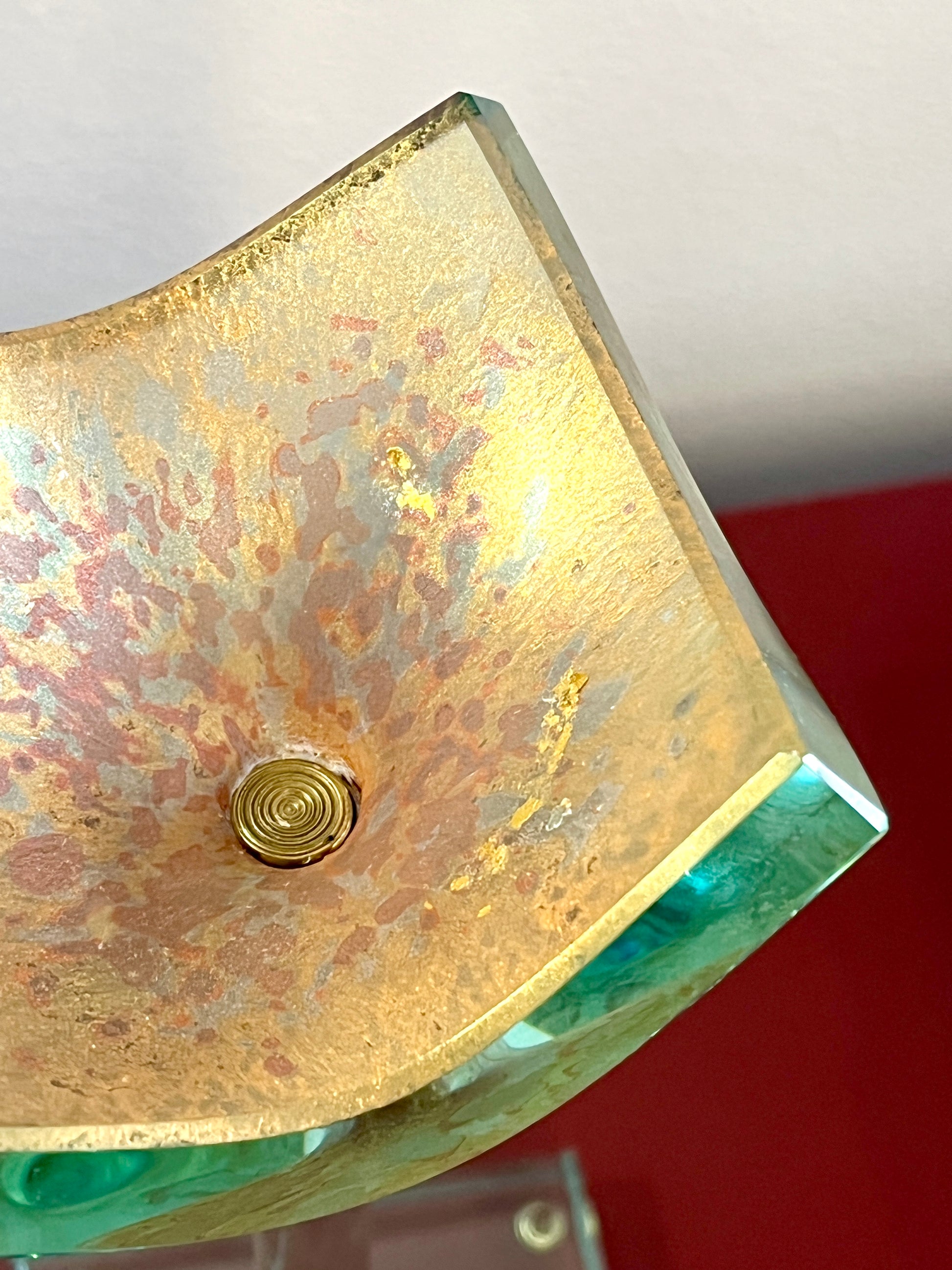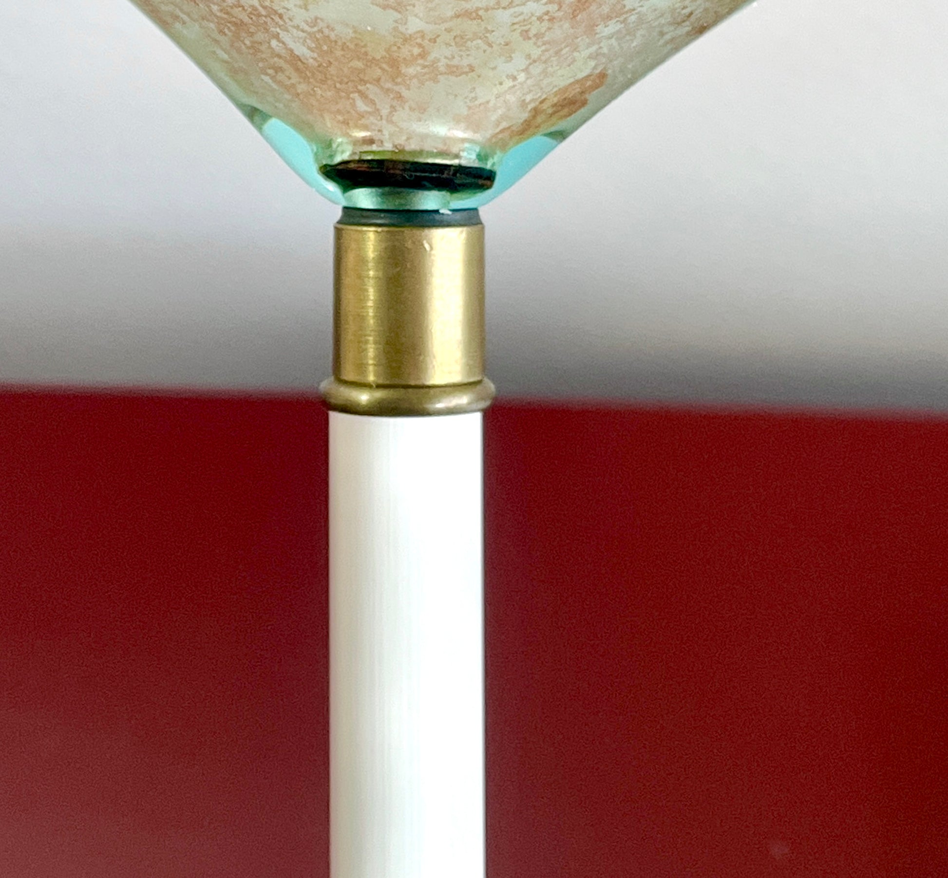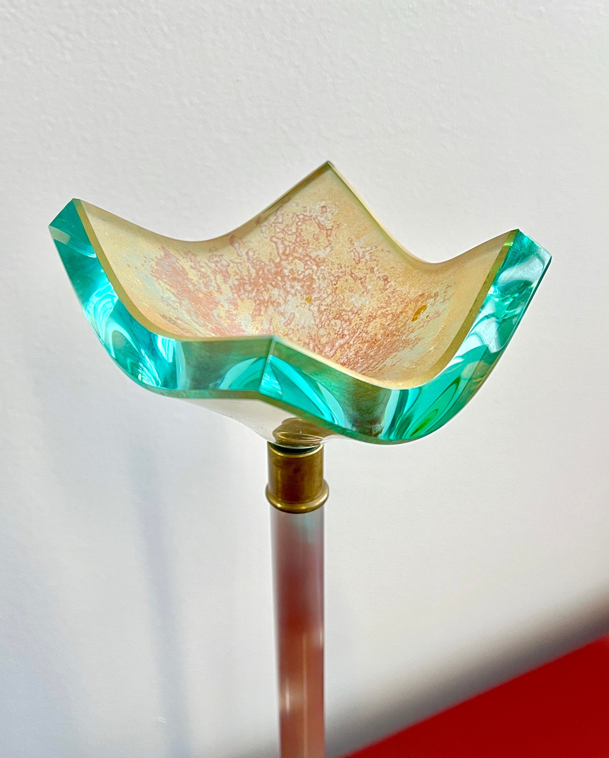 Gorgeous and rare vintage mid-century trio of art glass candlesticks by renowned potter Tony Evans. Square bases of solid blue-tinted glass. Iridescent white glass columns lead to blue-tinted glass candleholders that look like petals. The internal side of candleholders has a matte gold-bronze finish similar to the look of raku, which Evans was known for. These would be lovely with small round votives. They would also be wonderful as sculptural pieces without candles. Signed on base of one. Rubber feet on bottoms.