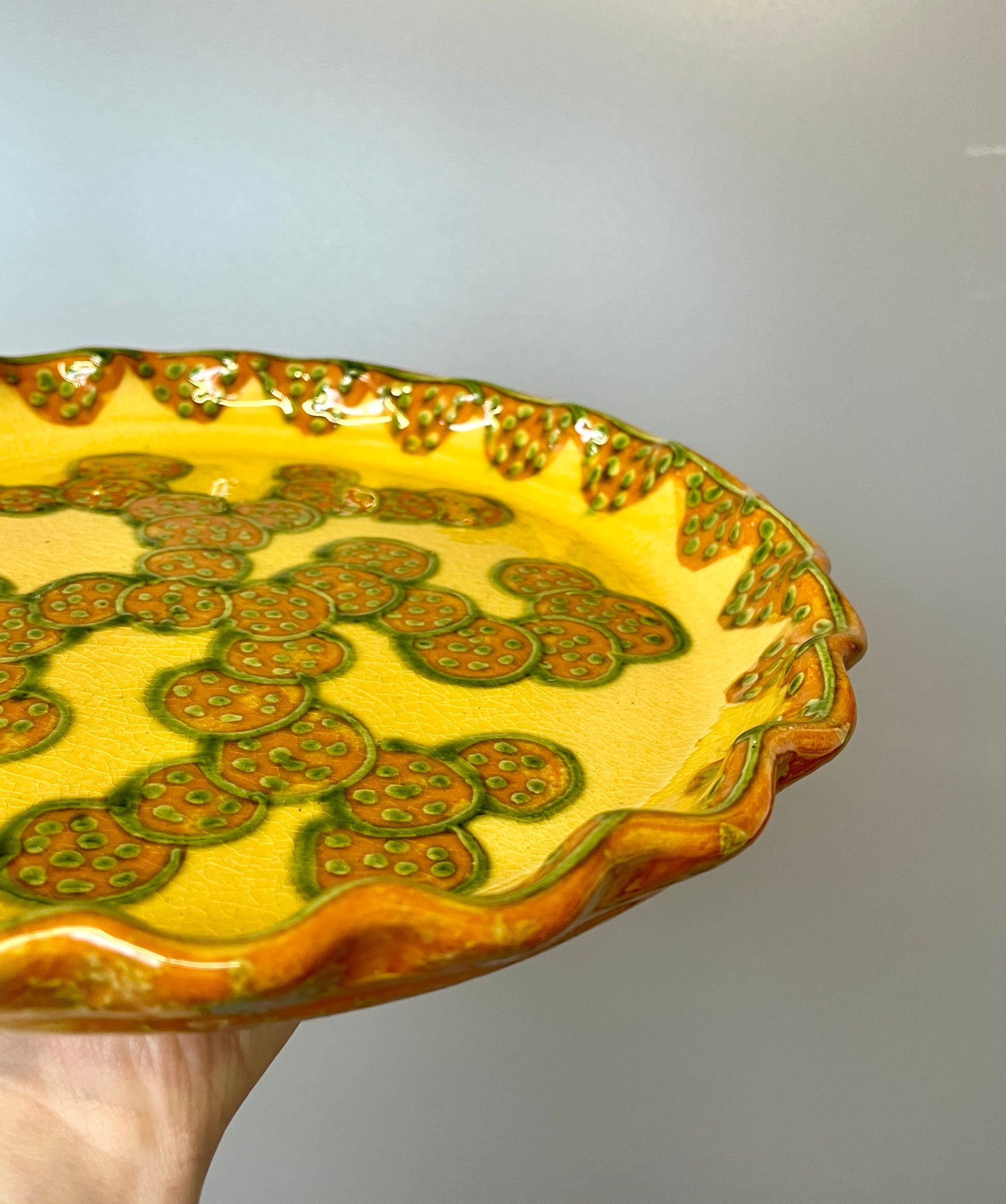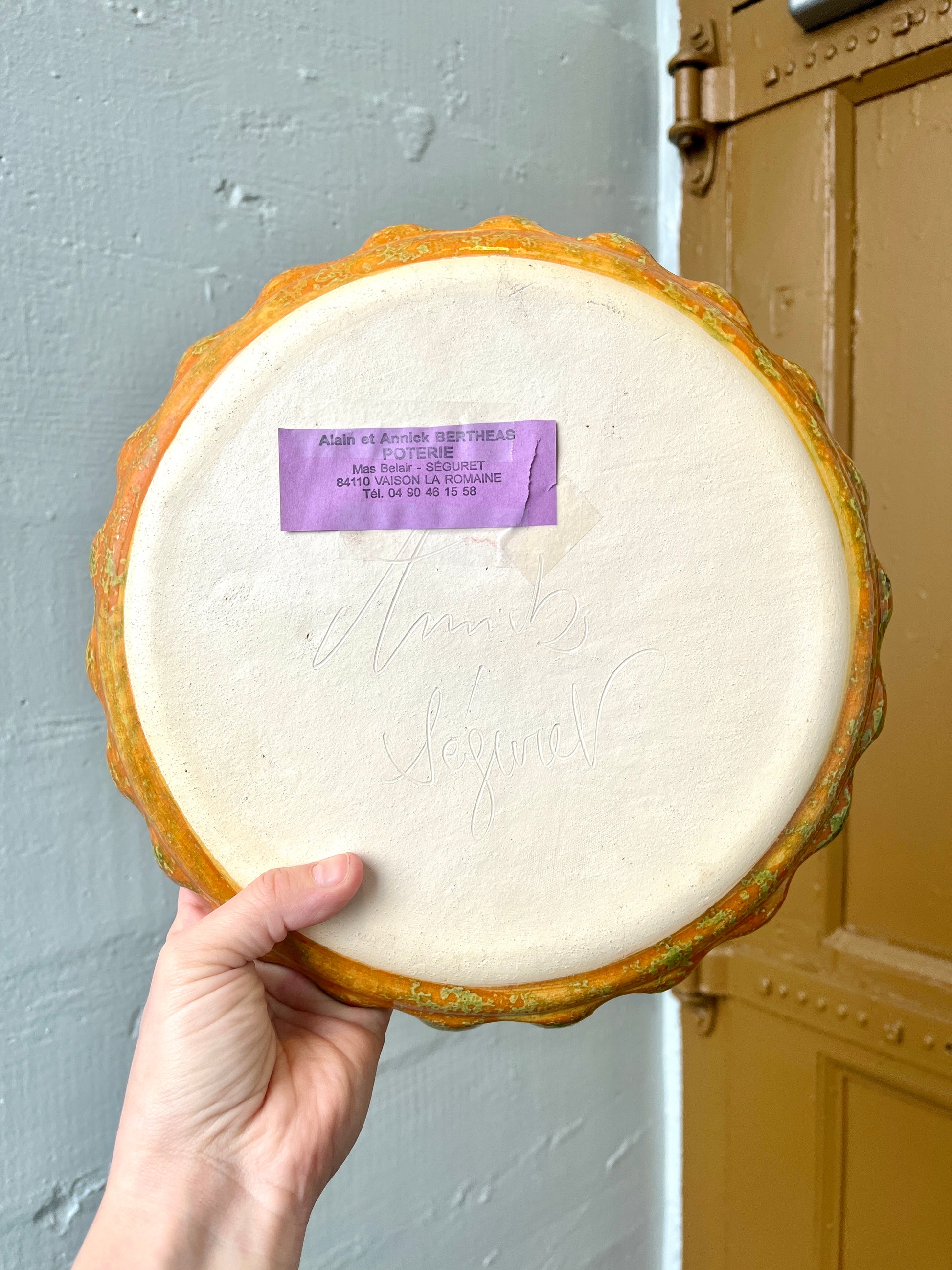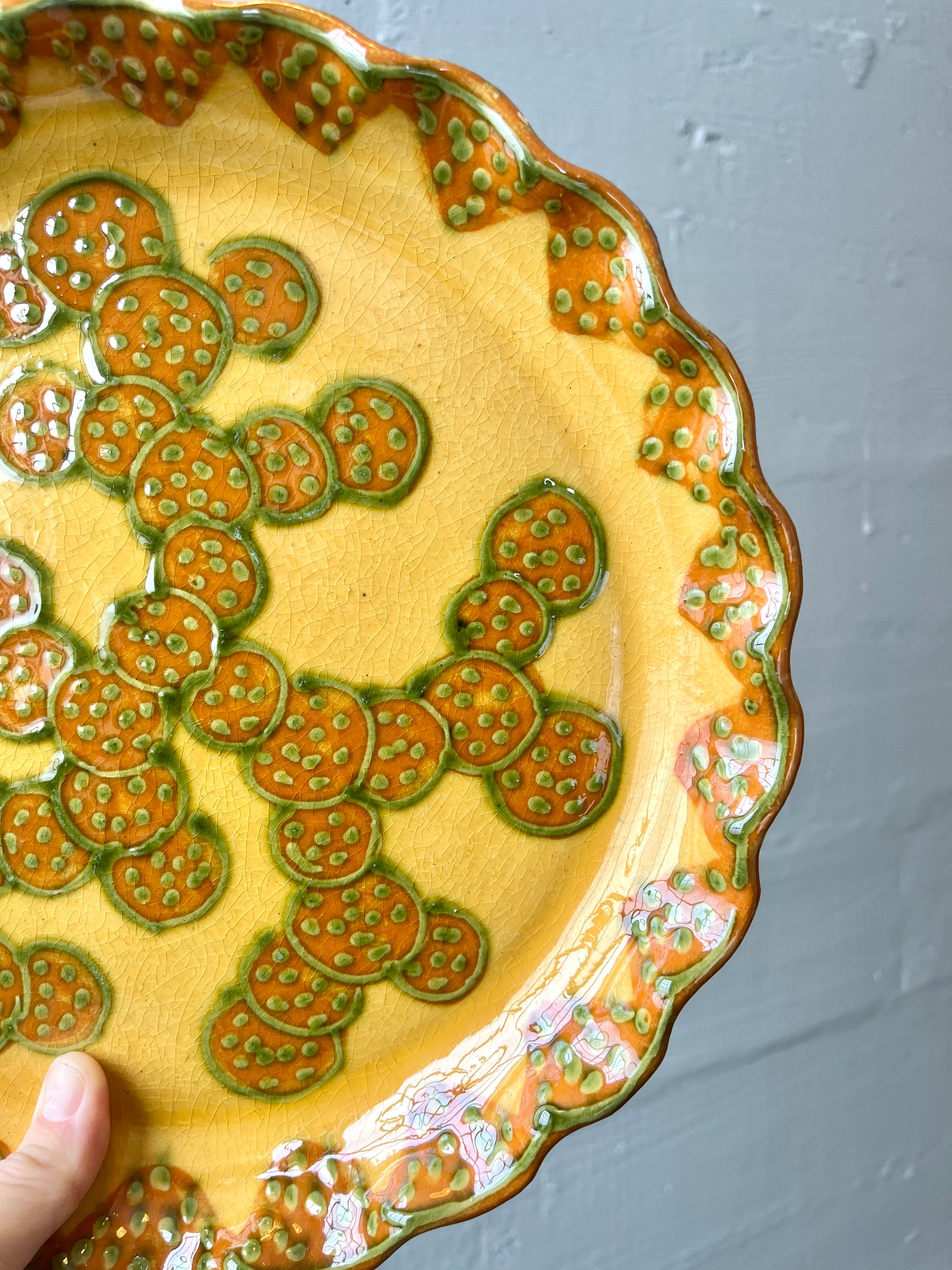 Wonderful signed French studio pottery ceramic platter by Alain and Annick Bertheas. Very unique glazing and pattern with orange, green, and ochre coloring and pattern with triangles, circles and polka dots that looks like slices of passionfruit. Scalloped edges. Signed on back with potter info still taped to piece.