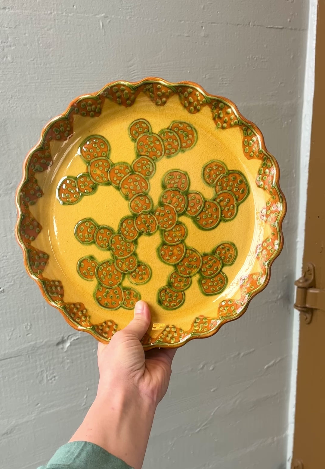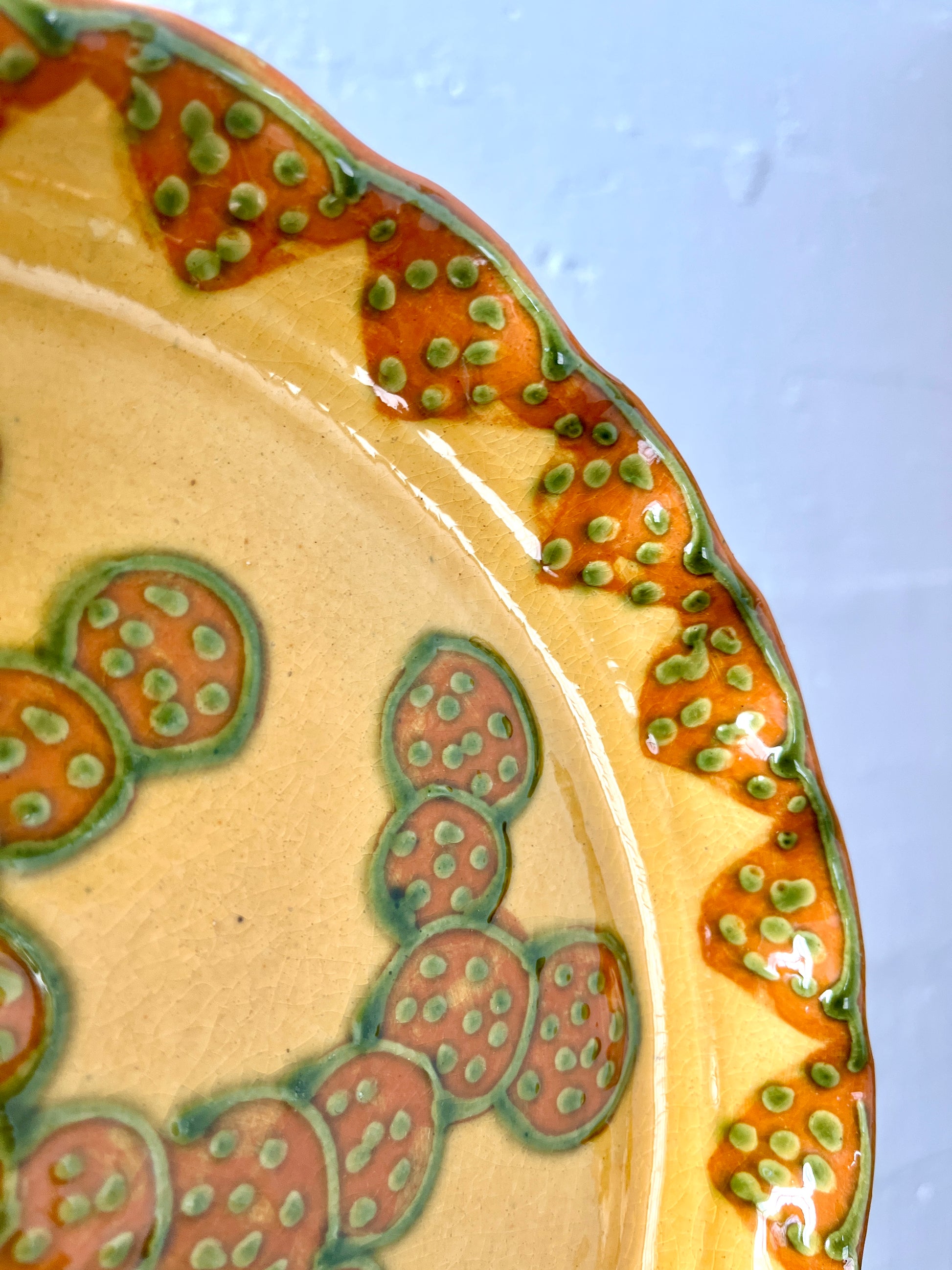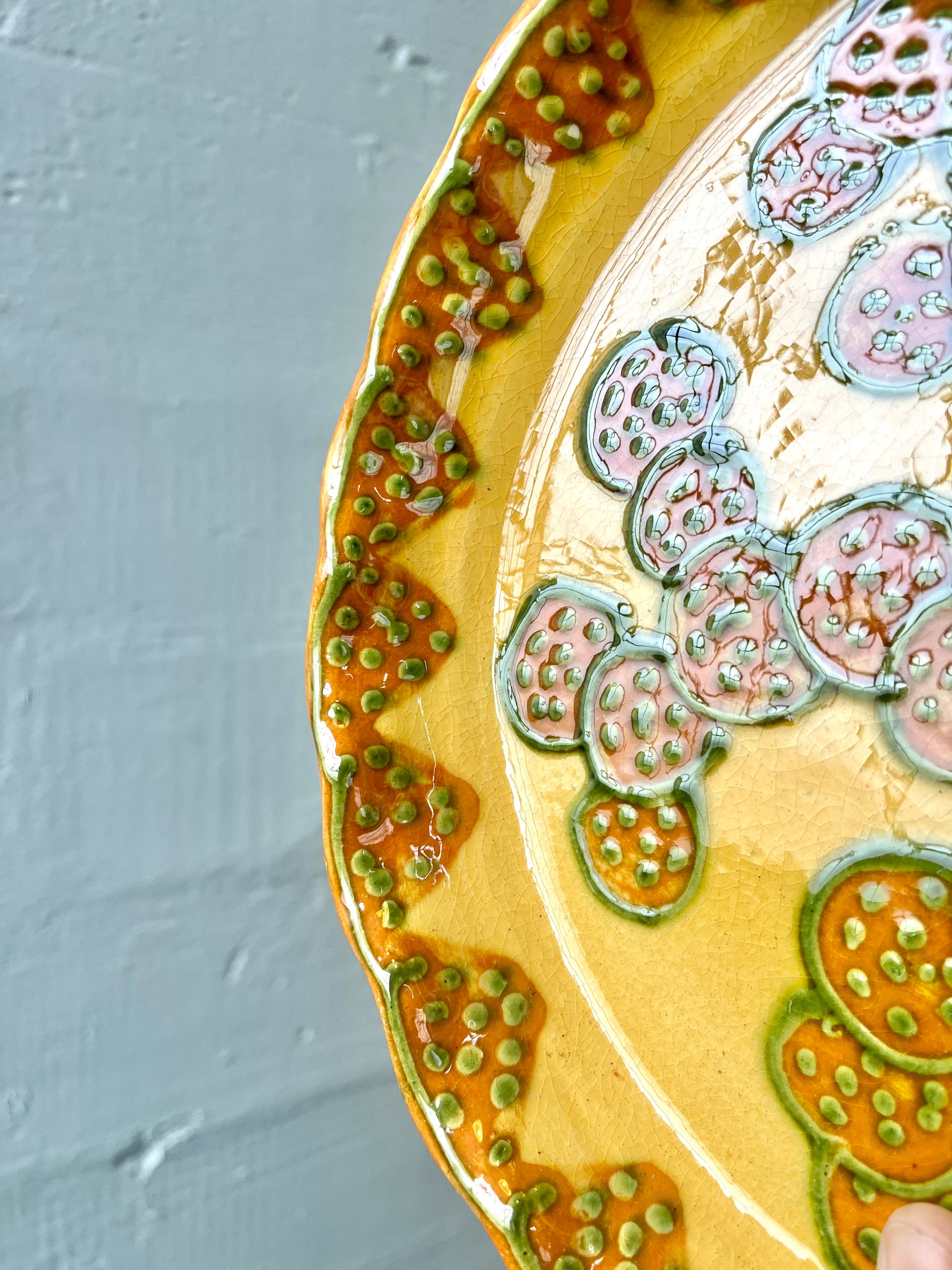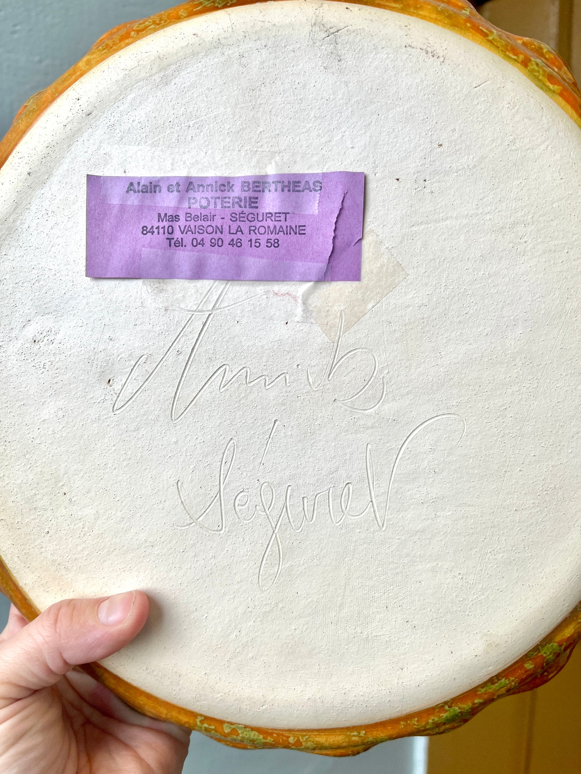 Wonderful signed French studio pottery ceramic platter by Alain and Annick Bertheas. Very unique glazing and pattern with orange, green, and ochre coloring and pattern with triangles, circles and polka dots that looks like slices of passionfruit. Scalloped edges. Signed on back with potter info still taped to piece.