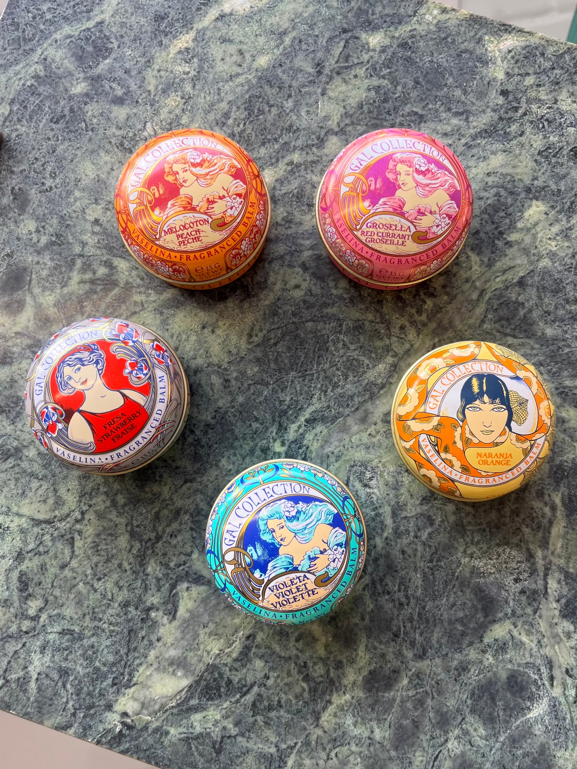 One of the best-selling Spanish cosmetics of all time, Perfumeria Gal Lip Balms have been soothing cracked, dry lips for over 100 years. Imported from Madrid, these fragrant beauty balms come housed in iconic Art Nouveau tins and are the perfect size for pockets, purses, and nightstands. Each flavor provides a gorgeous, universally flattering shine without a hint of stickiness. Have a little extra on your finger after you dip? Perfect. Show your cuticles some love!