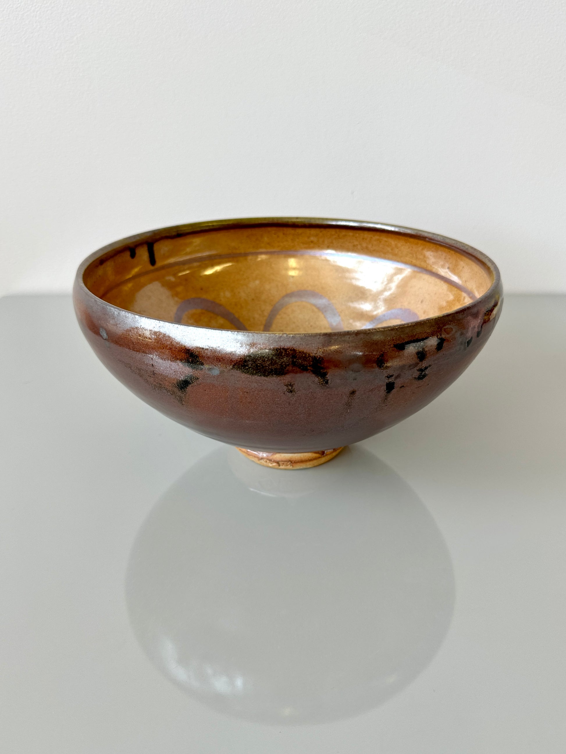 Beautiful large vintage studio pottery footed serving bowl. Wonderful glossy metallic luster, possibly raku. Stamped with maker's marks.