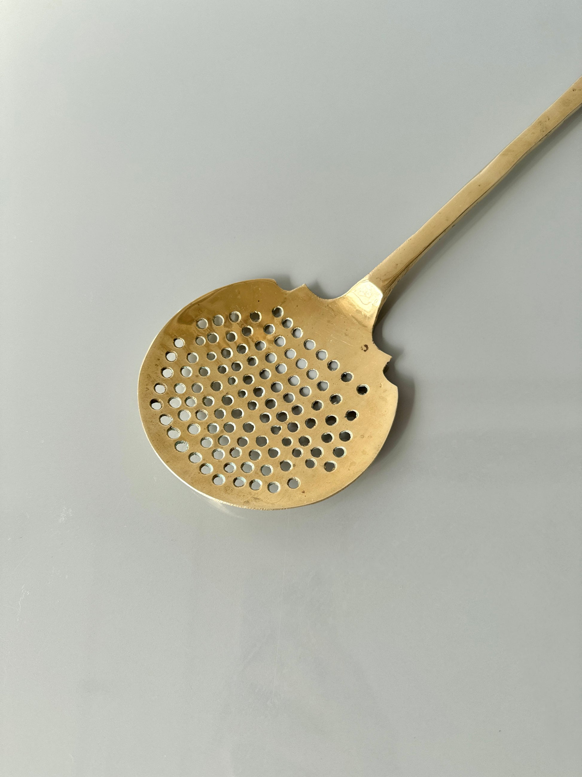 Large vintage slotted brass spoon. Use in the kitchen or hang on the wall from hanging hole at end of spoon.