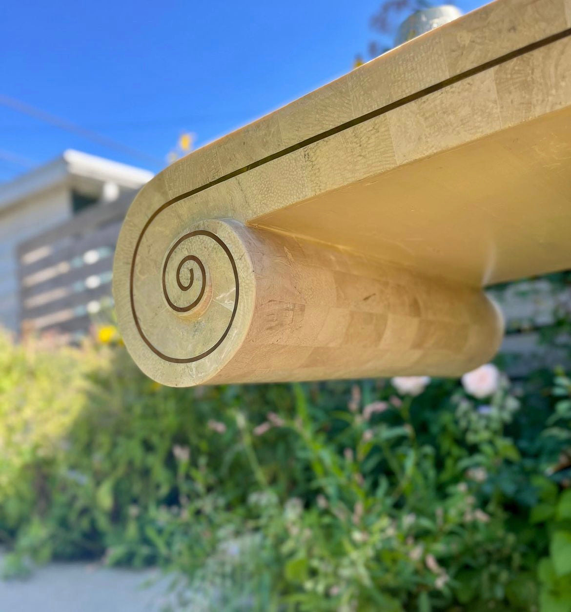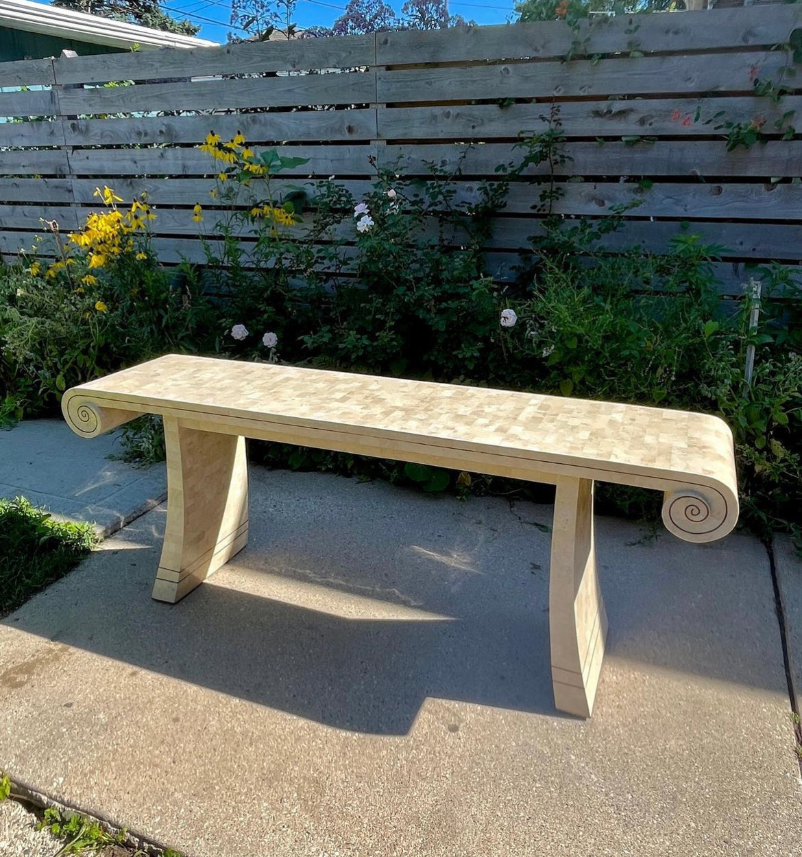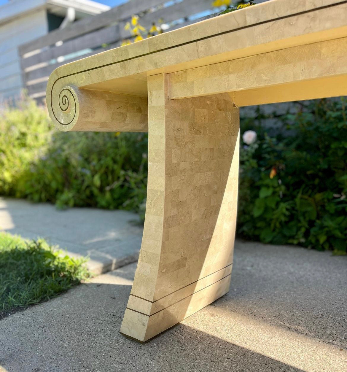 Wonderful vintage Maitland Smith scroll style tessellated stone console with brass inlay. Stone is shiny with beautiful luster. All brass inlay intact with lovely patina. Beautiful piece with Maitland Smith plaque still affixed.