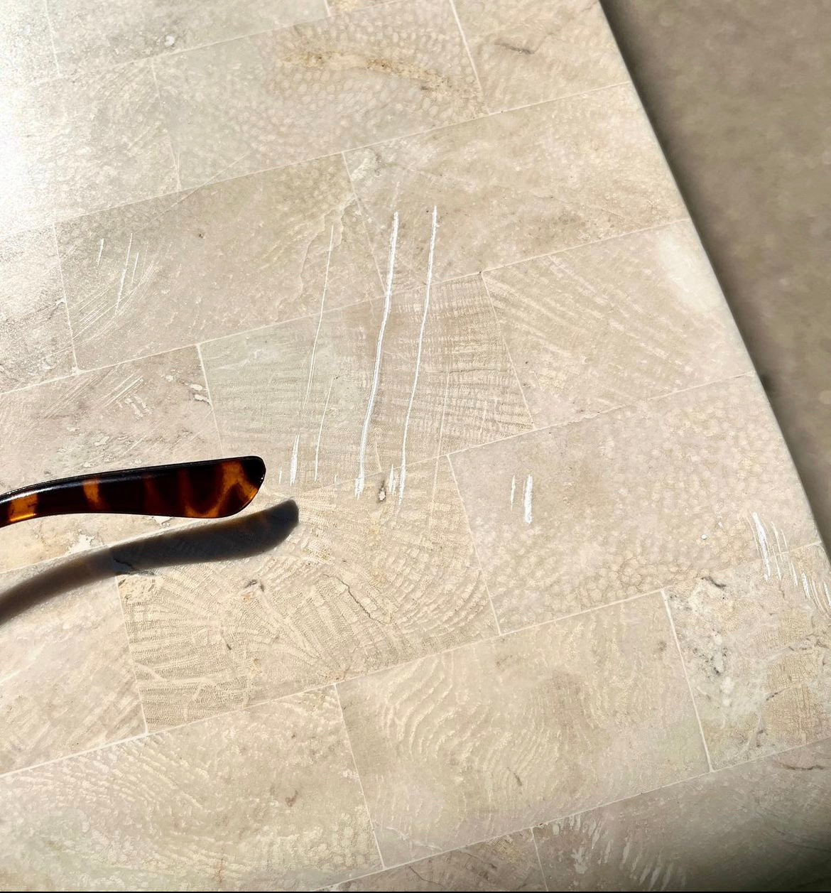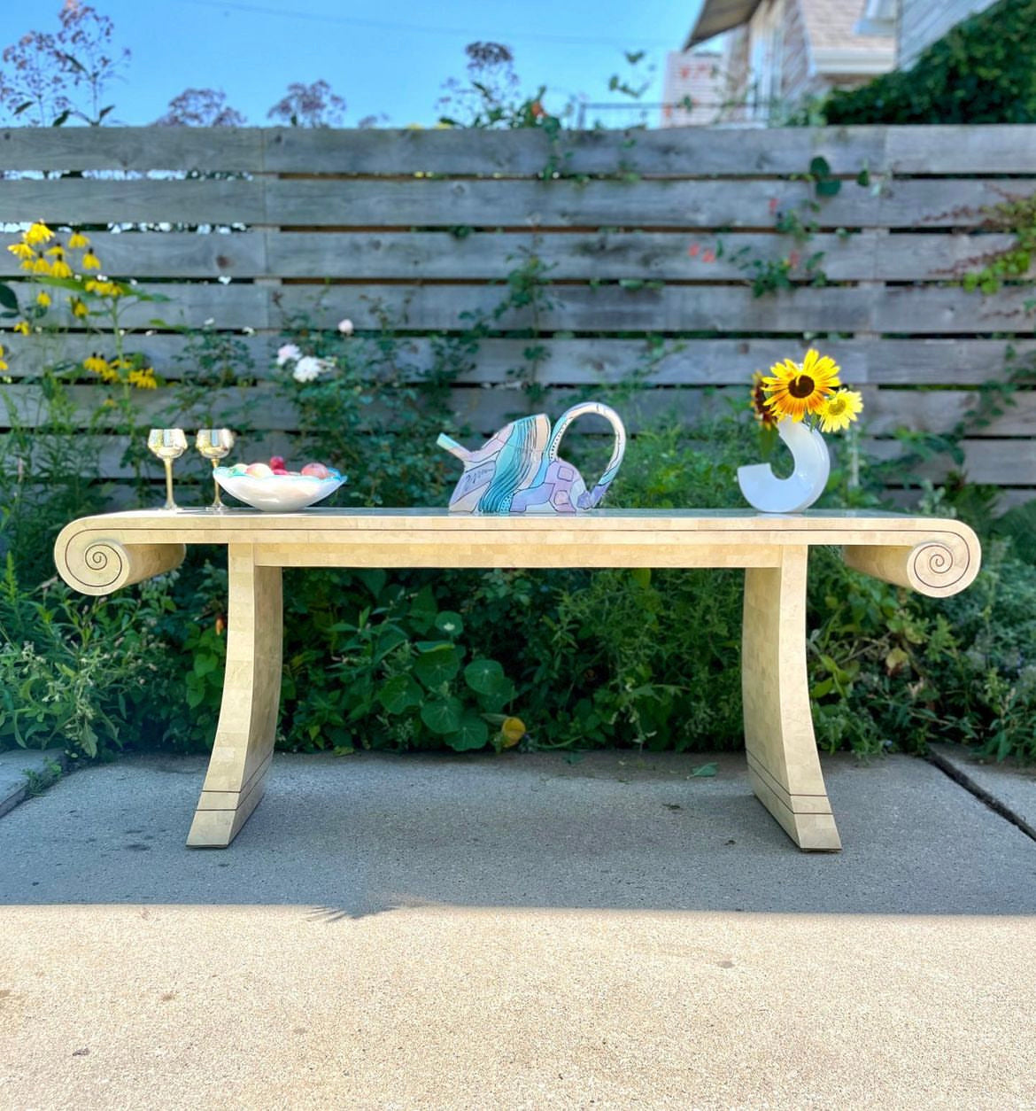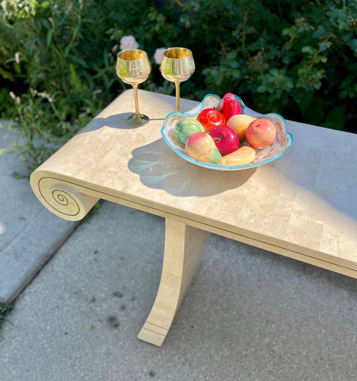 Wonderful vintage Maitland Smith scroll style tessellated stone console with brass inlay. Stone is shiny with beautiful luster. All brass inlay intact with lovely patina. Beautiful piece with Maitland Smith plaque still affixed.