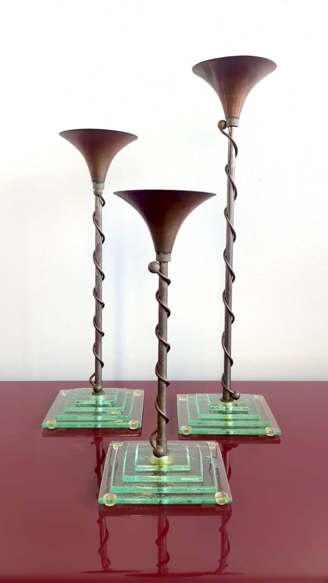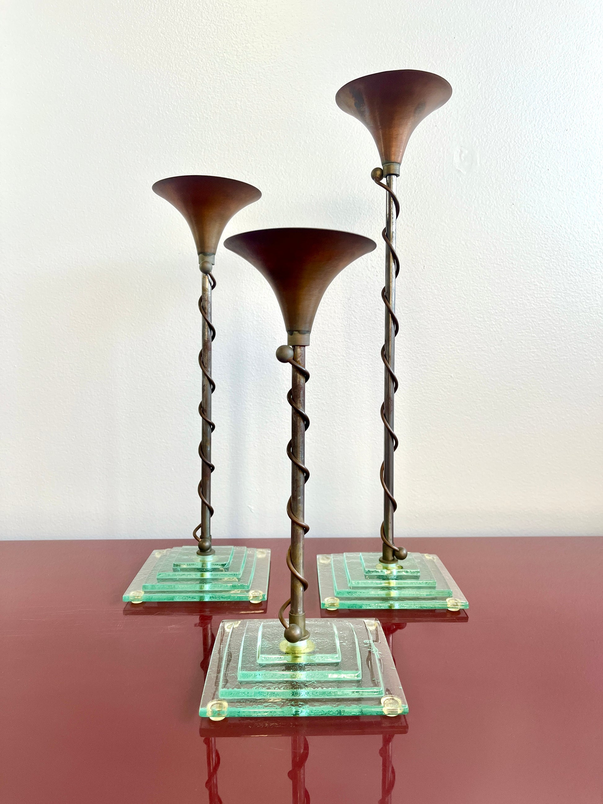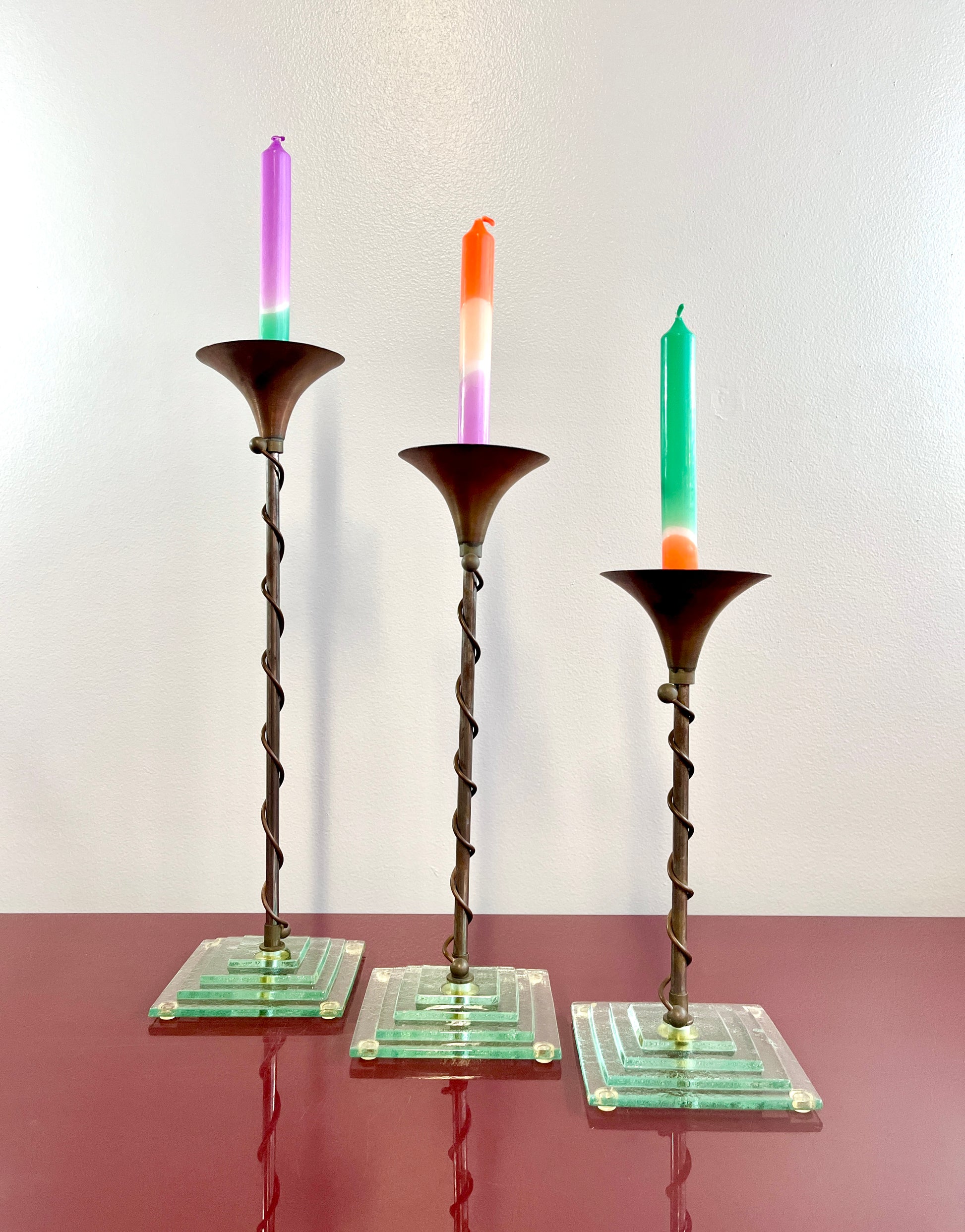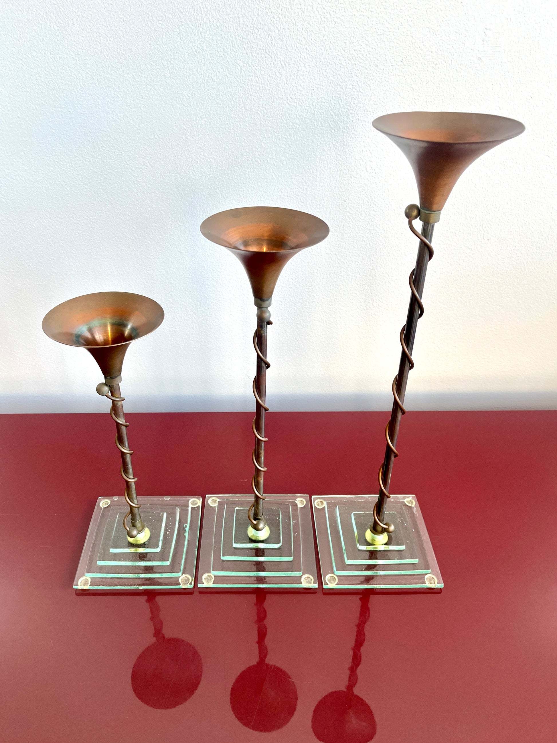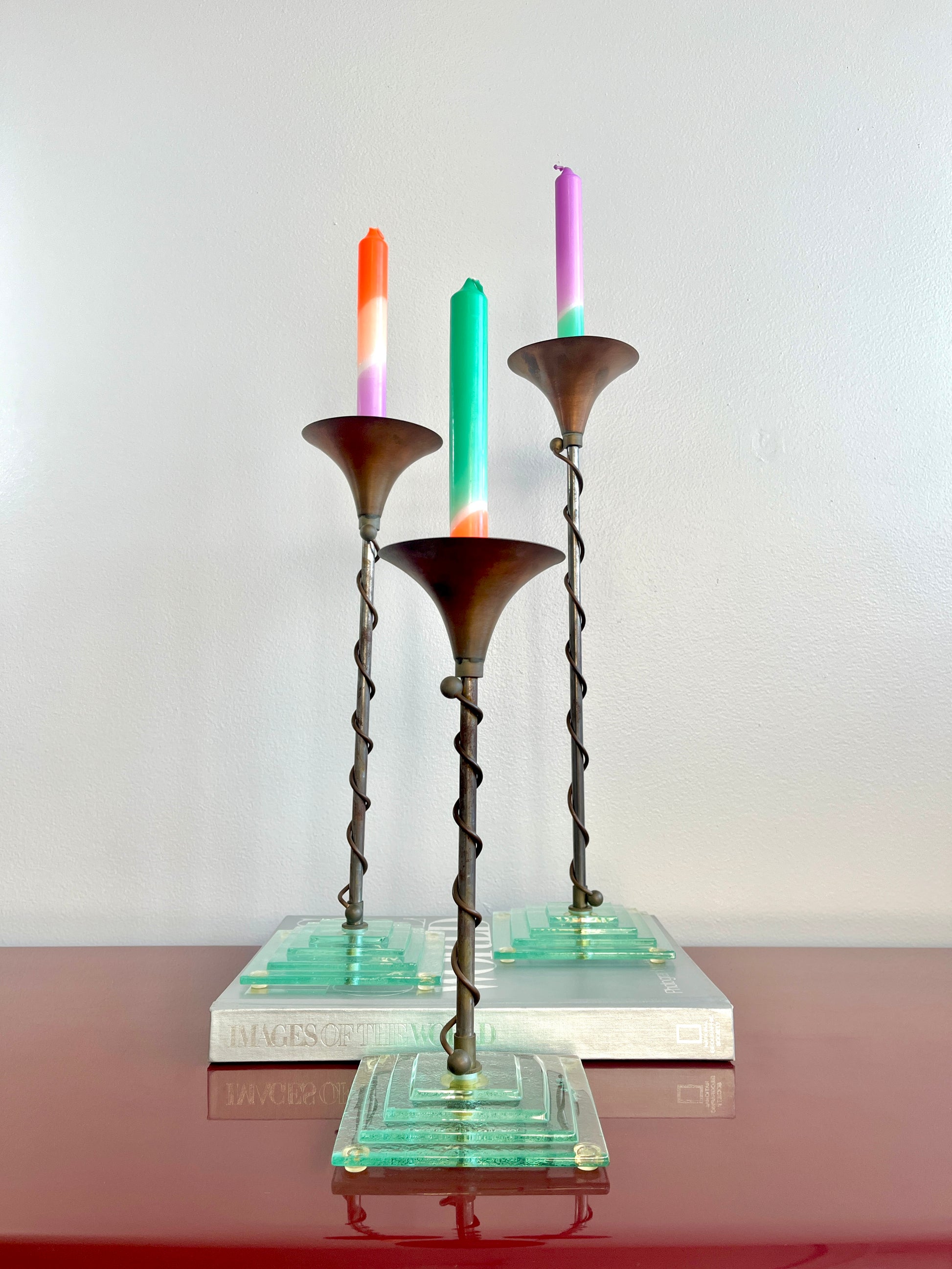 Wonderful set of artist-made mixed metal and fused glass candlesticks. Stacked blue-tinted glass base with patinated silver-toned metal pole candlestick. Copper-toned metalwork winds it’s way up each with ball at ends. Candleholder is copper-toned metal with trumpet-like shape. Holds standard tapers. Sold as set of three.