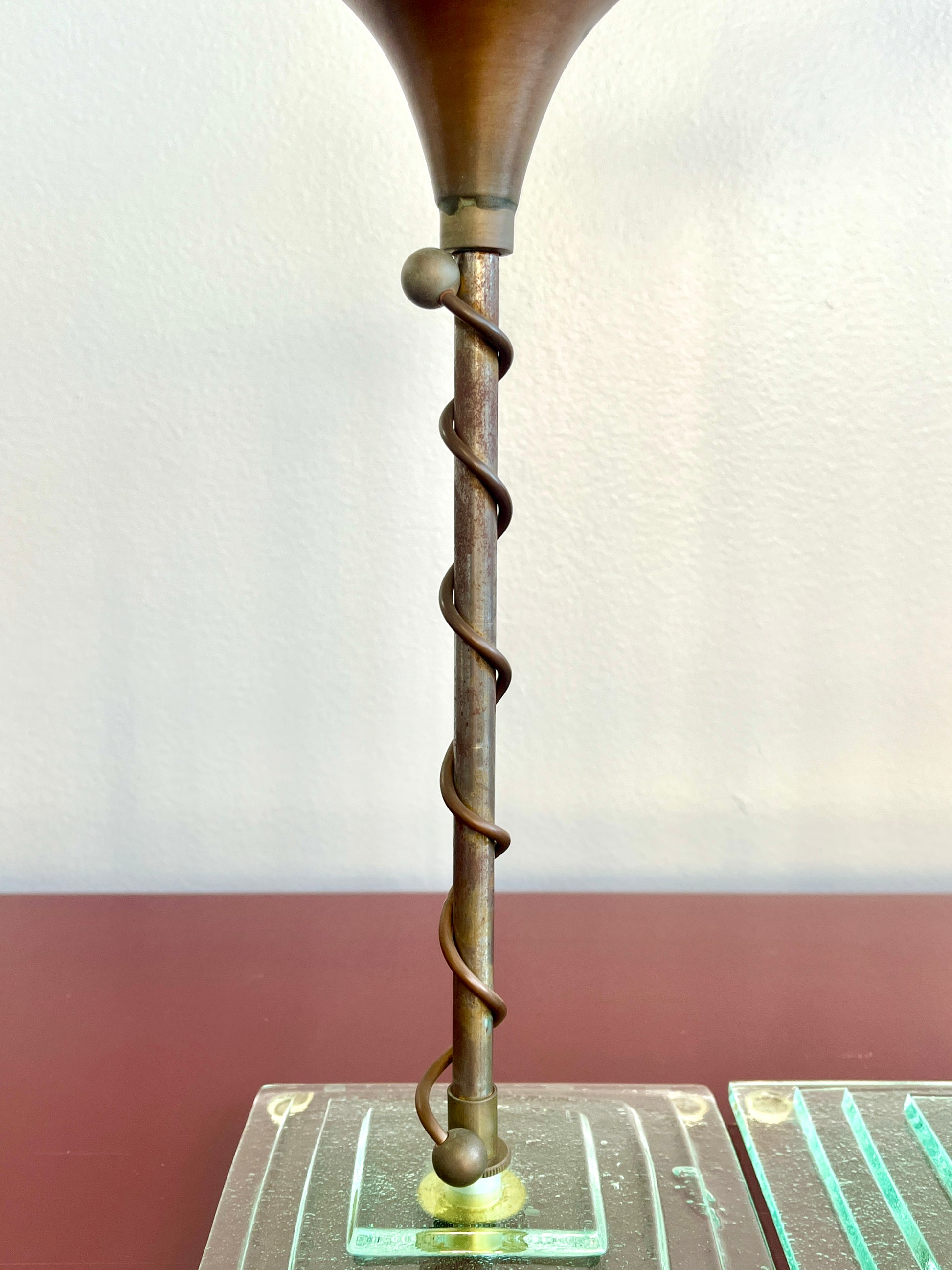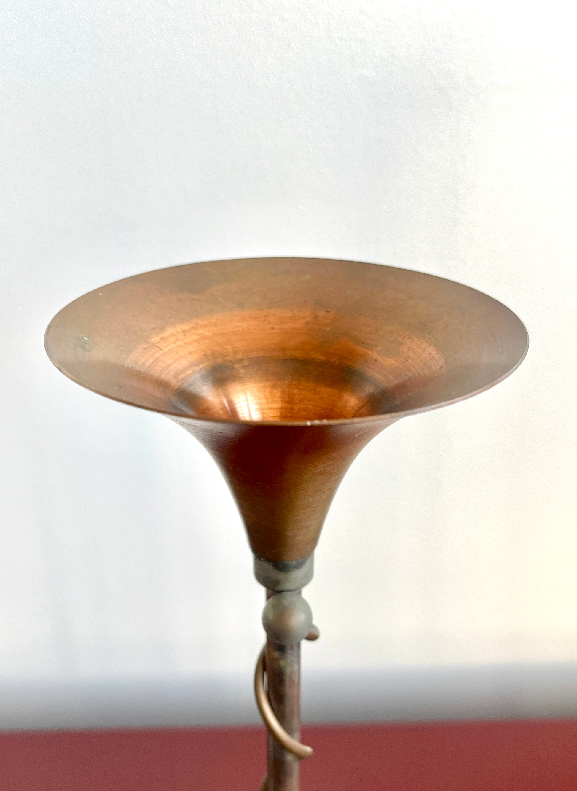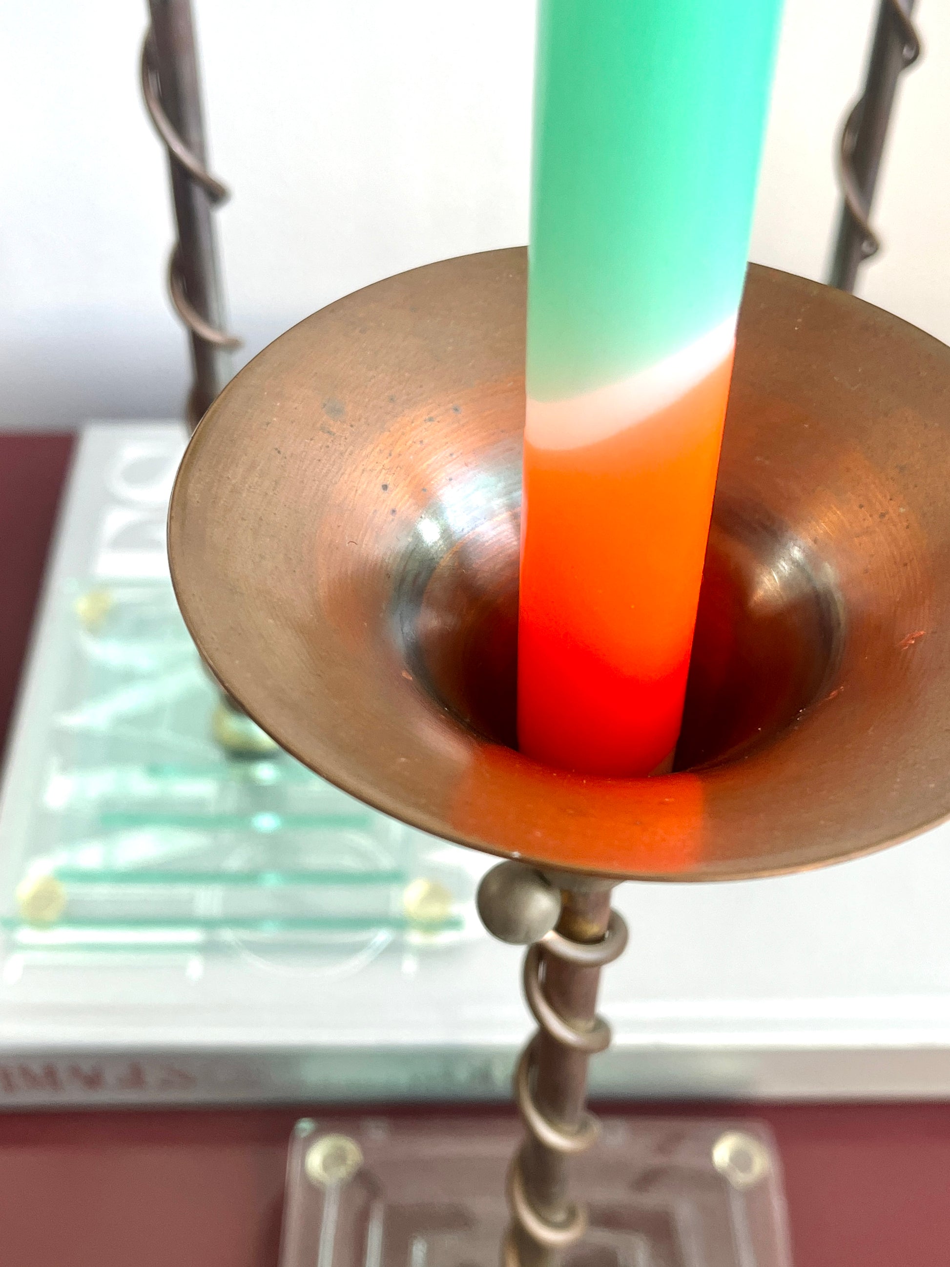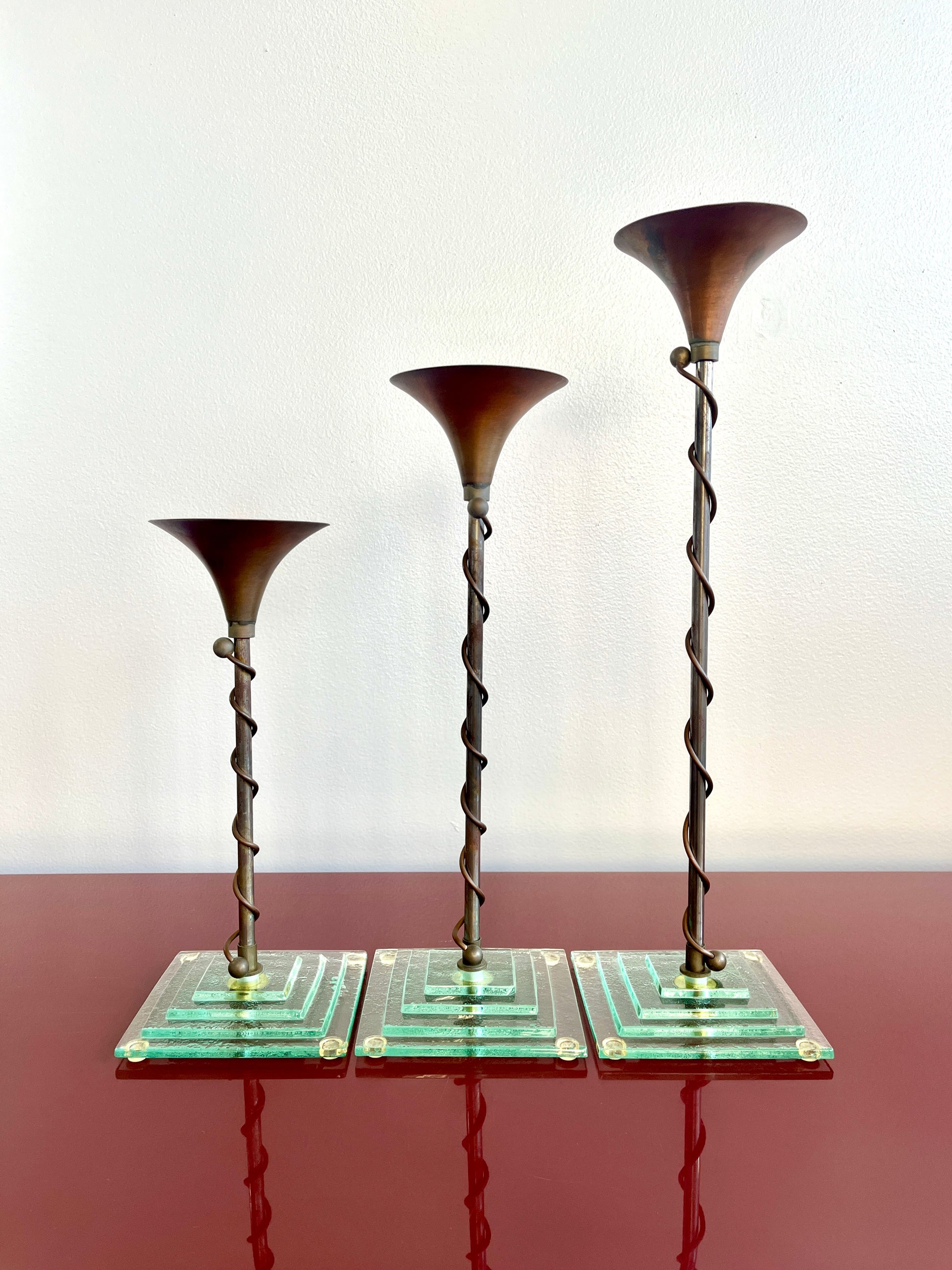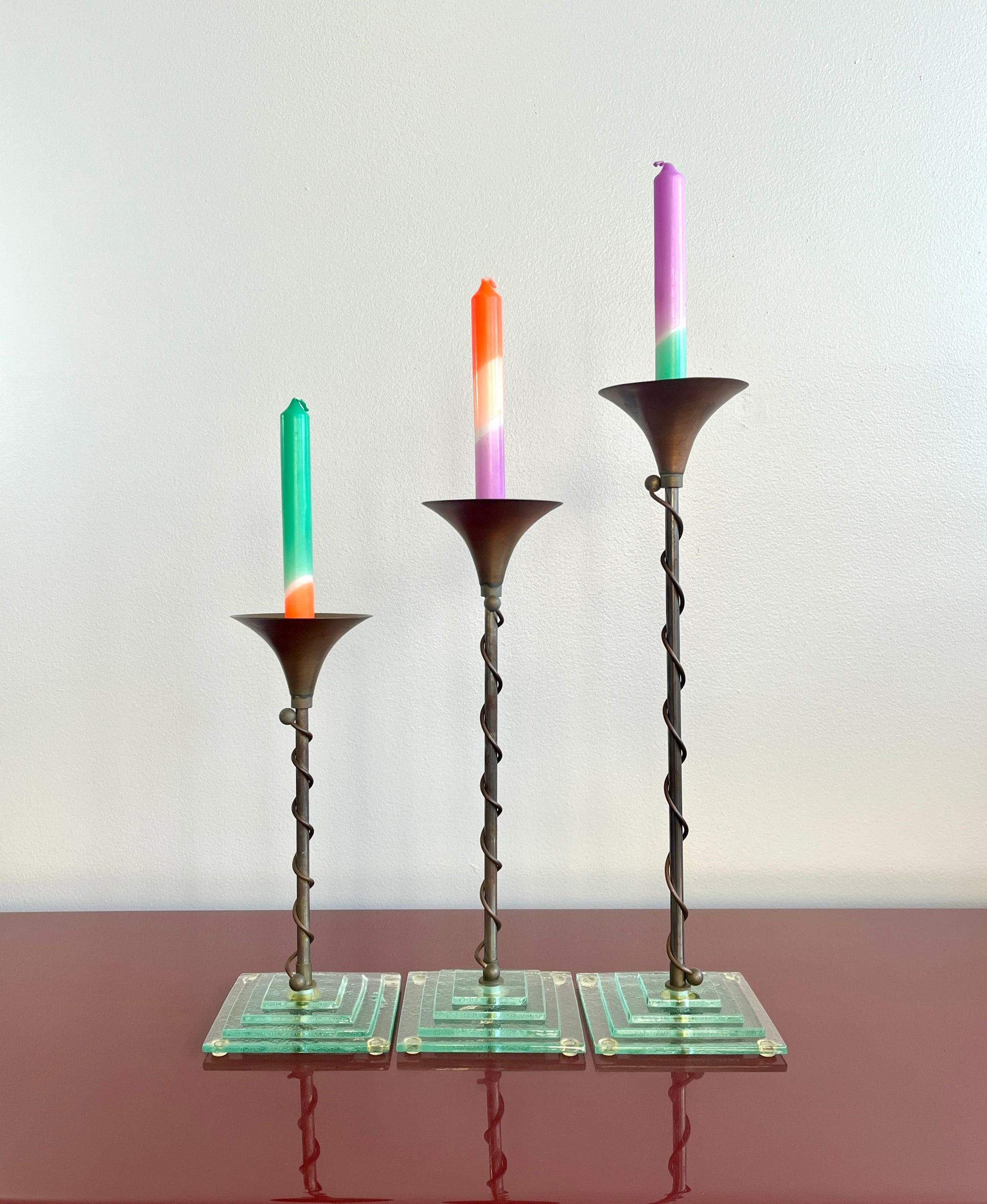 Wonderful set of artist-made mixed metal and fused glass candlesticks. Stacked blue-tinted glass base with patinated silver-toned metal pole candlestick. Copper-toned metalwork winds it’s way up each with ball at ends. Candleholder is copper-toned metal with trumpet-like shape. Holds standard tapers. Sold as set of three.