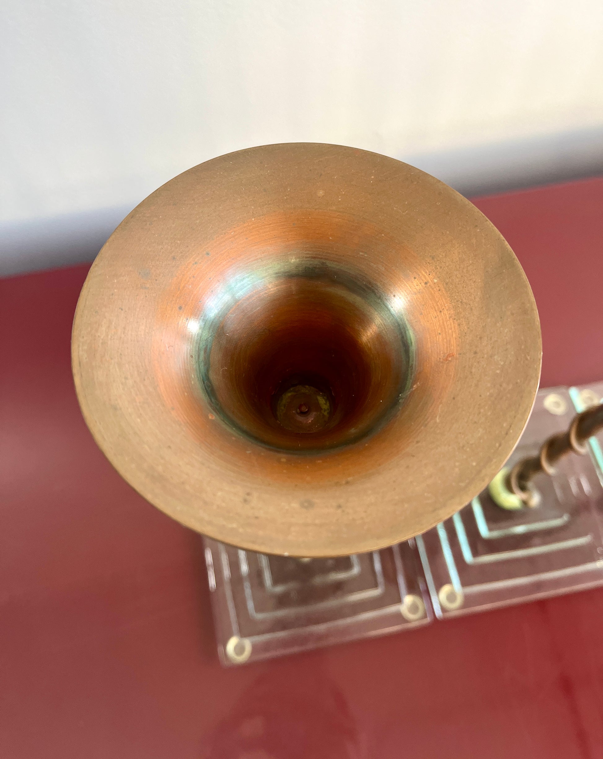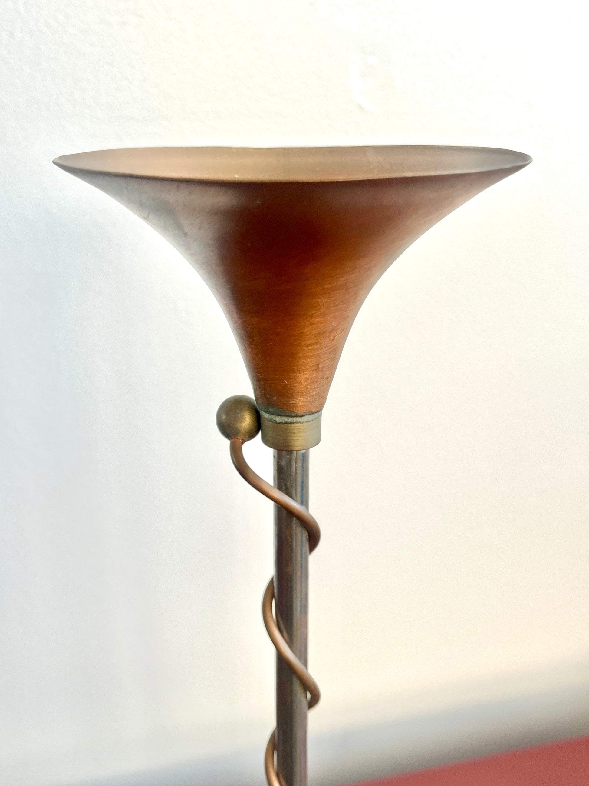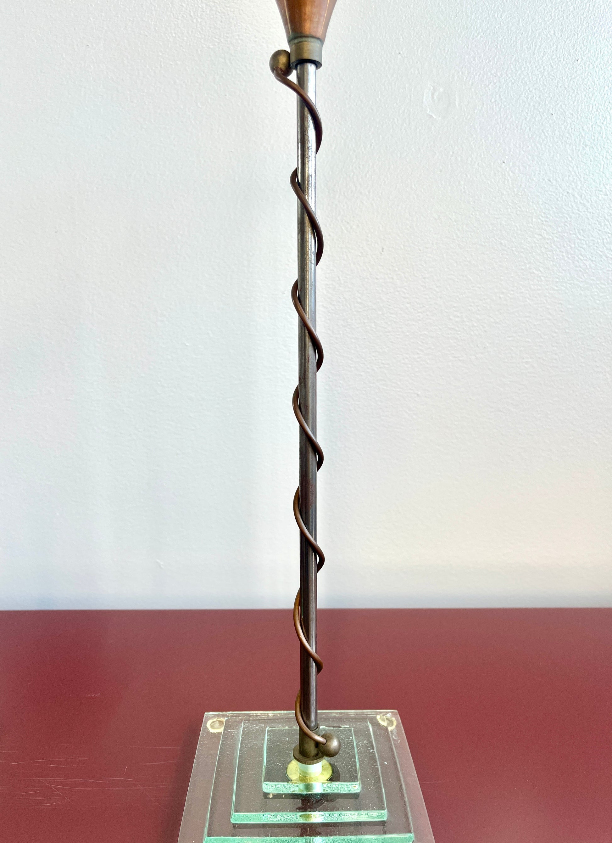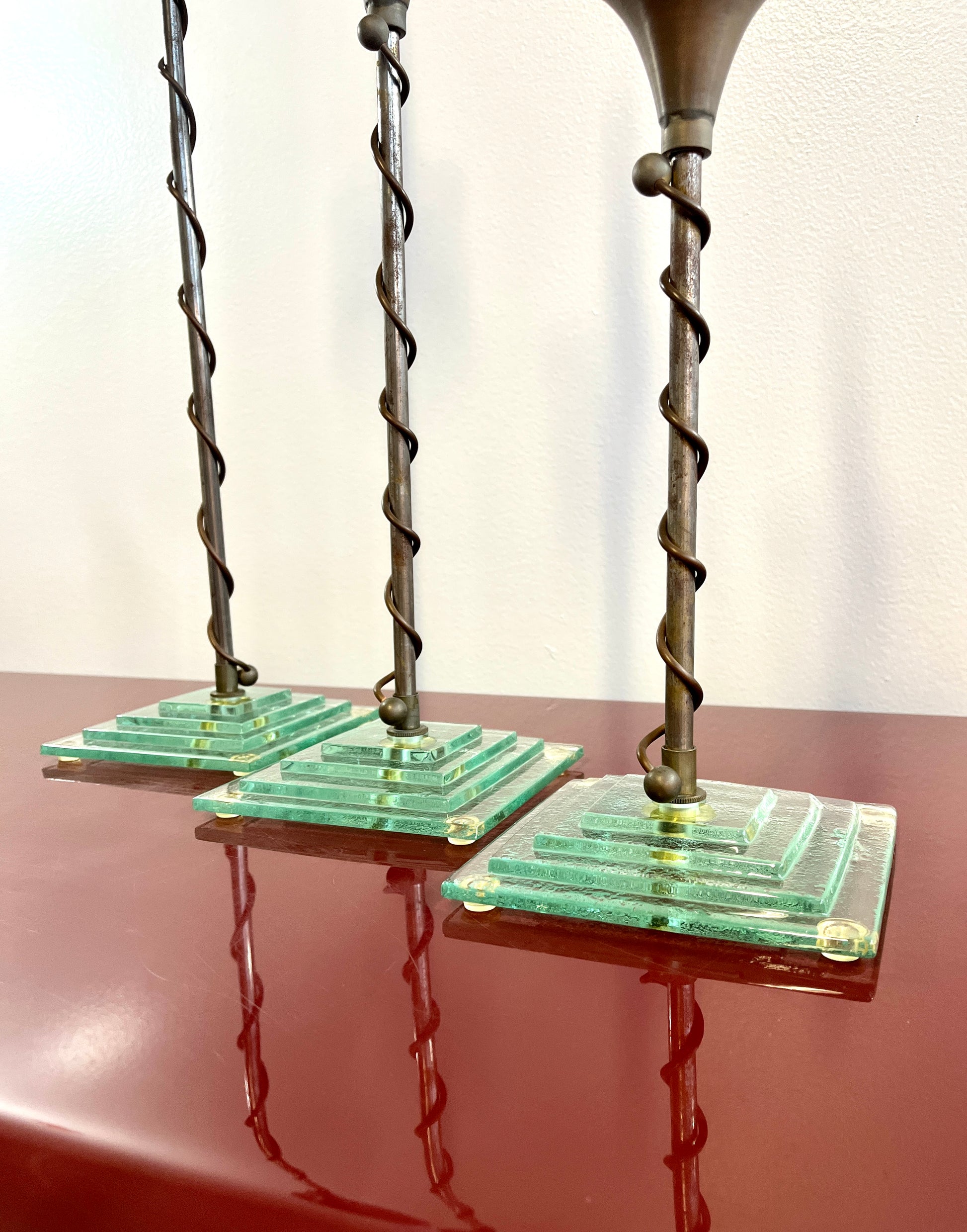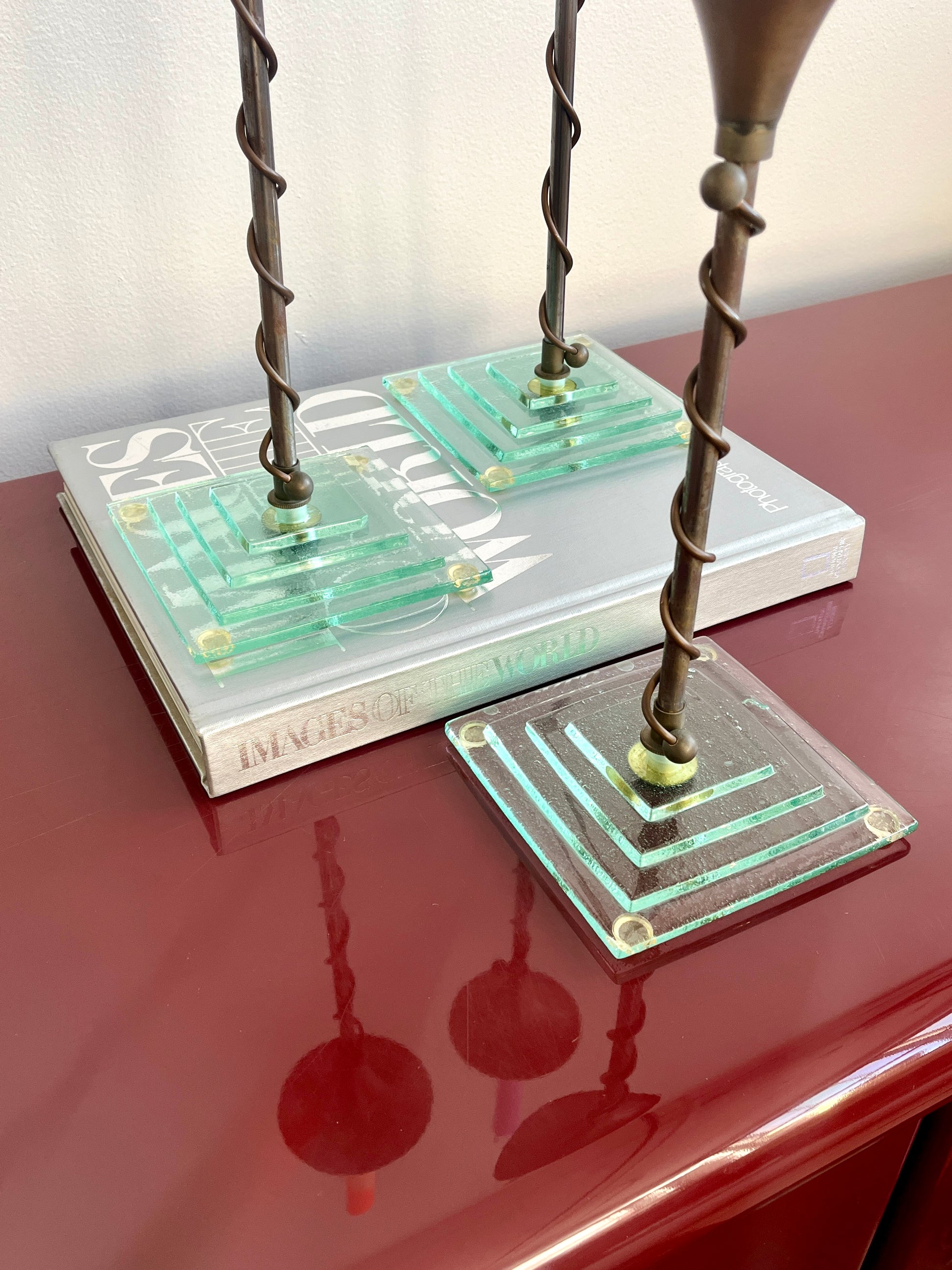 Wonderful set of artist-made mixed metal and fused glass candlesticks. Stacked blue-tinted glass base with patinated silver-toned metal pole candlestick. Copper-toned metalwork winds it’s way up each with ball at ends. Candleholder is copper-toned metal with trumpet-like shape. Holds standard tapers. Sold as set of three.
