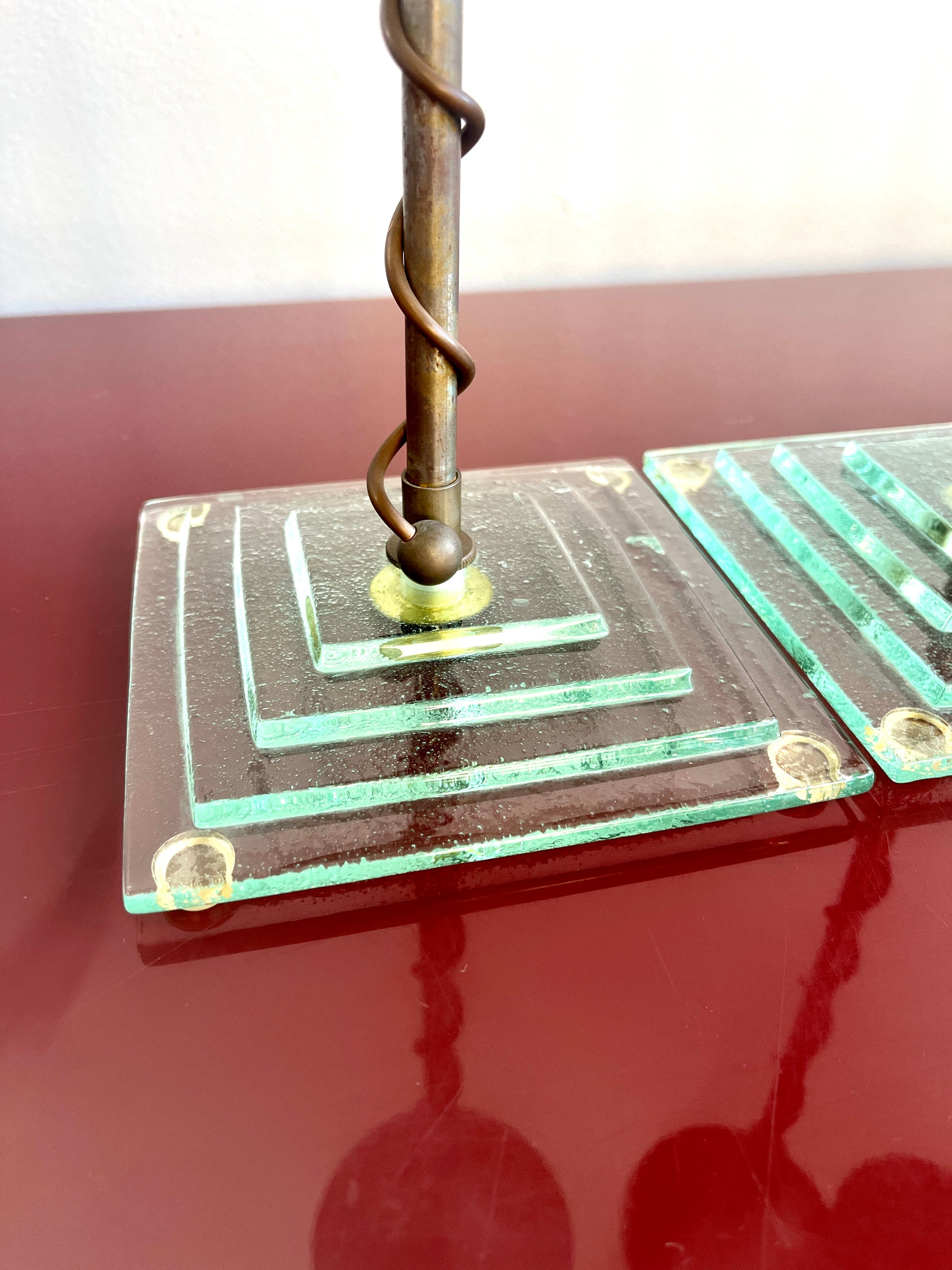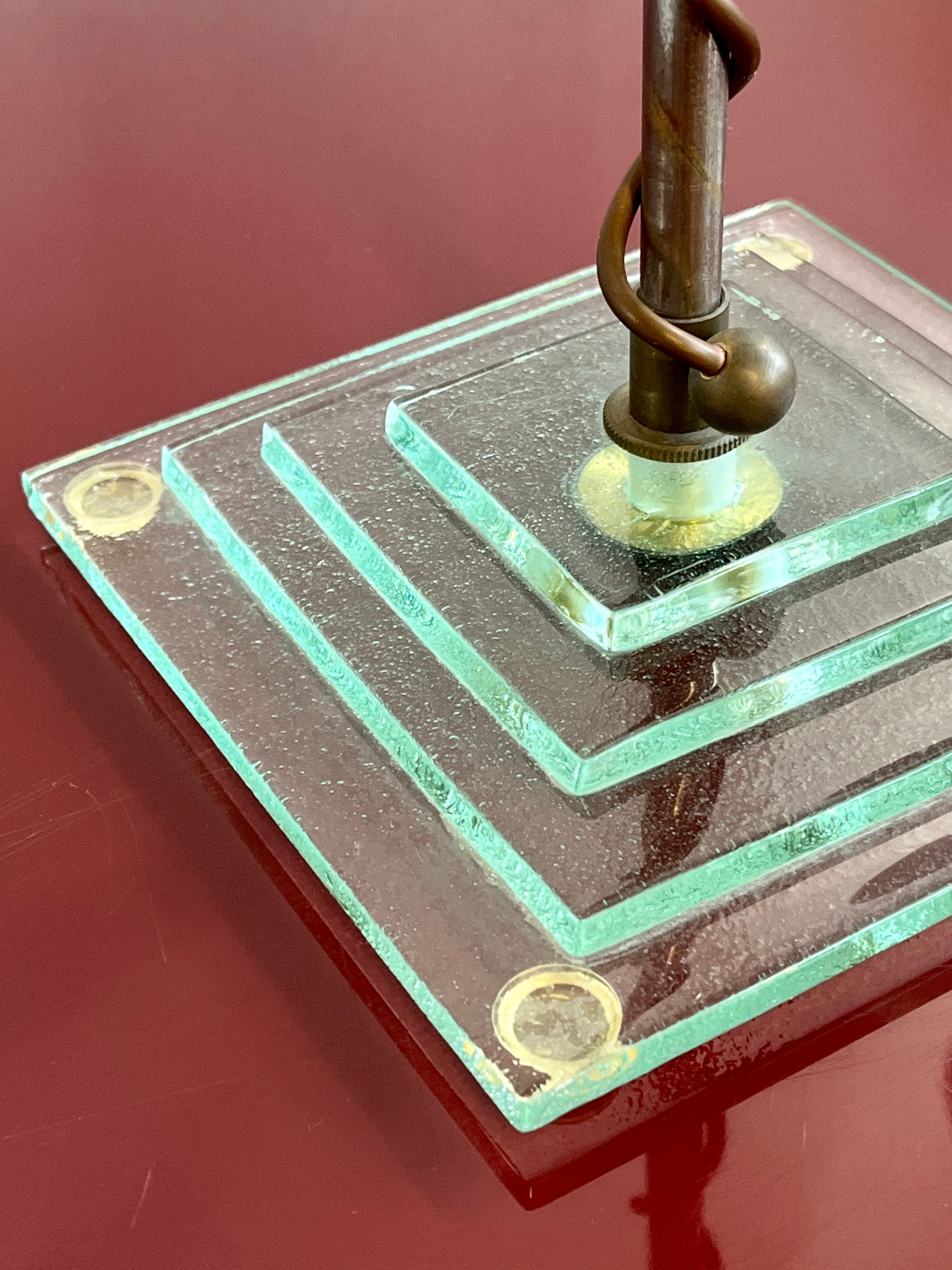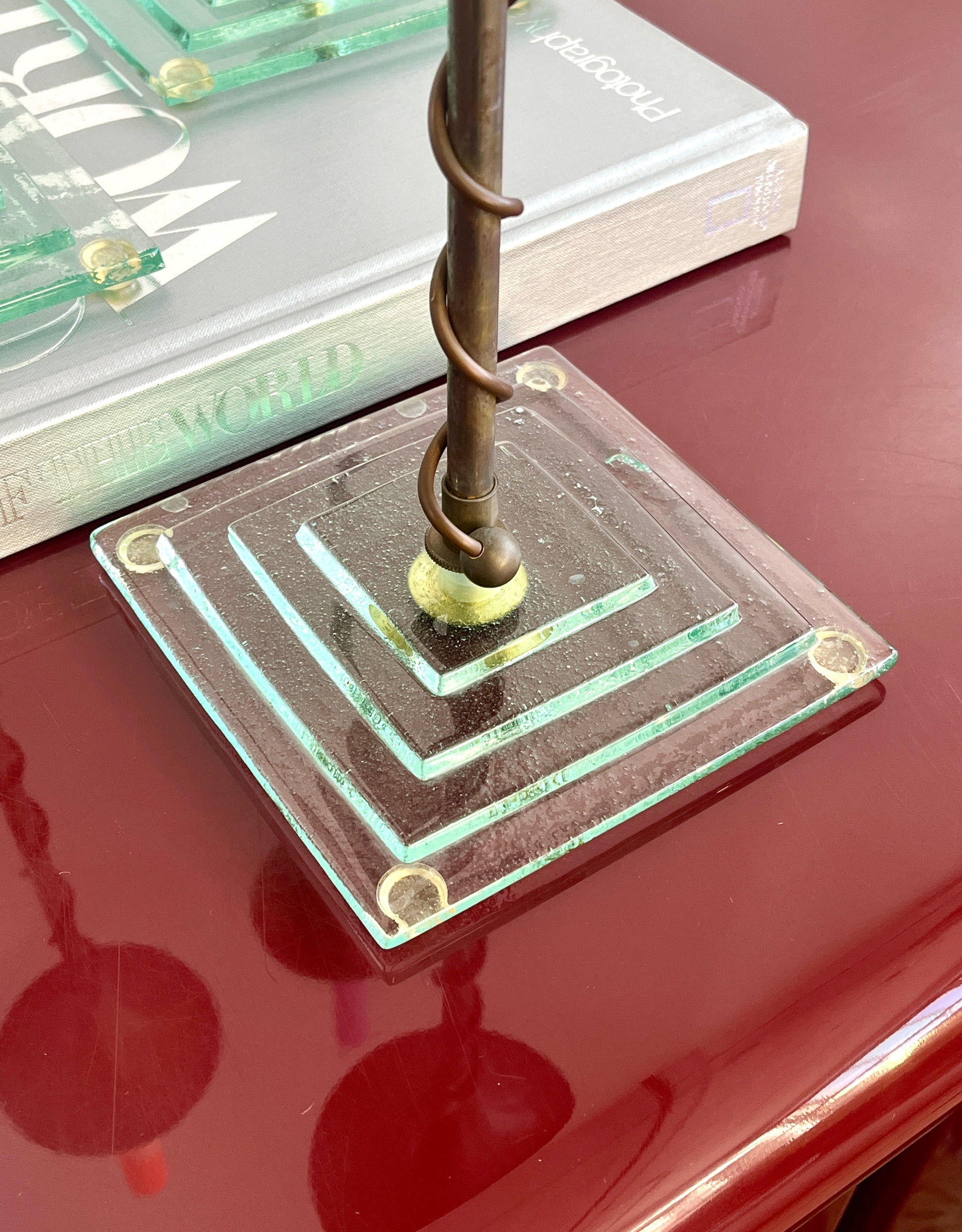 Excellent condition. Glass is blue-tinted and shiny with no chips or cracks. Rubber feet on bottoms of each. Metals are all somewhat rustic, or industrial in appearance. Patina and wear are present and may be intentional. Date unknown.