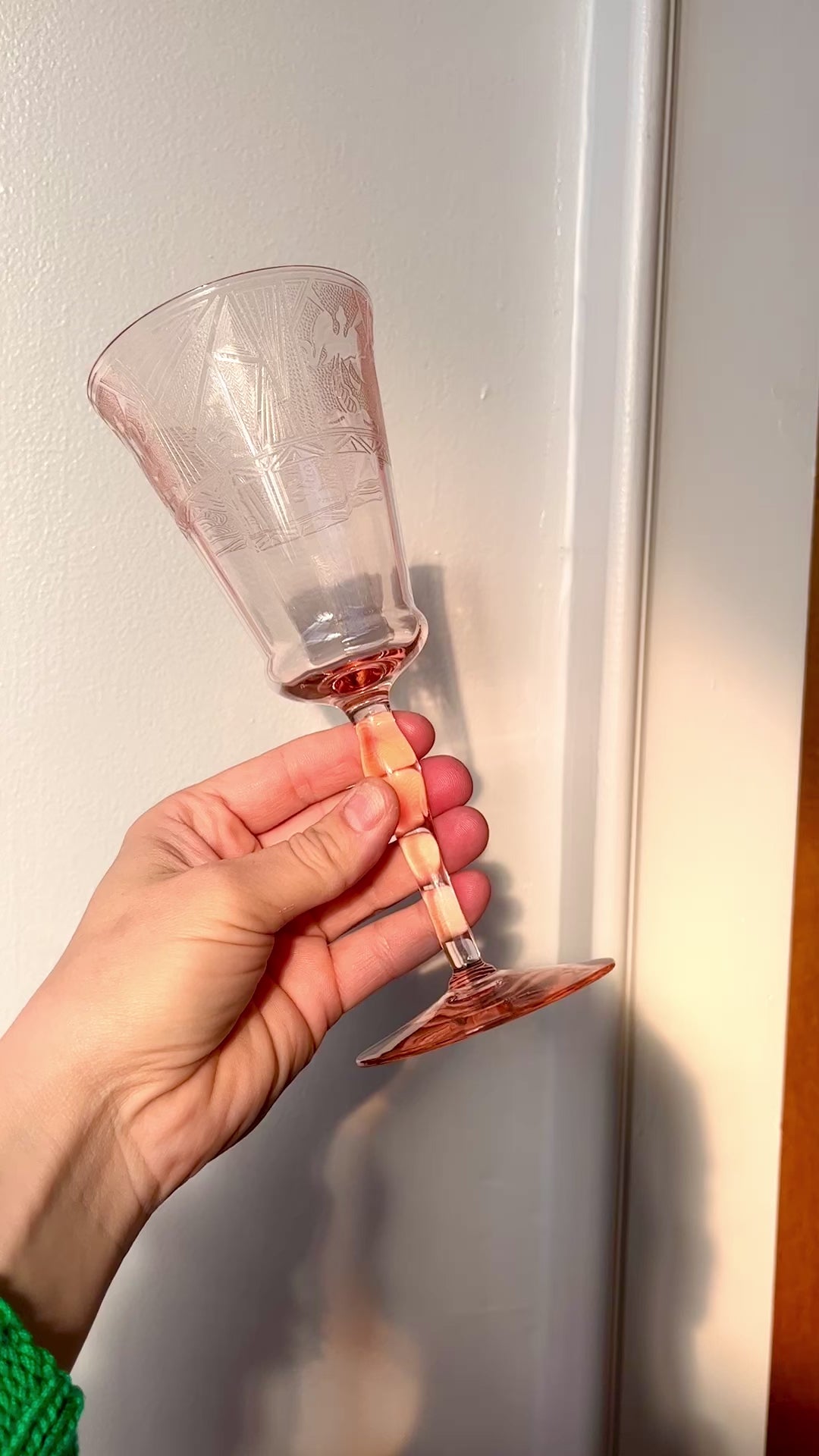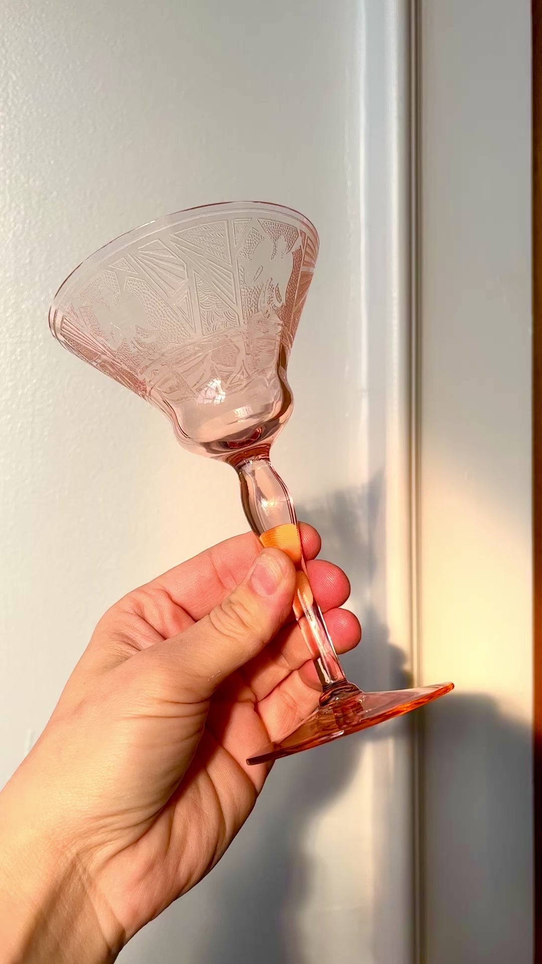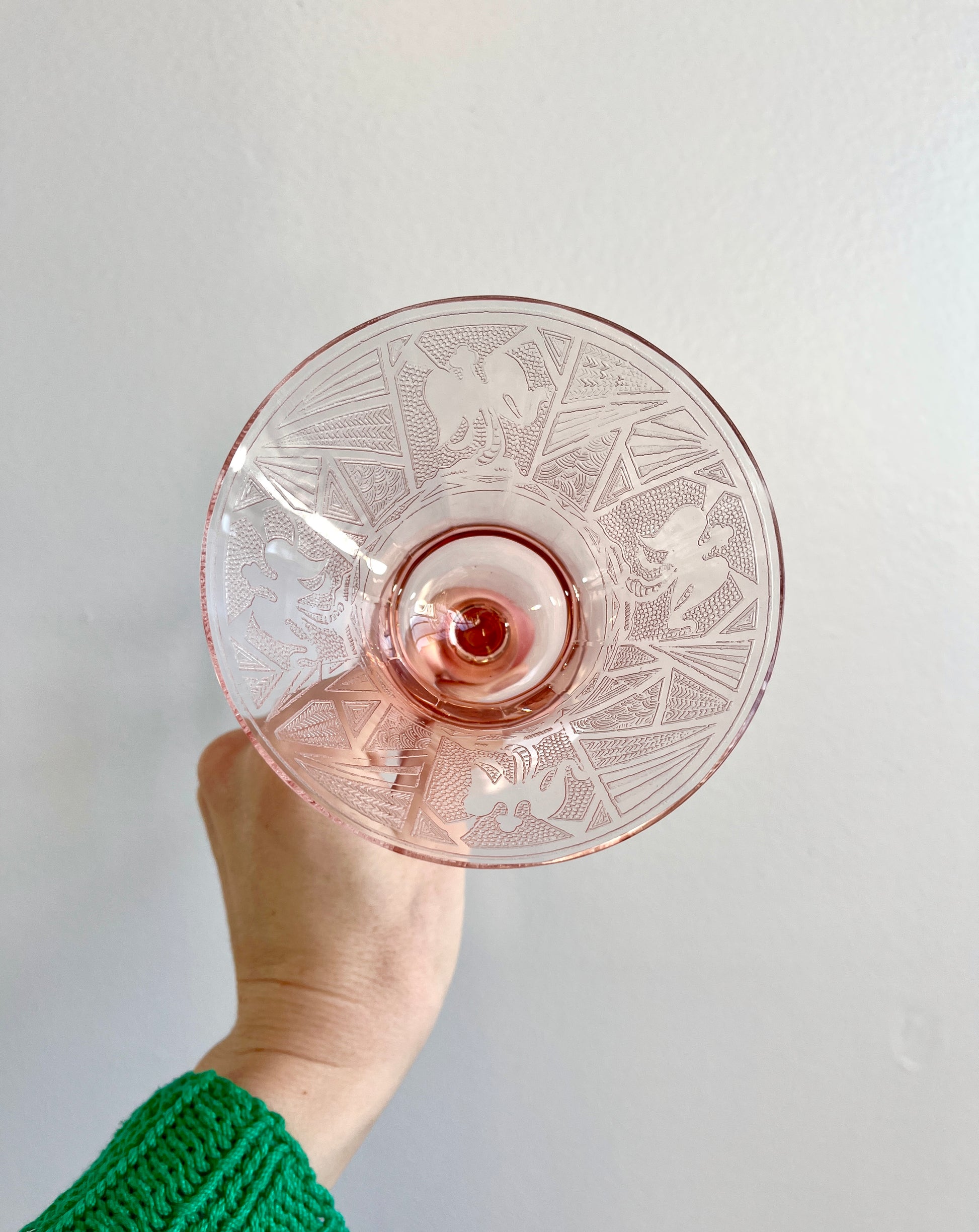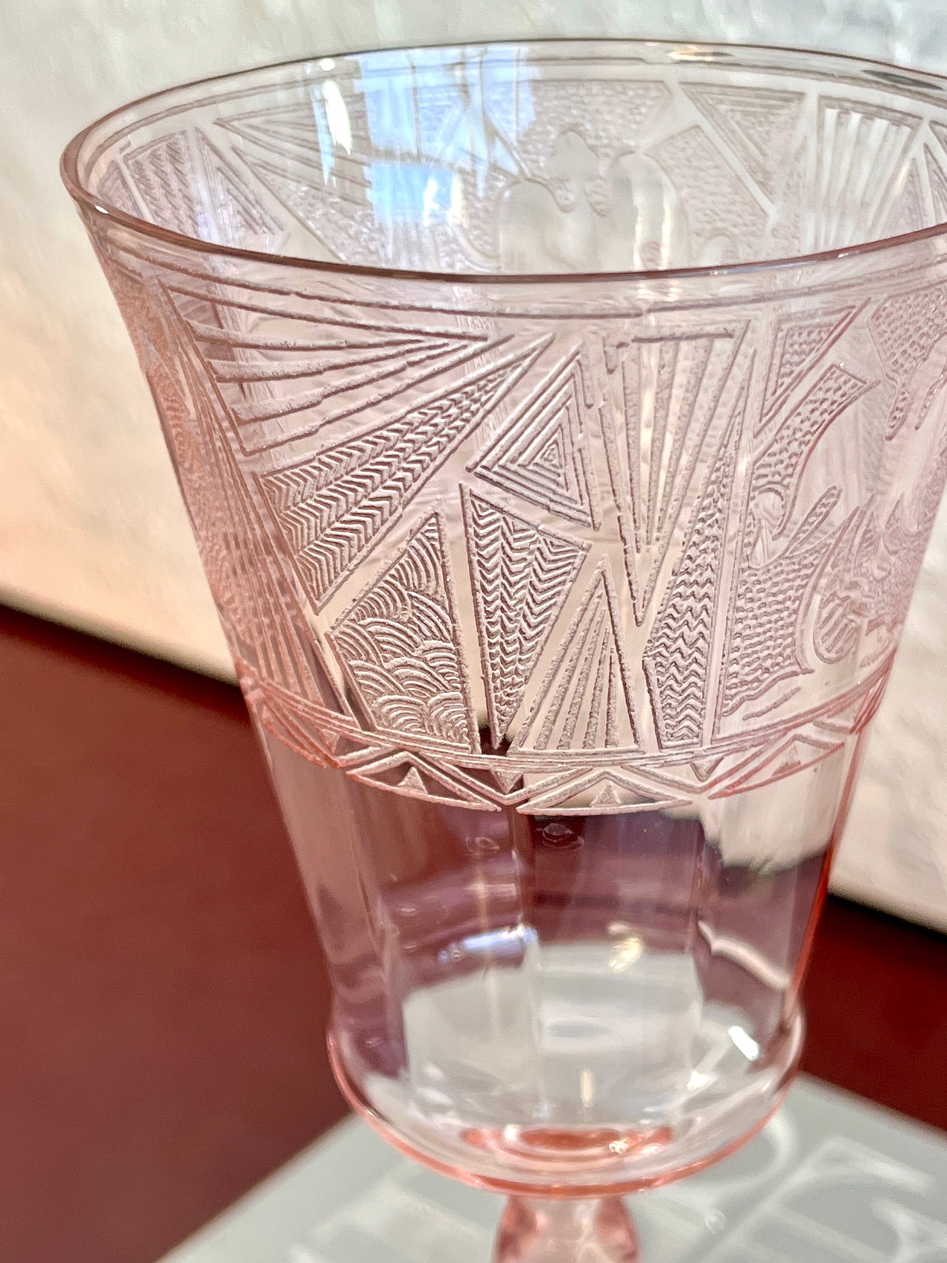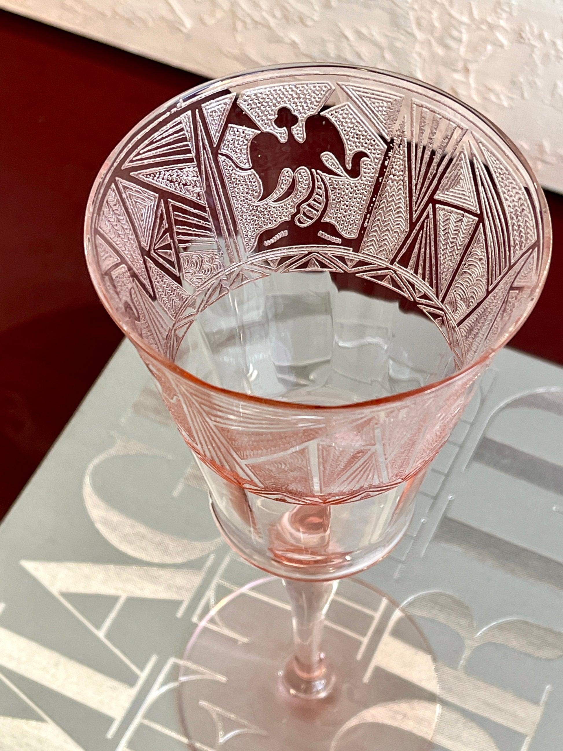 Vintage Glastonbury-Lotus La Furiste Rose etched wine and champagne glasses