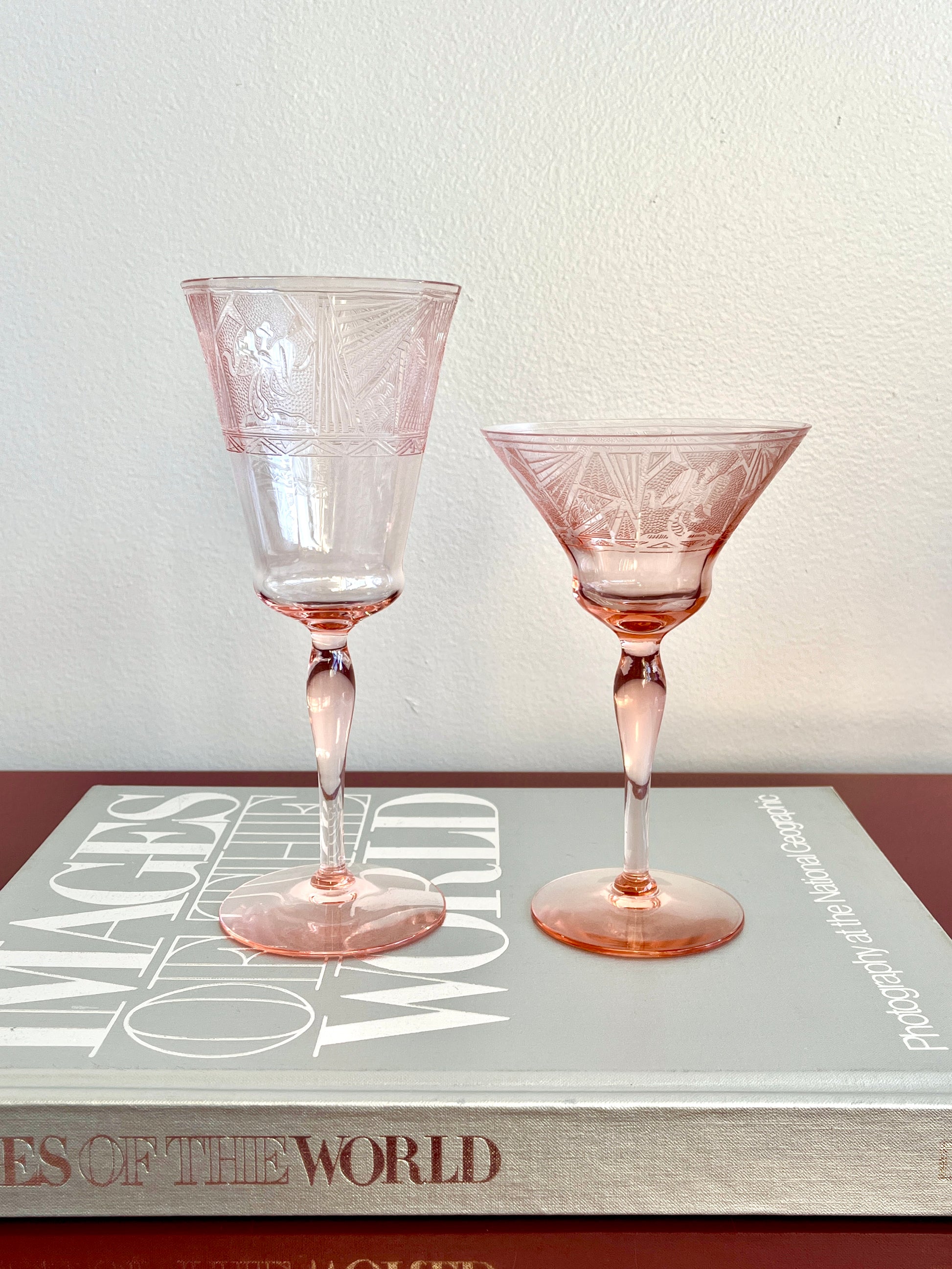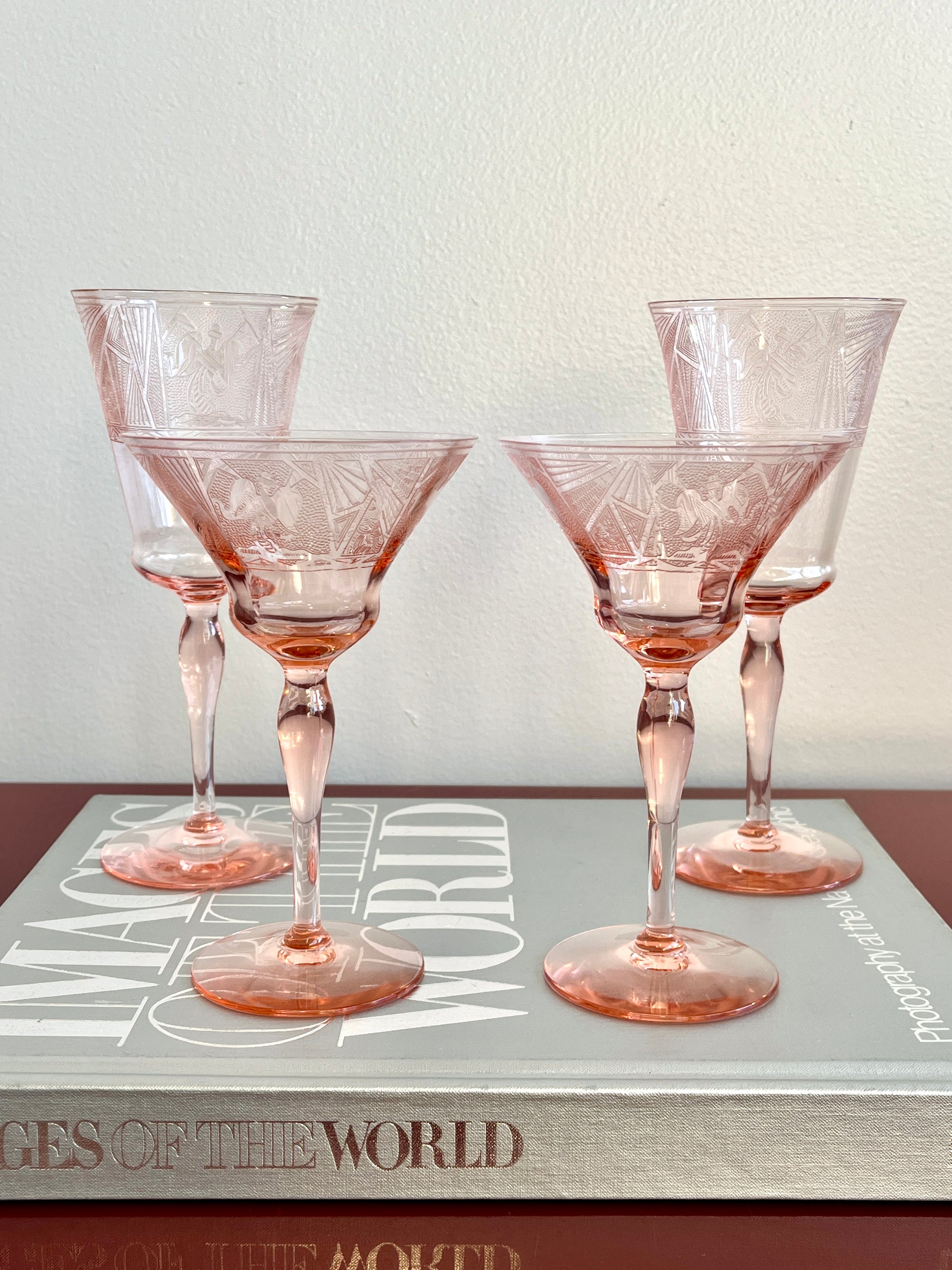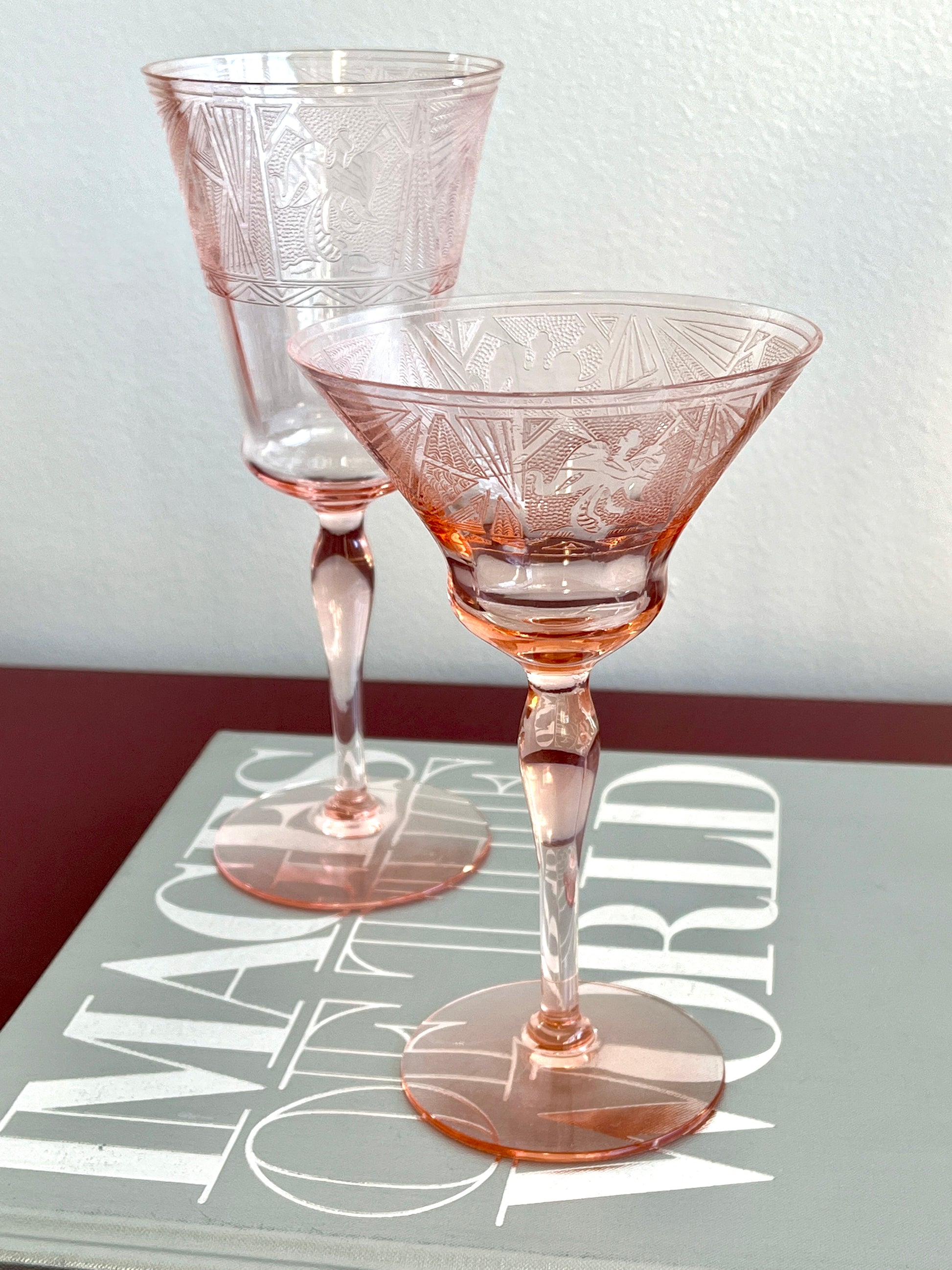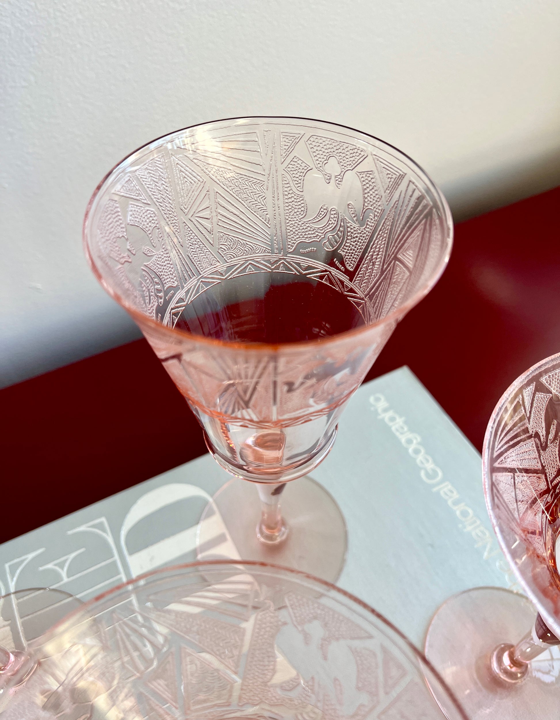 Vintage Glastonbury-Lotus La Furiste Rose etched wine and champagne glasses. Very beautiful and rare wine glasses and champagne coupes from the 1920s/30s. Wonderful Art Deco etched design, with geometric patterns and bird-like images. Optic bowls and curvy stems. Two wine glasses and two coupes. Sold as set four.