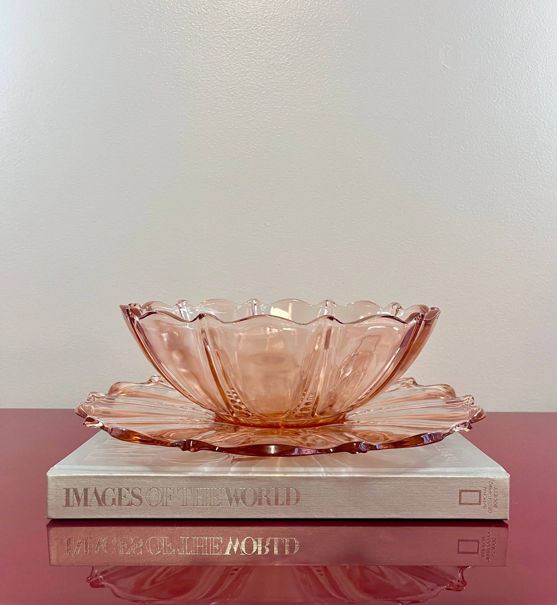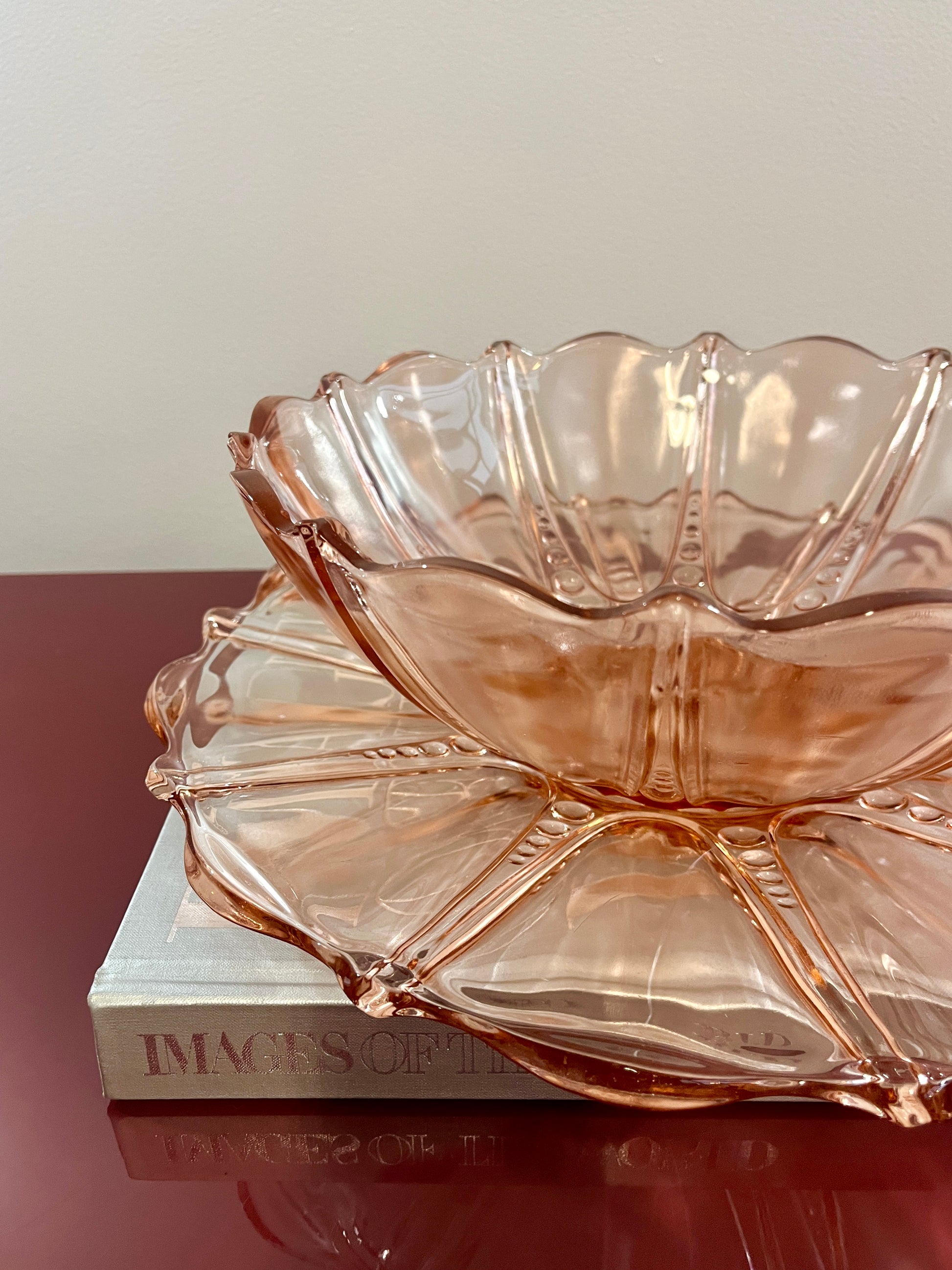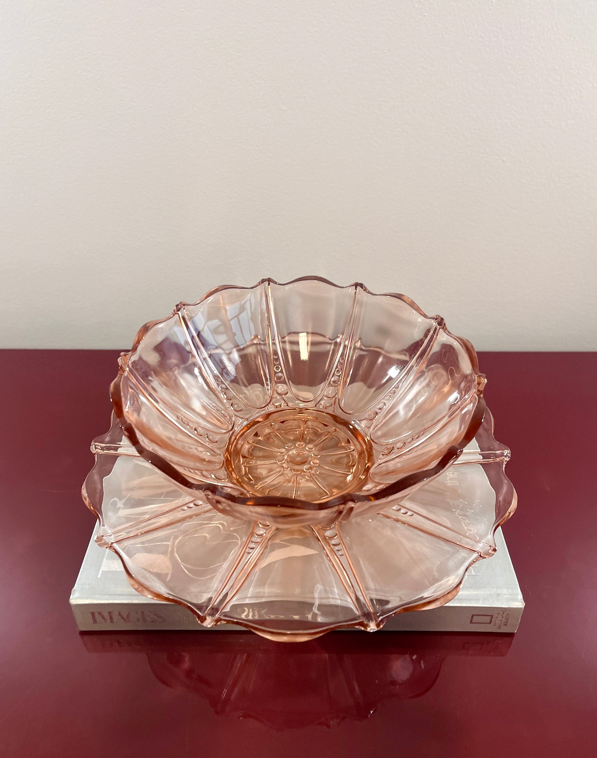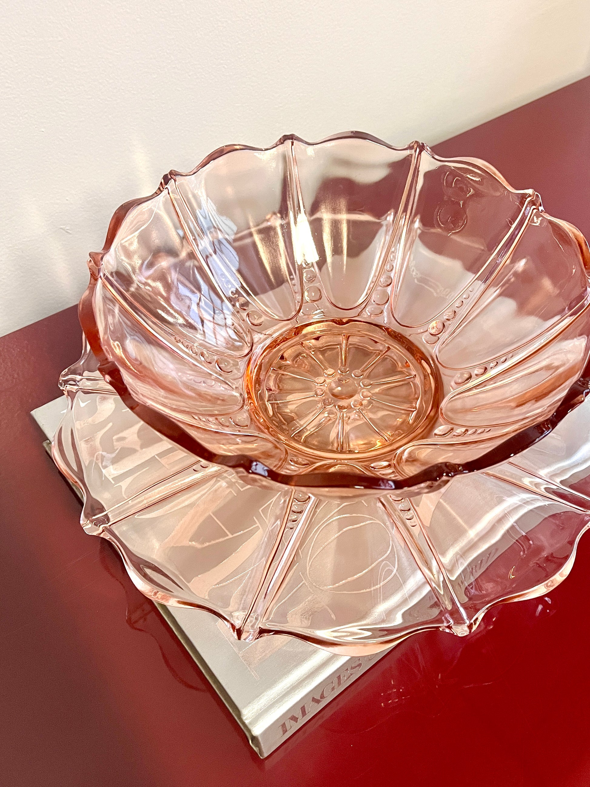 Vintage Anchor Hocking Pink Depression Glass serving bowl and serving platter. This is the “Oyster and Pearl” line from Hocking, produced from 1938-1940. They have a lovely deco style with pearl-shaped, or hobnail, embellishments. Lightly scalloped edges on both. Can be used together as shown, or the platter can be used separately. Sold individually or as a set.