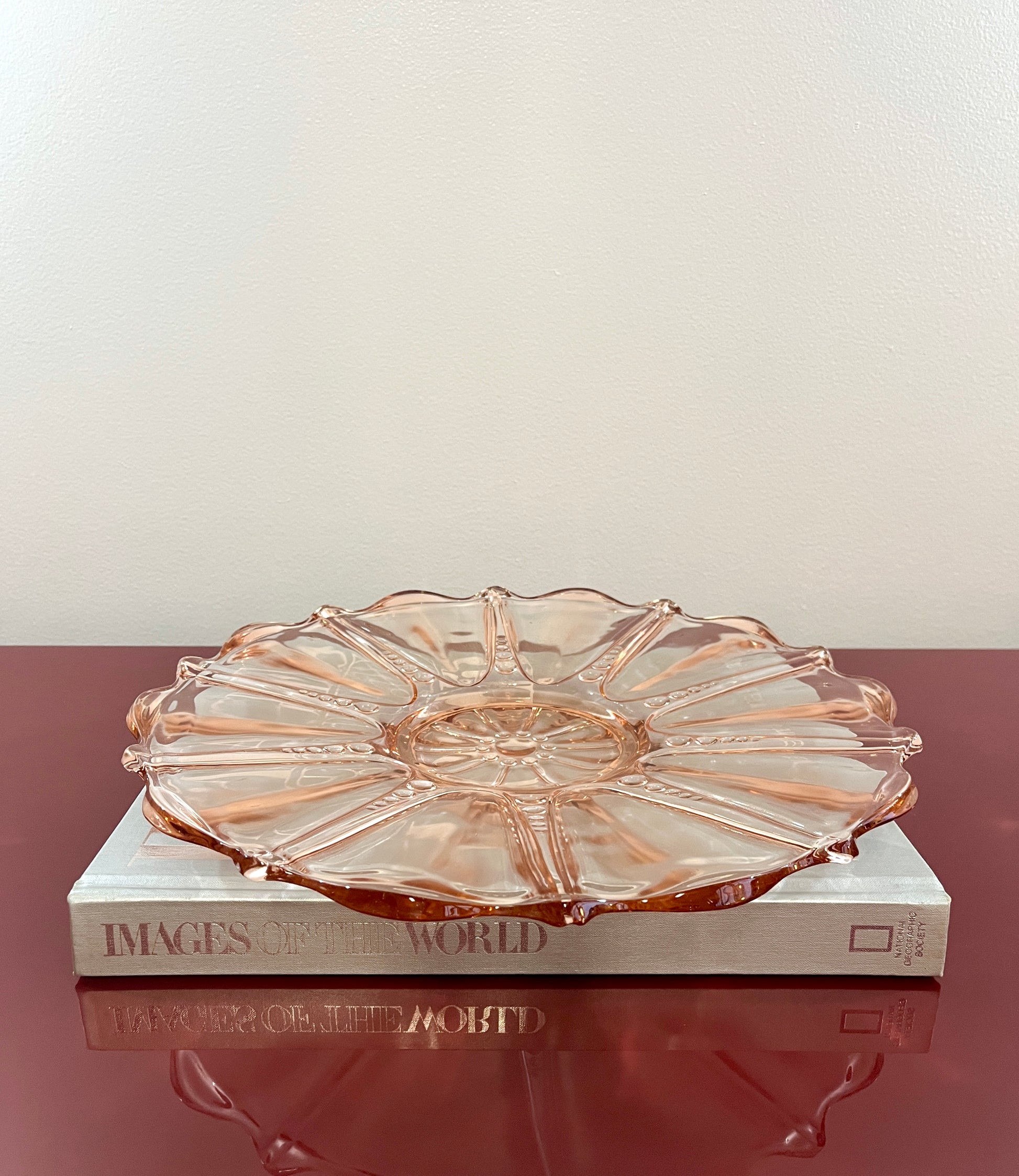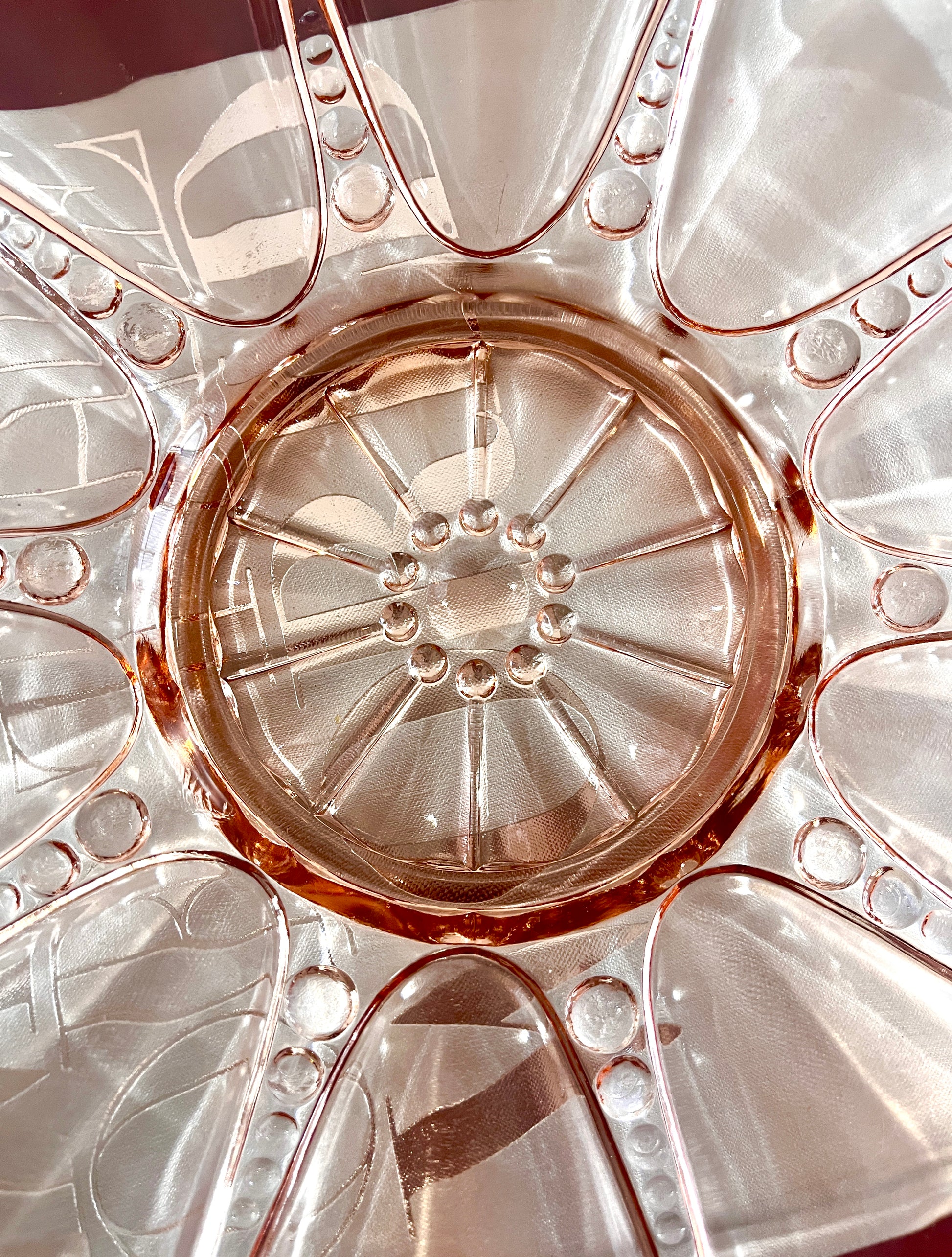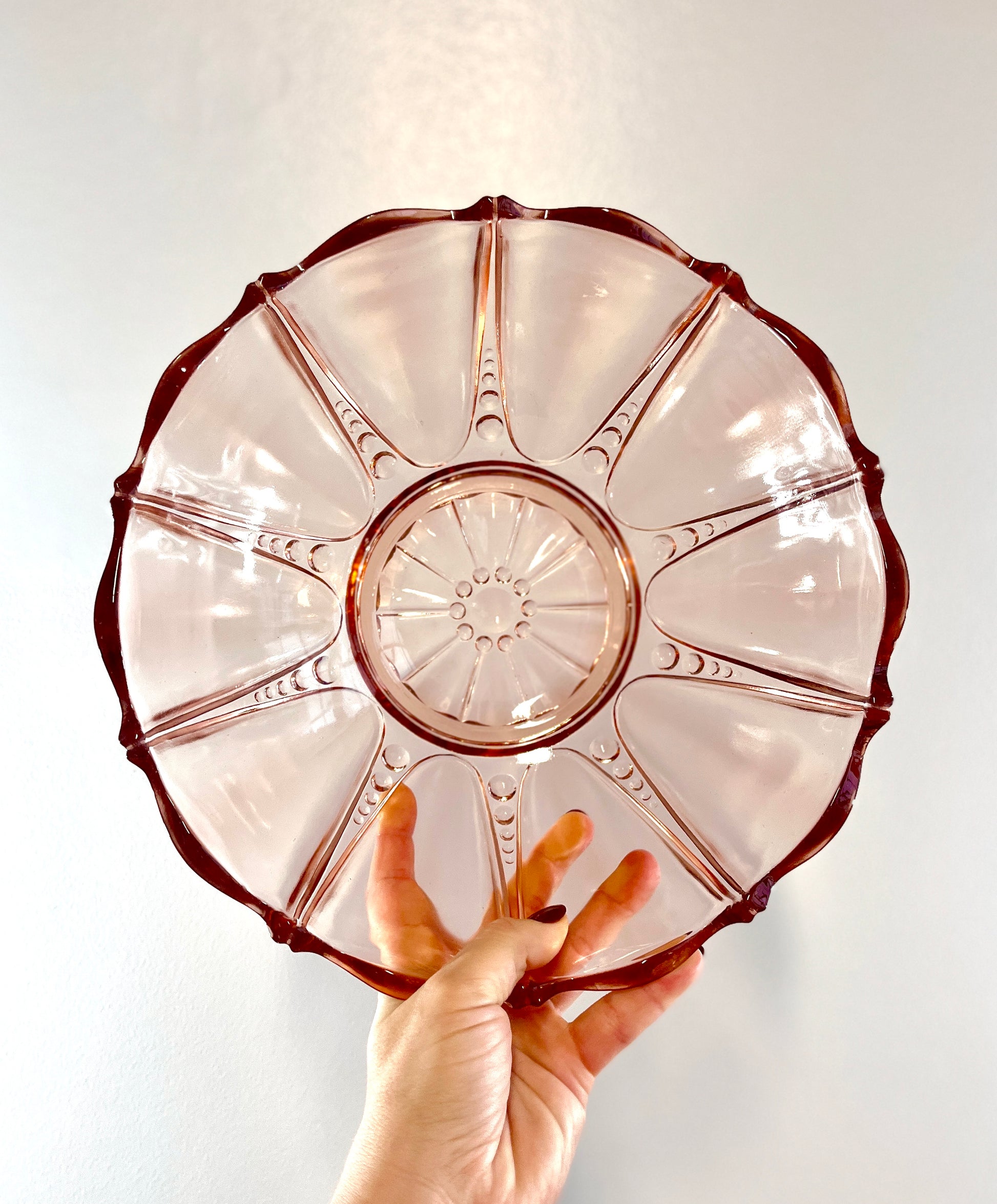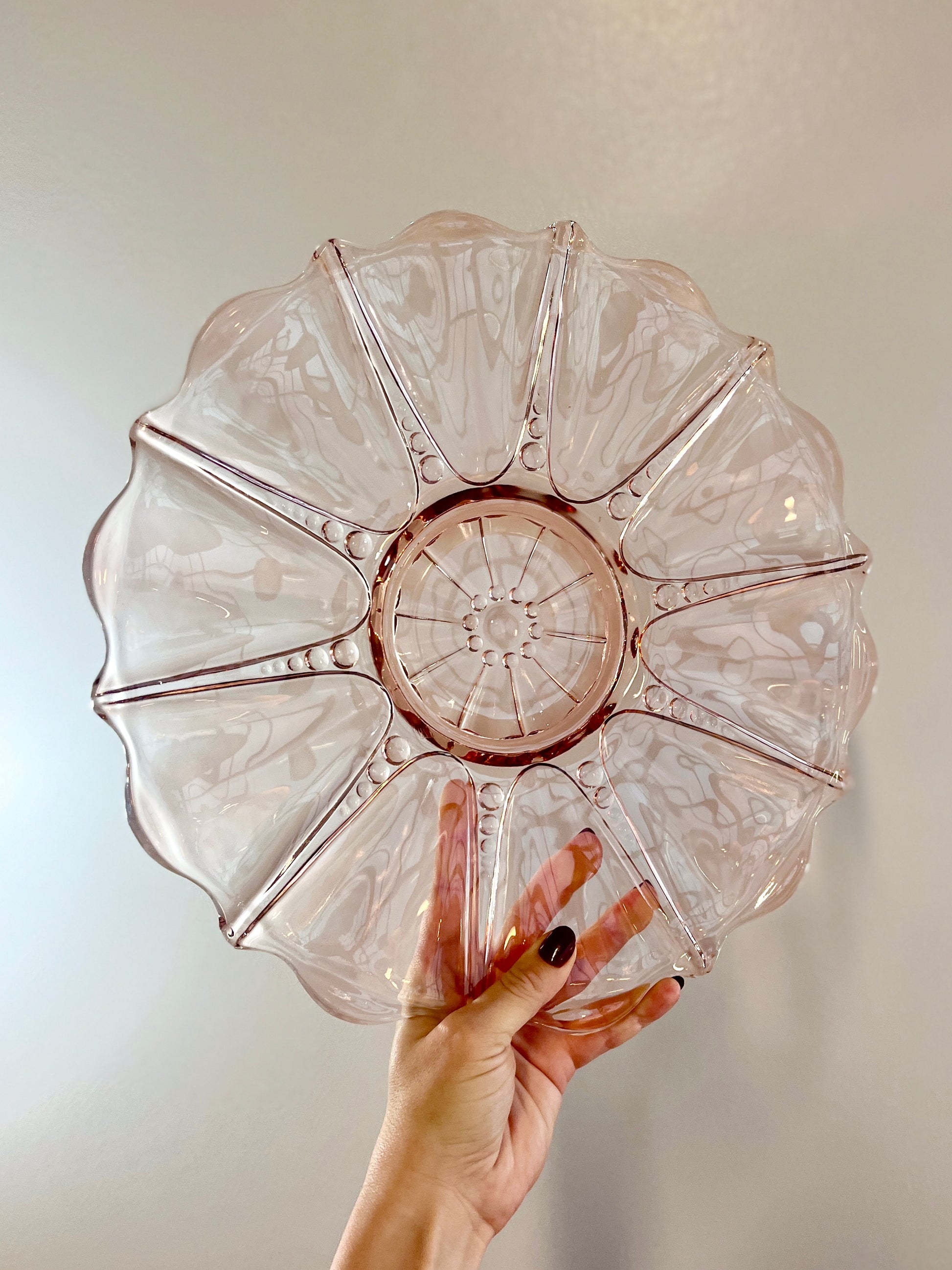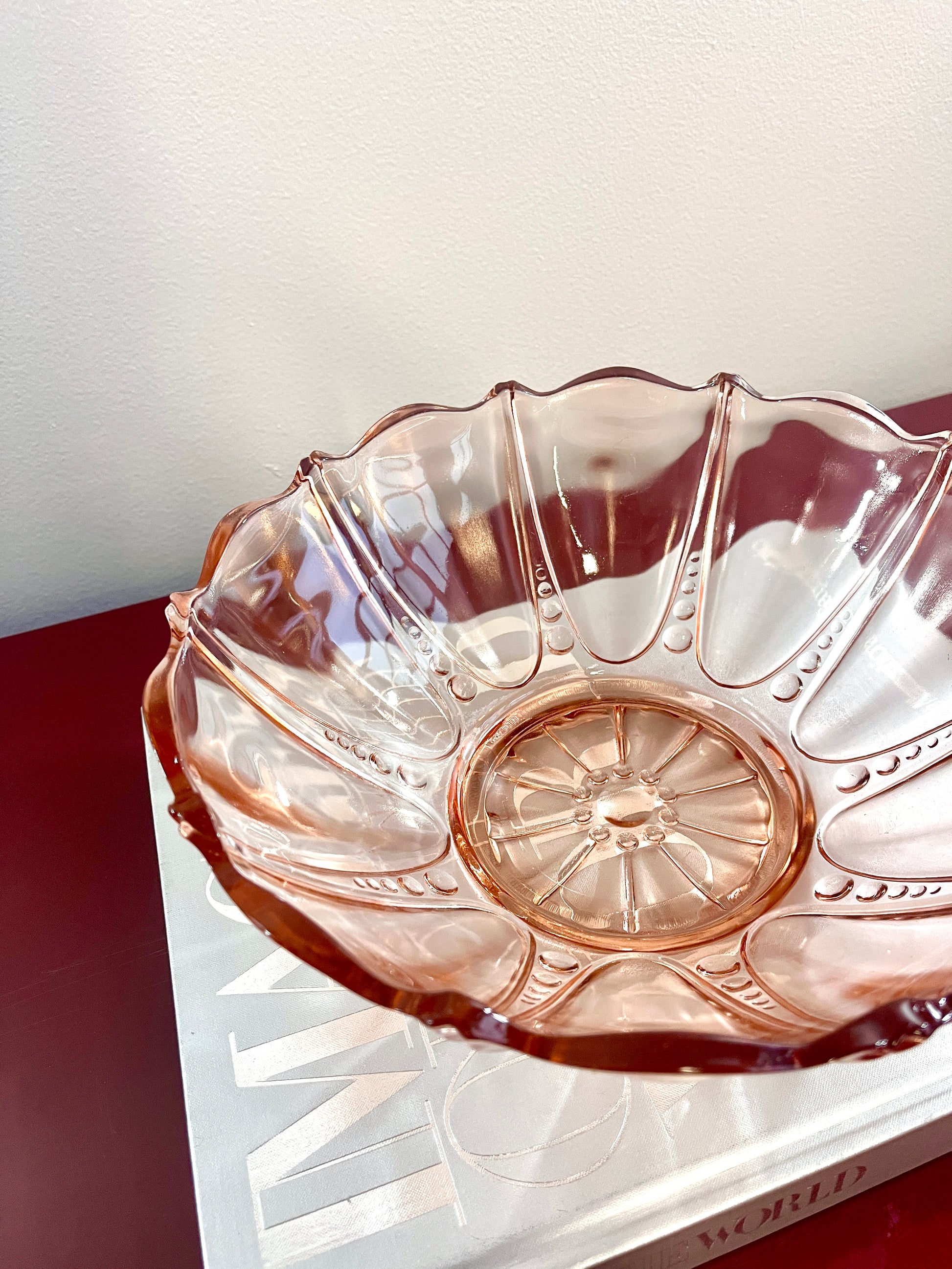 Vintage Anchor Hocking Pink Depression Glass serving bowl and serving platter. This is the “Oyster and Pearl” line from Hocking, produced from 1938-1940. They have a lovely deco style with pearl-shaped, or hobnail, embellishments. Lightly scalloped edges on both. Can be used together as shown, or the platter can be used separately. Sold individually or as a set.