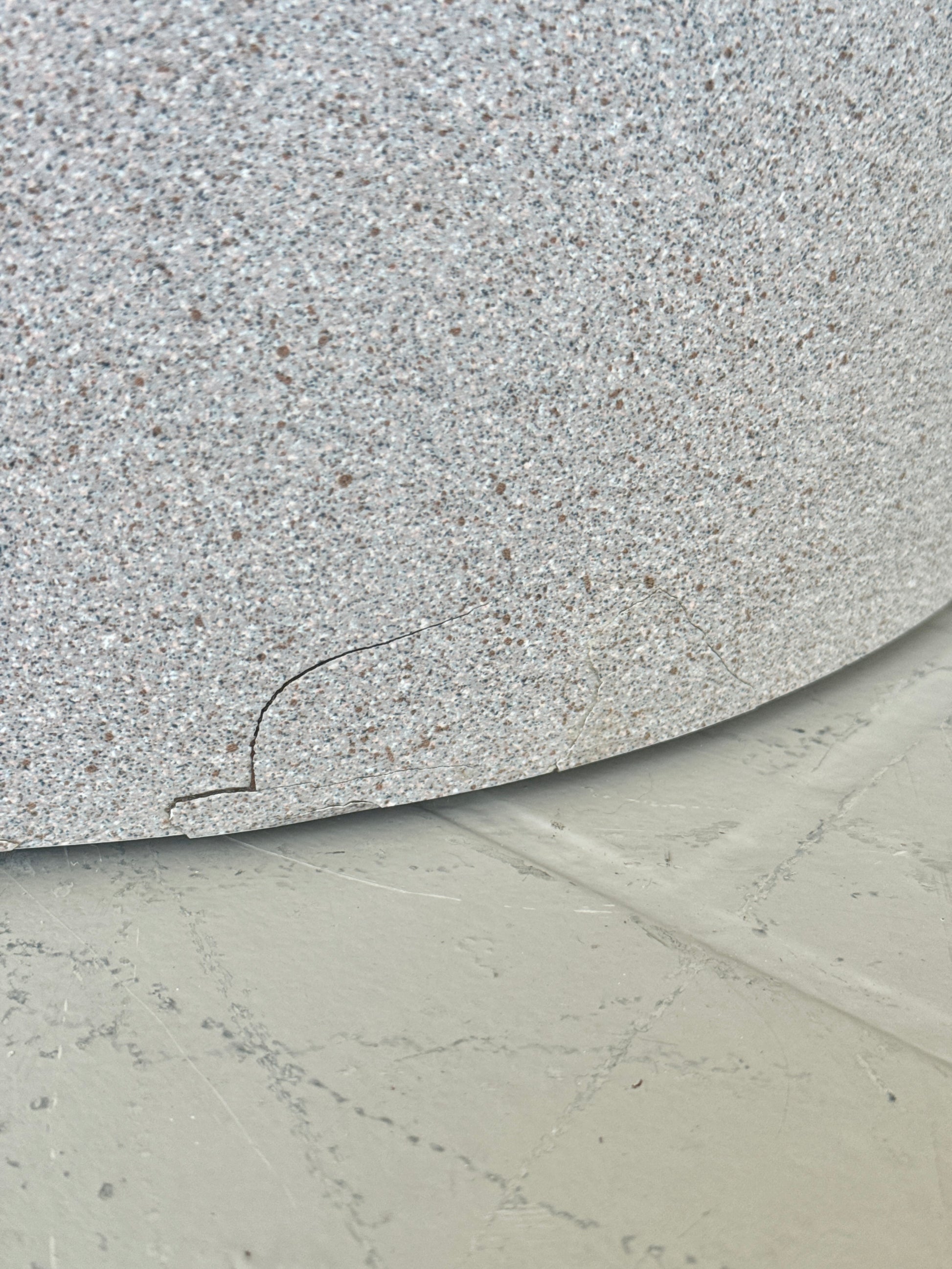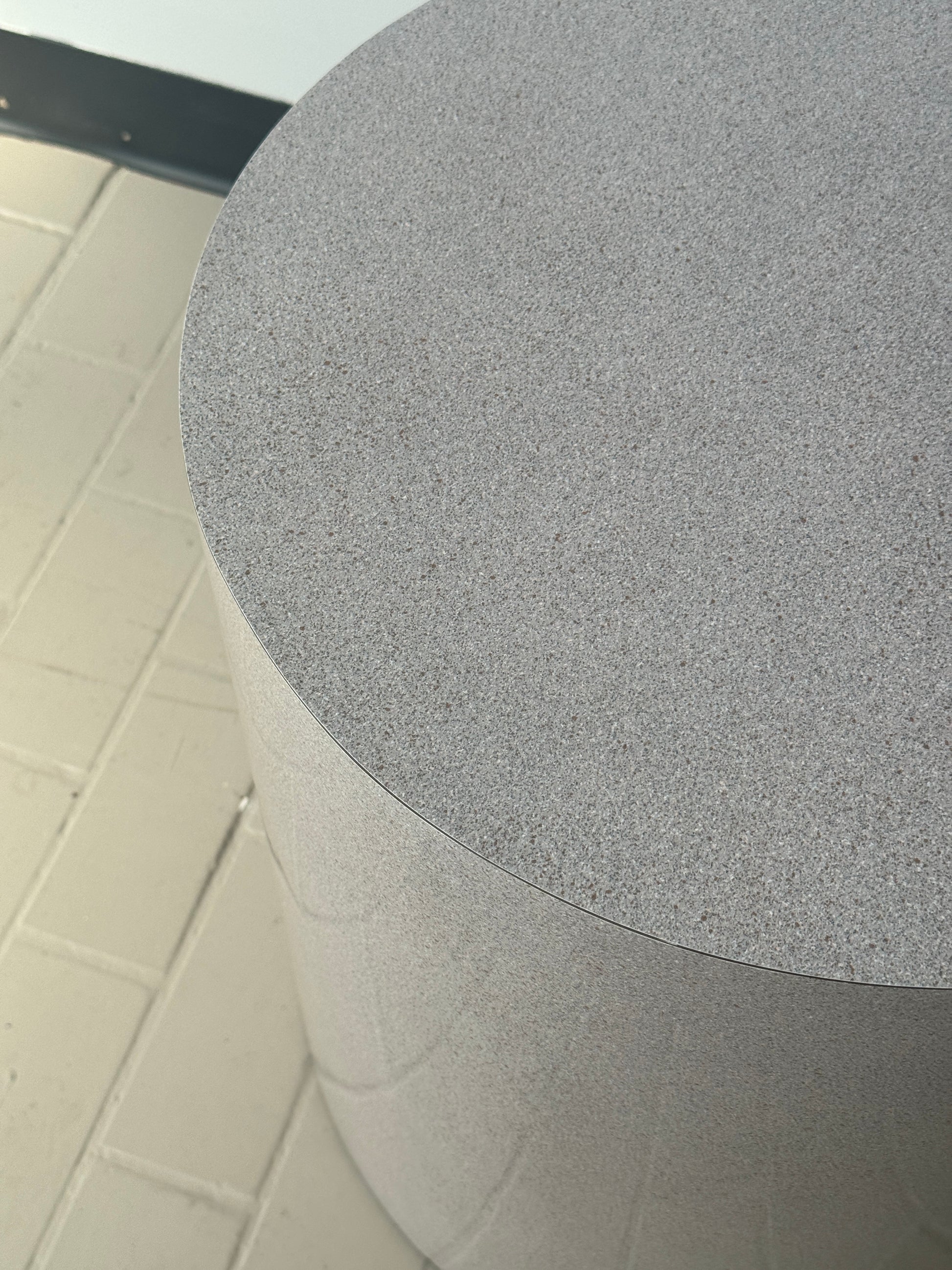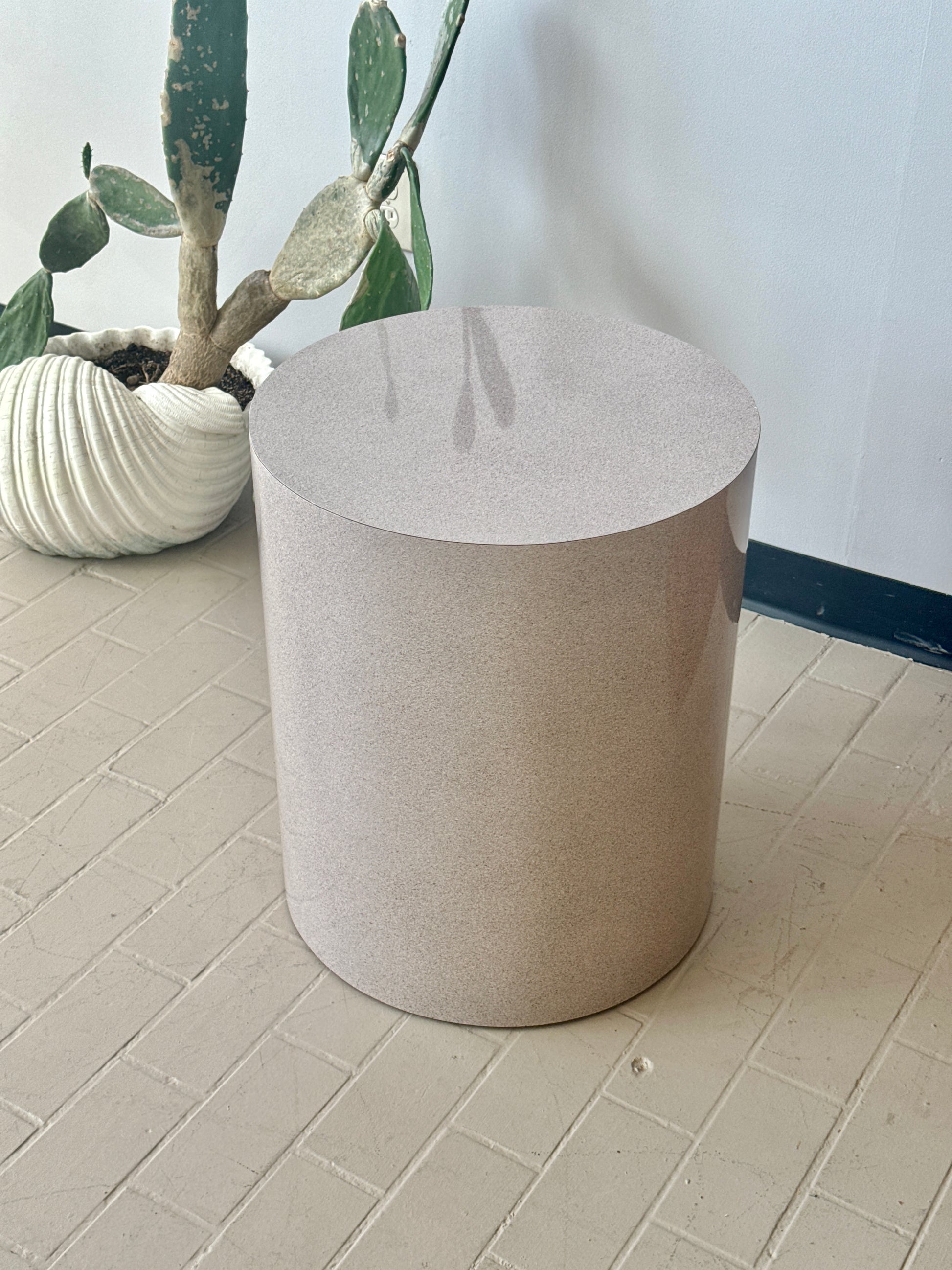 Fab postmodern laminate drum side table. Speckled soft rose, perfect neutral accent.
