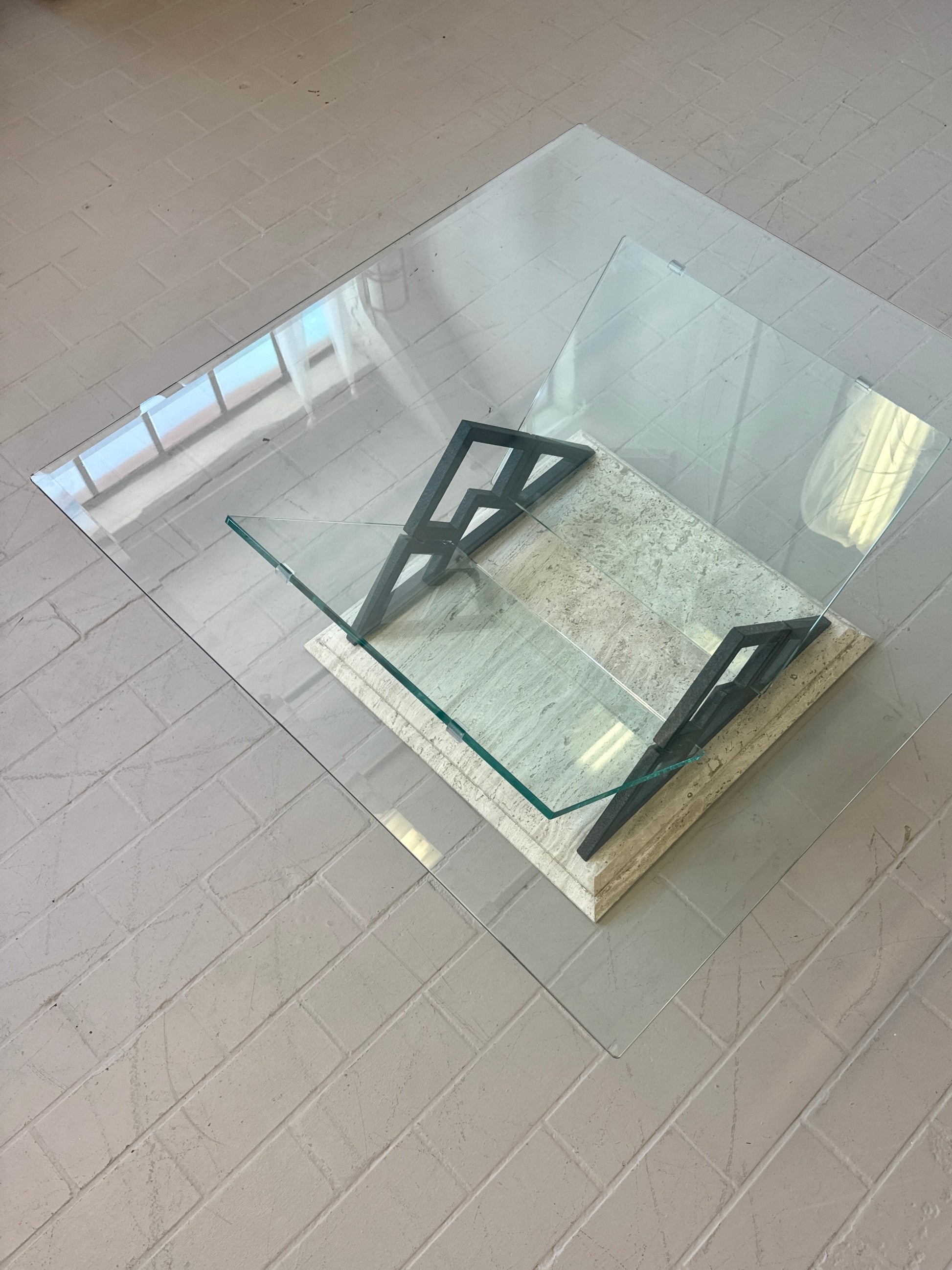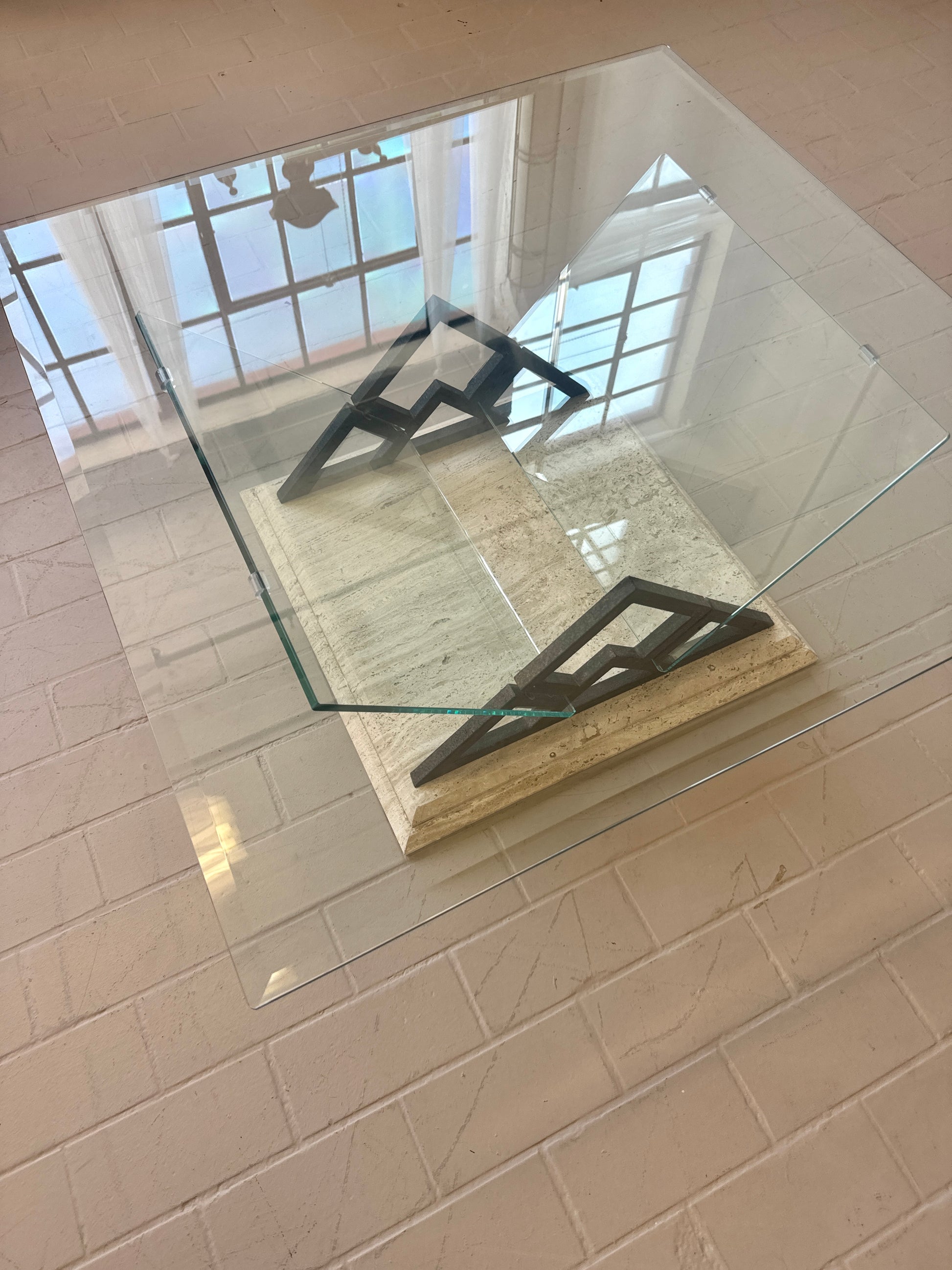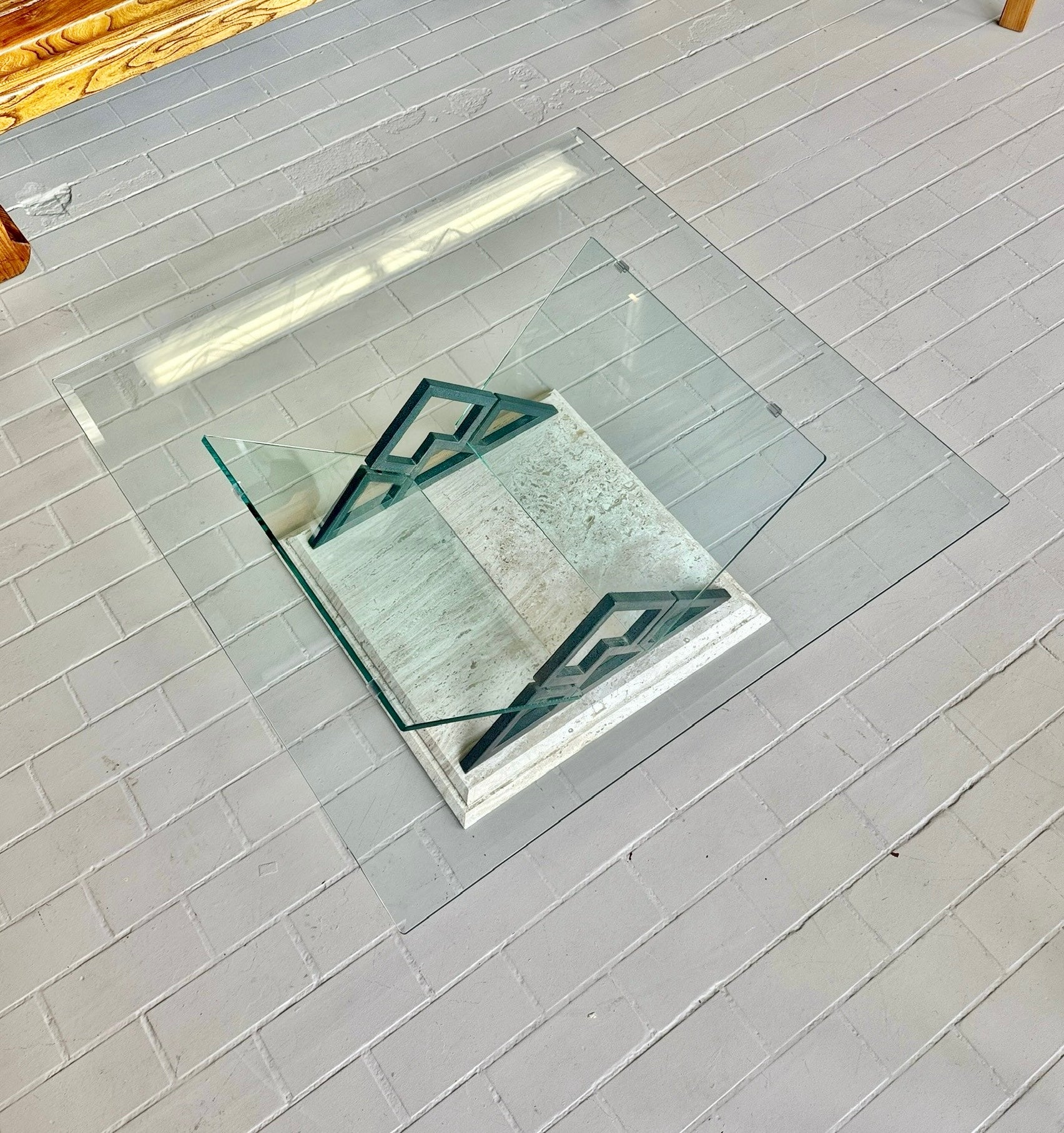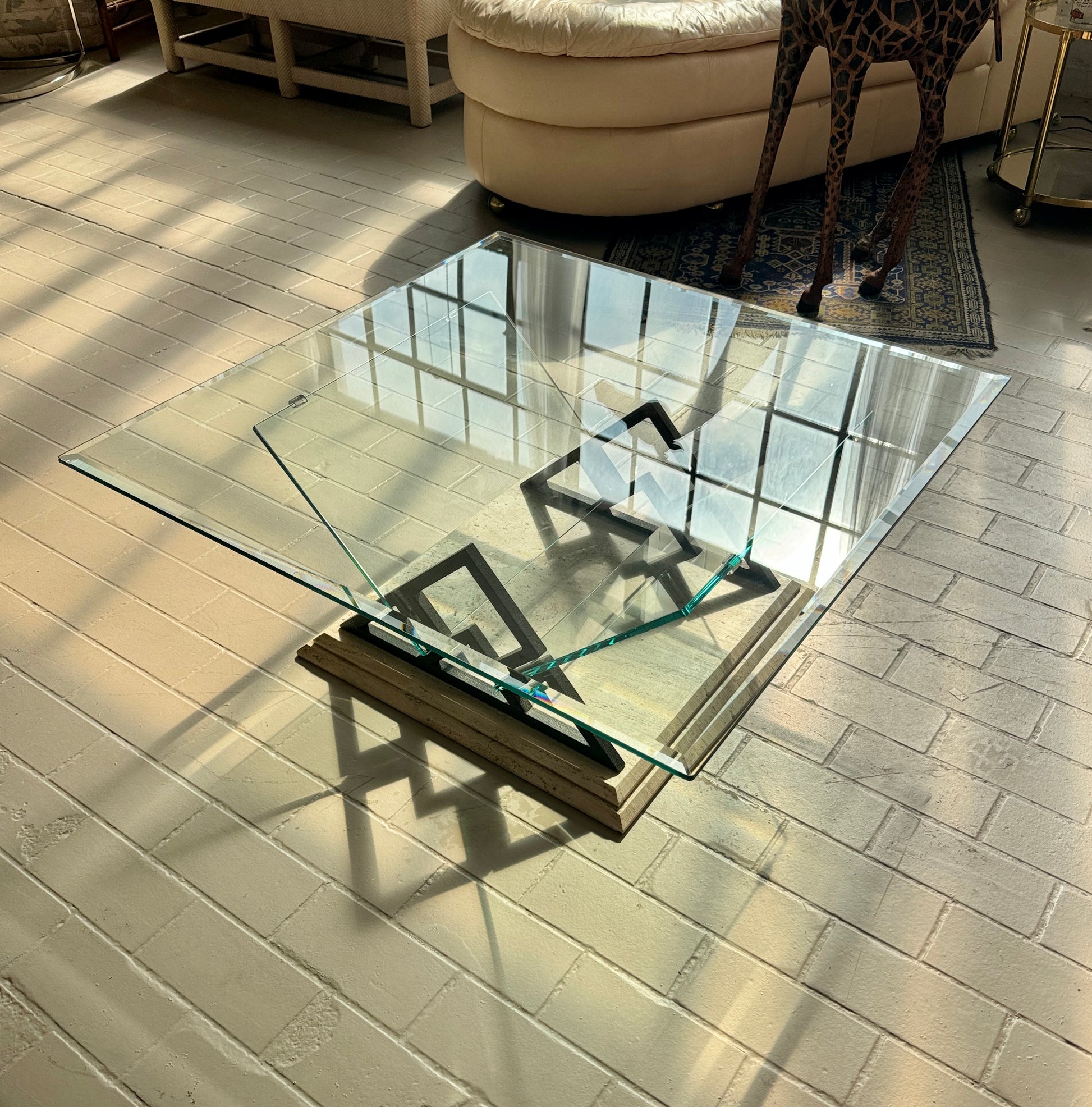 Wonderful postmodern coffee table with beveled square glass top, travertine base, and fab metal and glass supports. Two glass pieces sit in metal and stone base in a v-shape. Table top and glass supports are removable for easy transport.