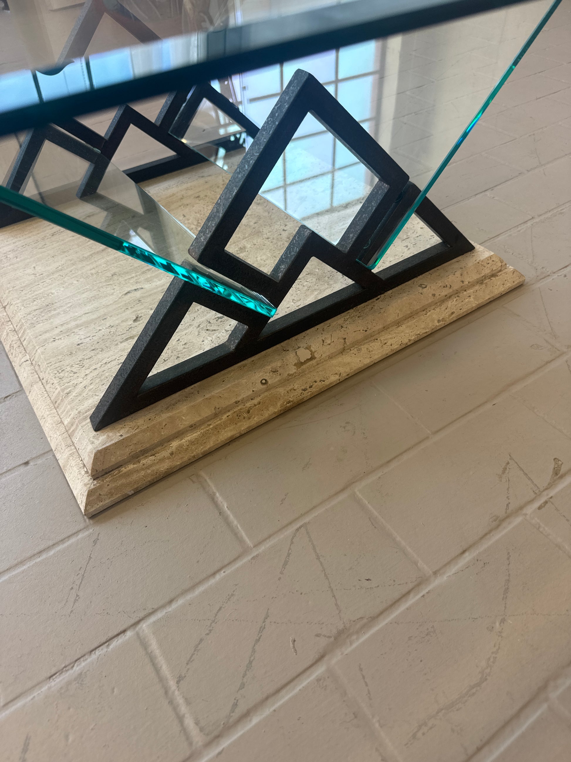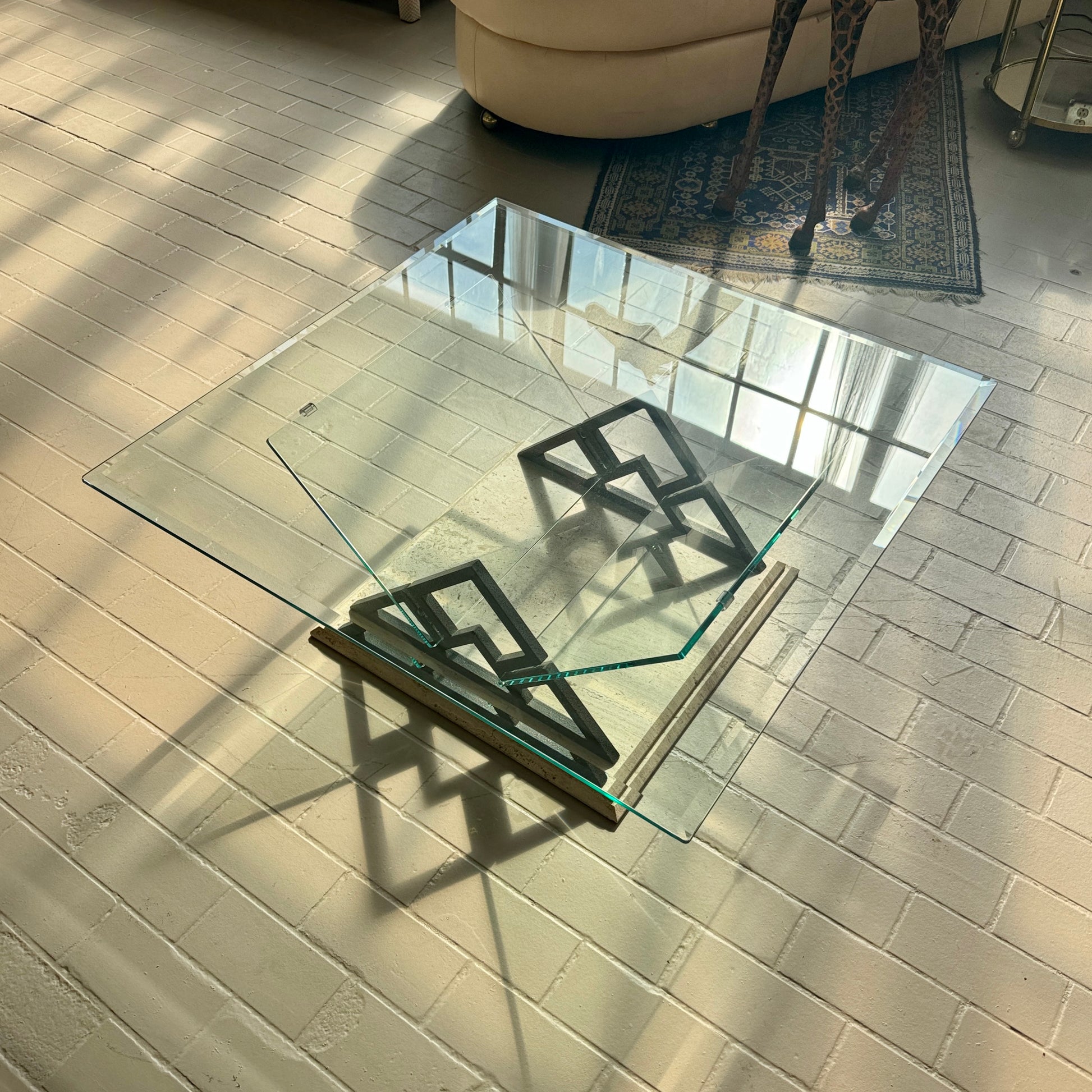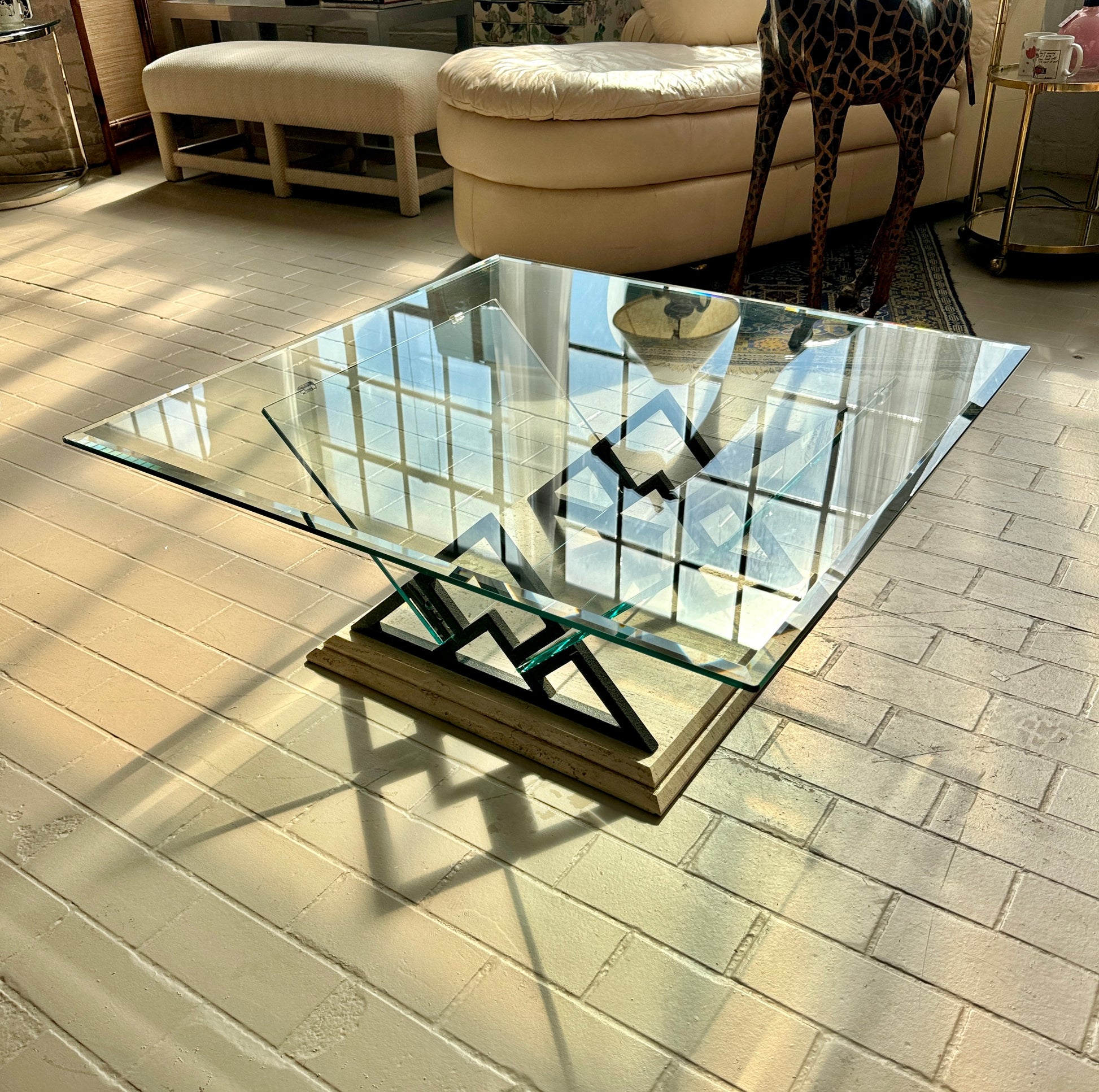 Wonderful postmodern coffee table with beveled square glass top, travertine base, and fab metal and glass supports. Two glass pieces sit in metal and stone base in a v-shape. Table top and glass supports are removable for easy transport.