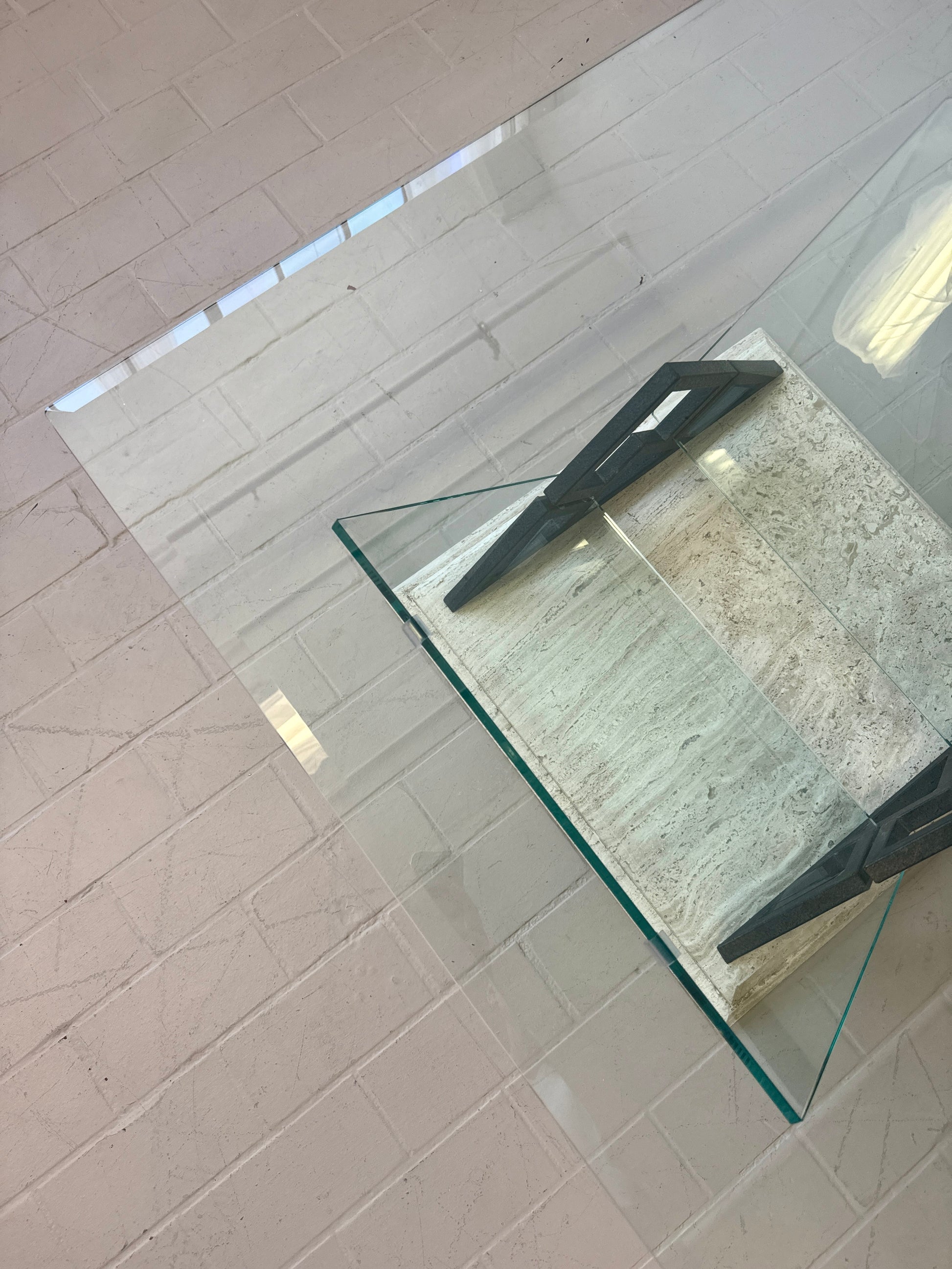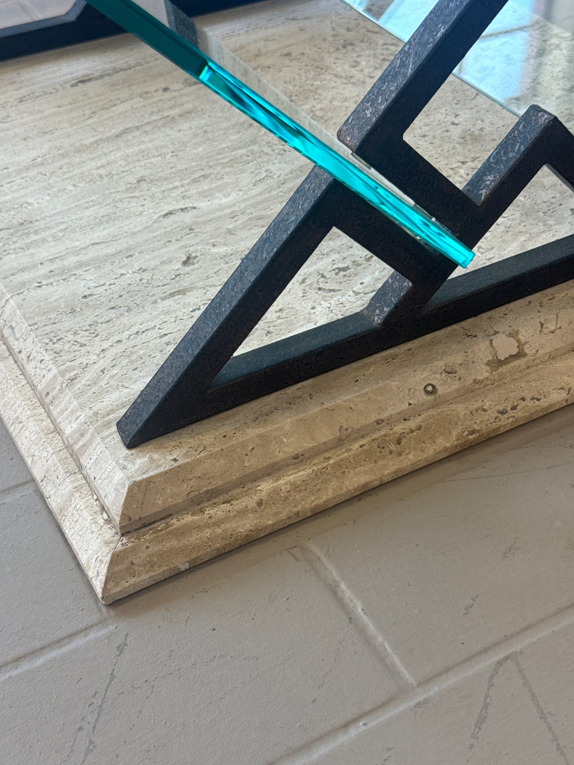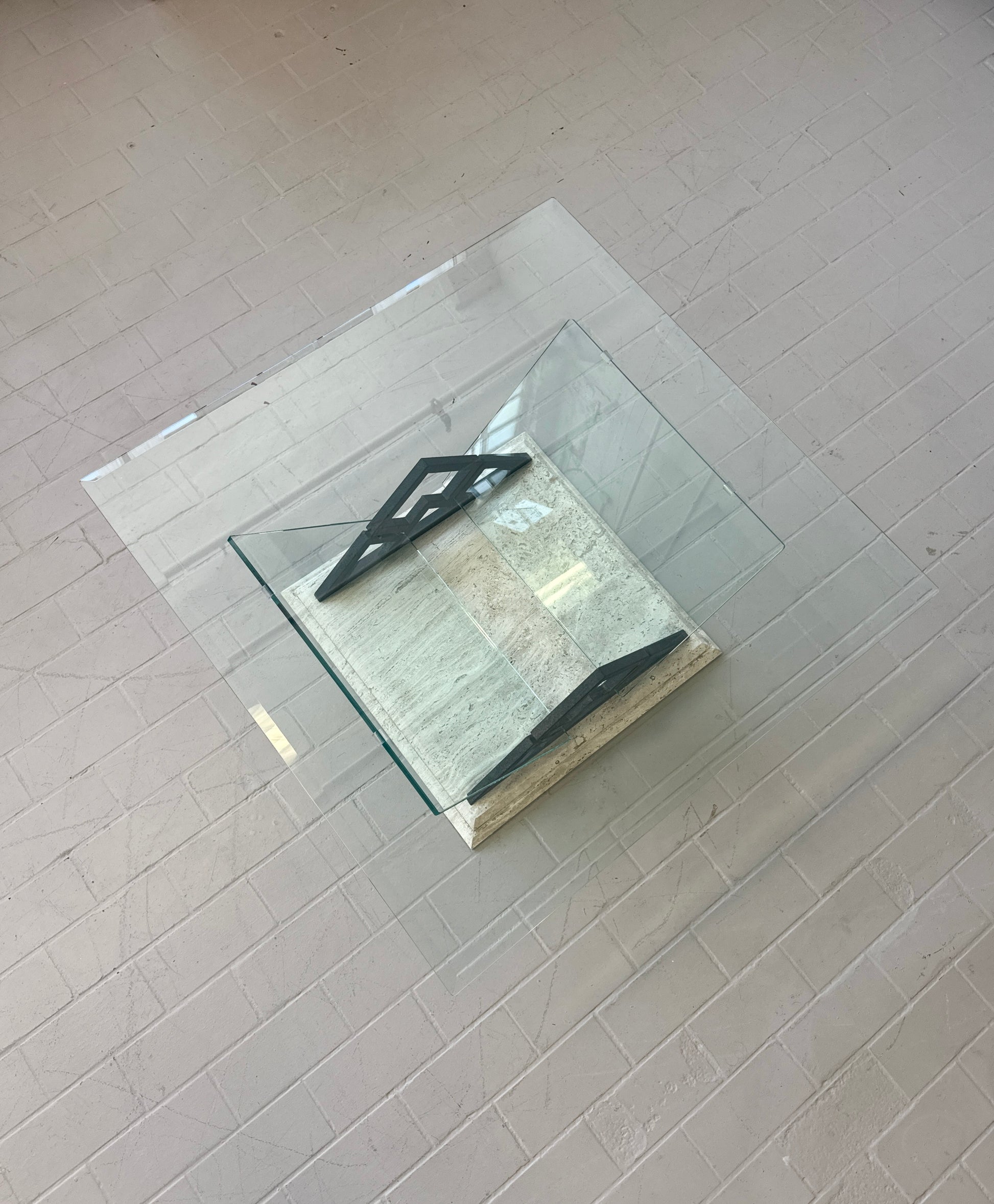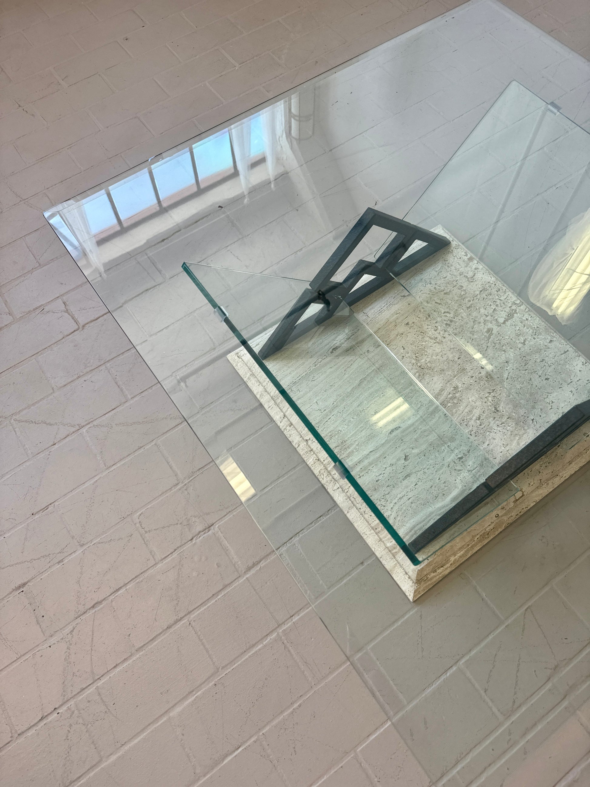 Wonderful postmodern coffee table with beveled square glass top, travertine base, and fab metal and glass supports. Two glass pieces sit in metal and stone base in a v-shape. Table top and glass supports are removable for easy transport.