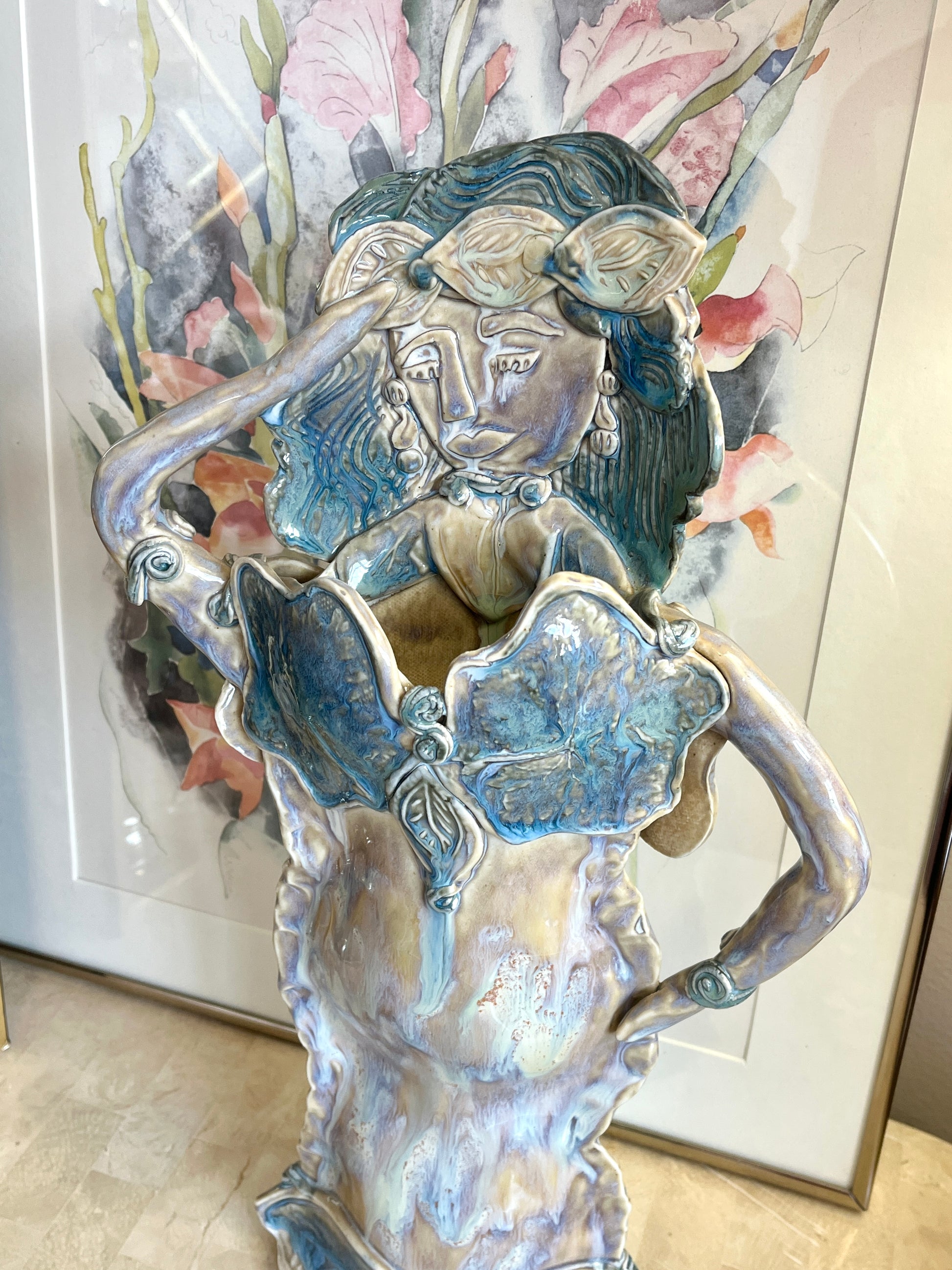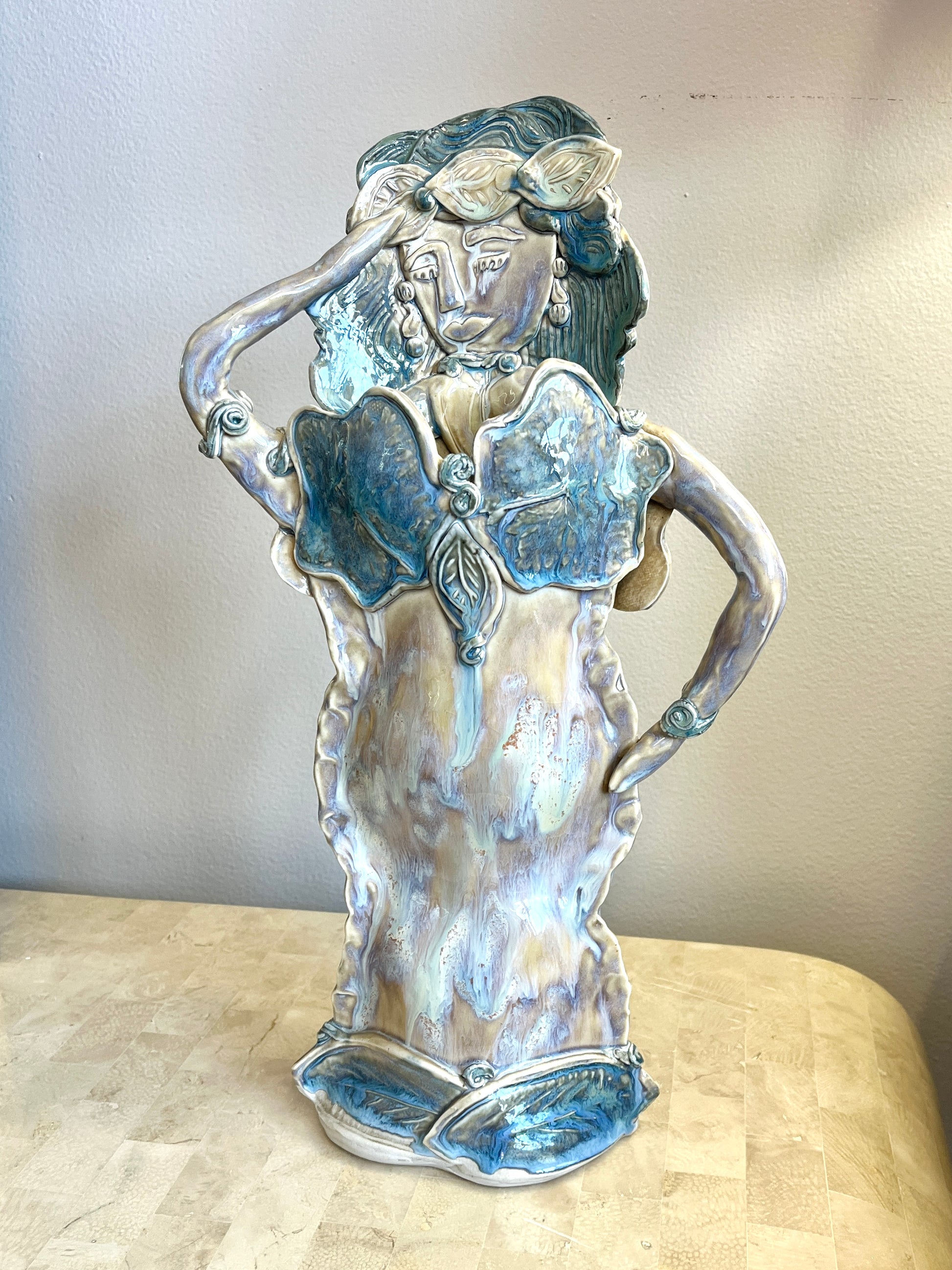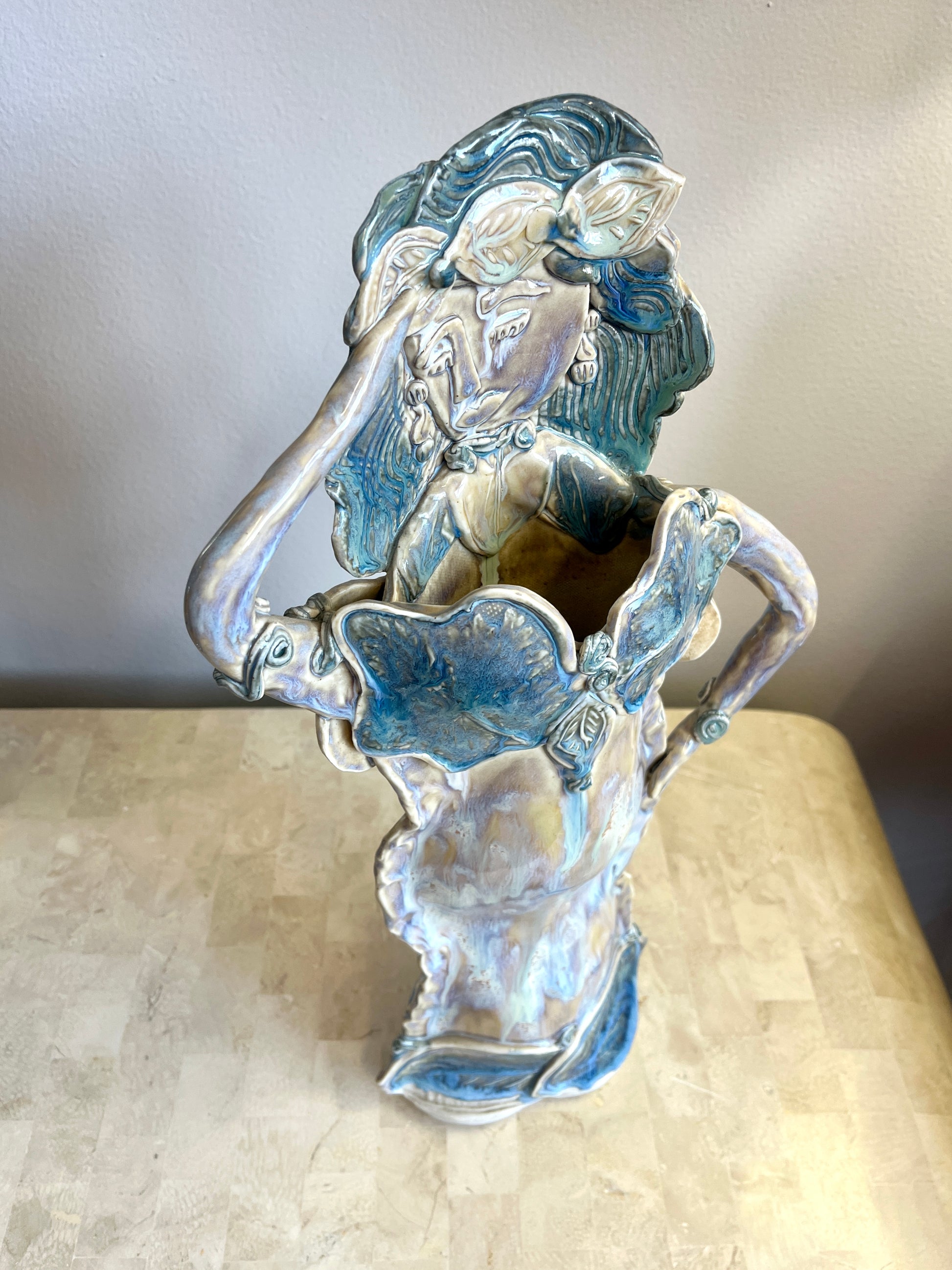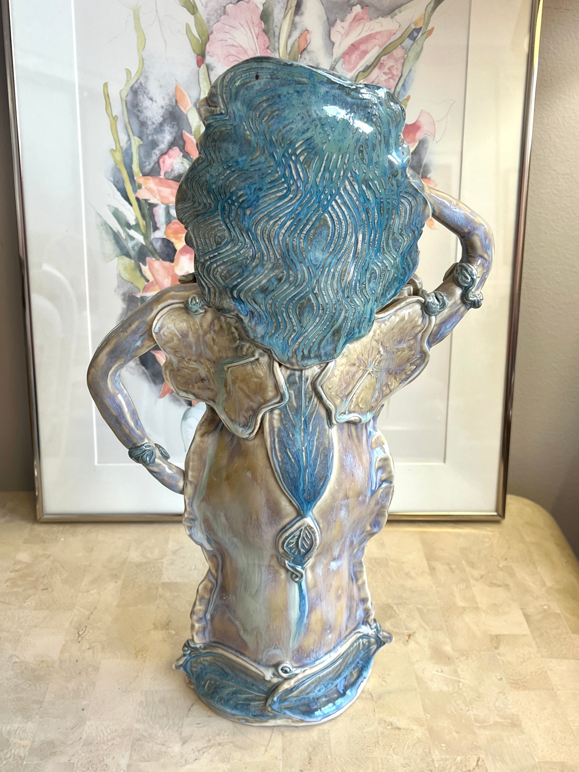Studio Pottery sculptural vase in the shape of a woman. Figure has a mermaid-like appearance and face is in the style of Picasso. Figure has two ceramic arms, with one on the hip that also works as a handle. Back of vase shows the back of the figure, including cascading hair. Wonderful pale blue and lavender glazing. By artist Terry Acker, signed “Acker”.