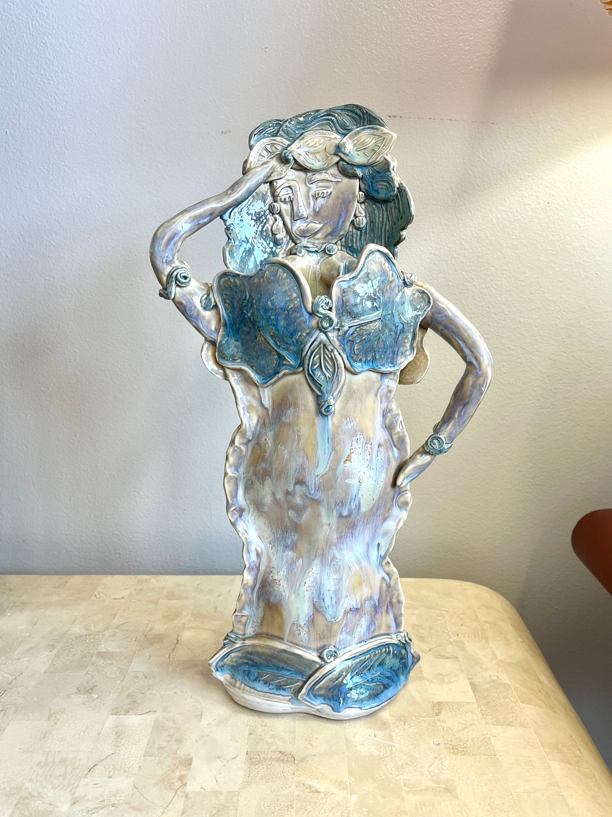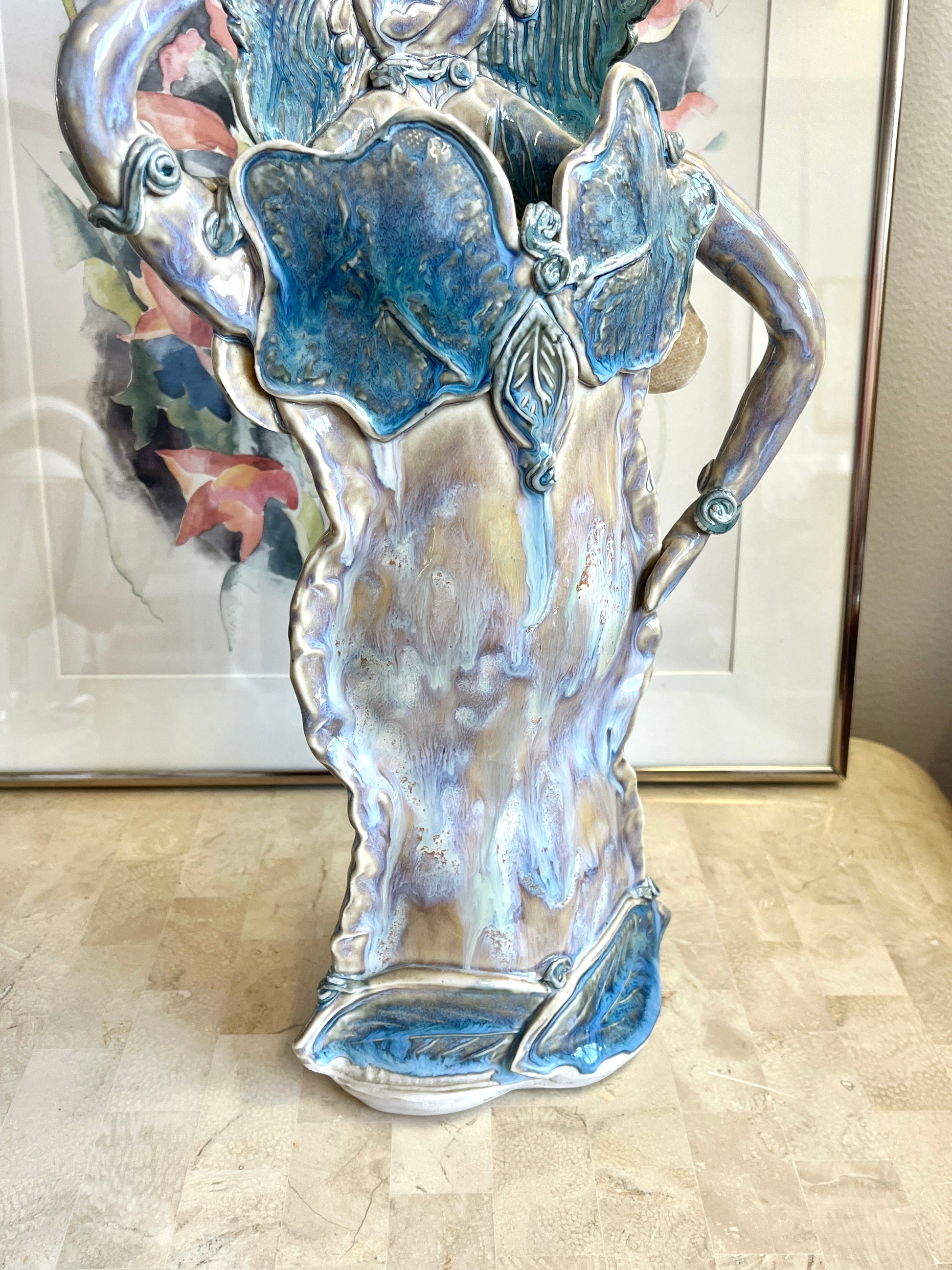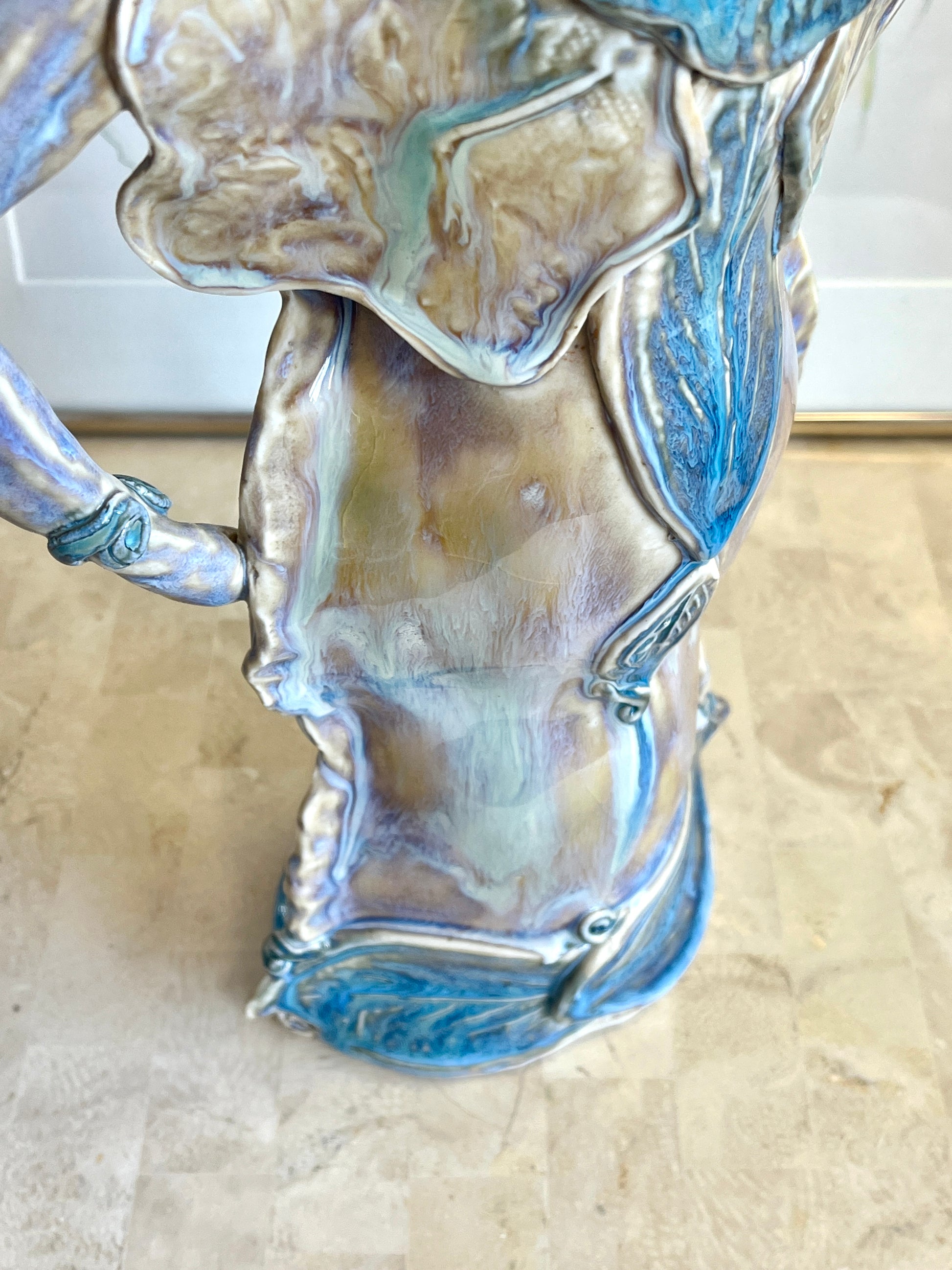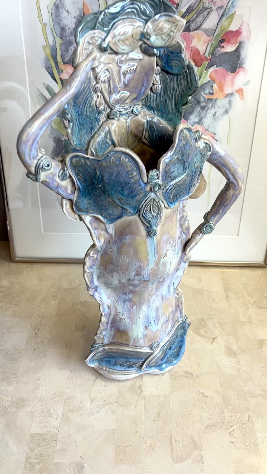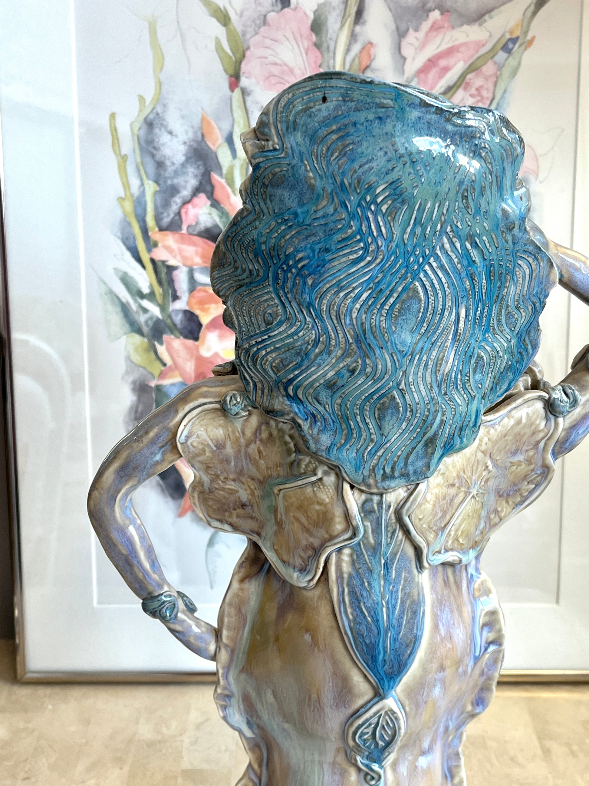 Studio Pottery sculptural vase in the shape of a woman. Figure has a mermaid-like appearance and face is in the style of Picasso. Figure has two ceramic arms, with one on the hip that also works as a handle. Back of vase shows the back of the figure, including cascading hair. Wonderful pale blue and lavender glazing. By artist Terry Acker, signed “Acker”.