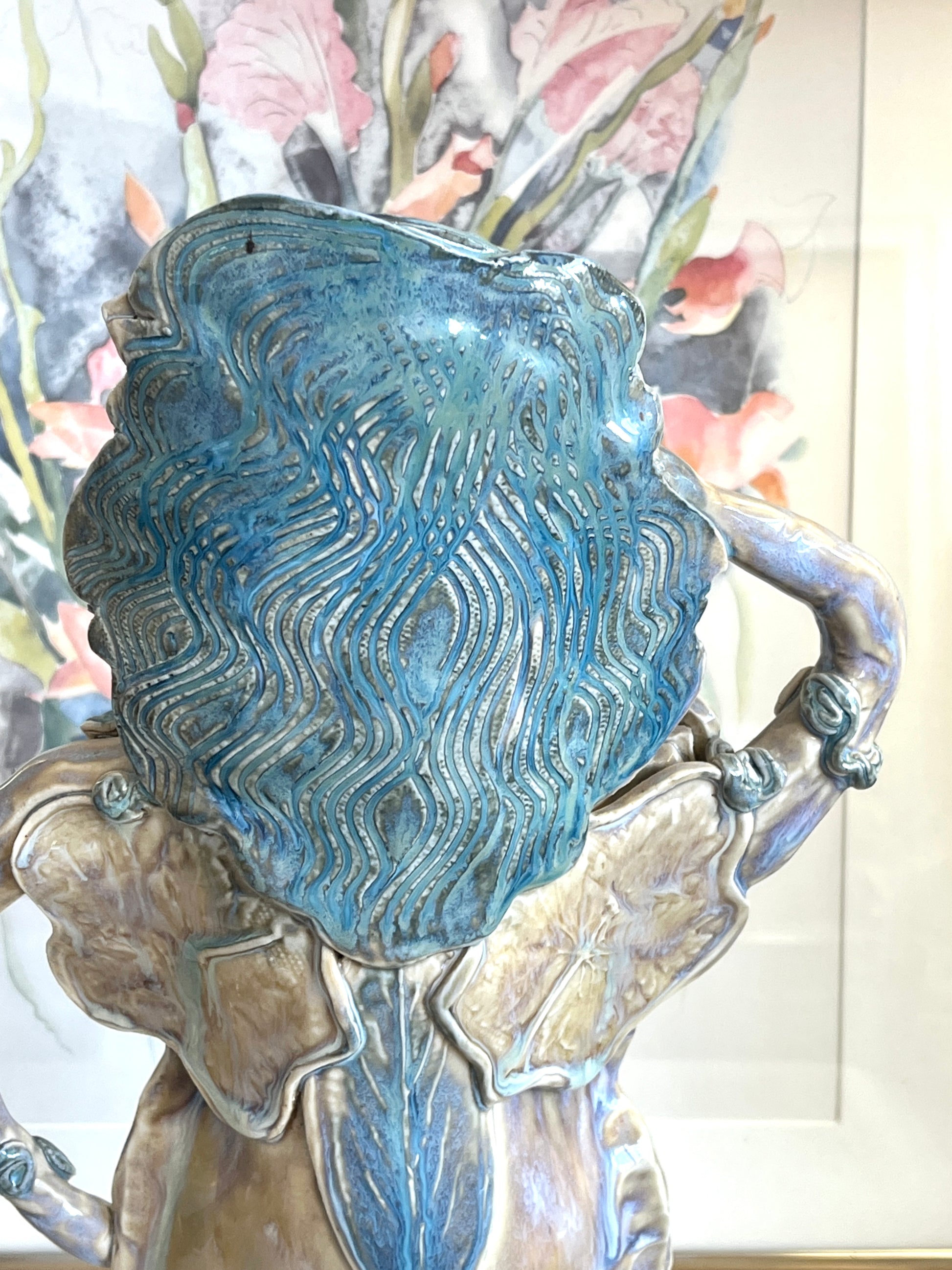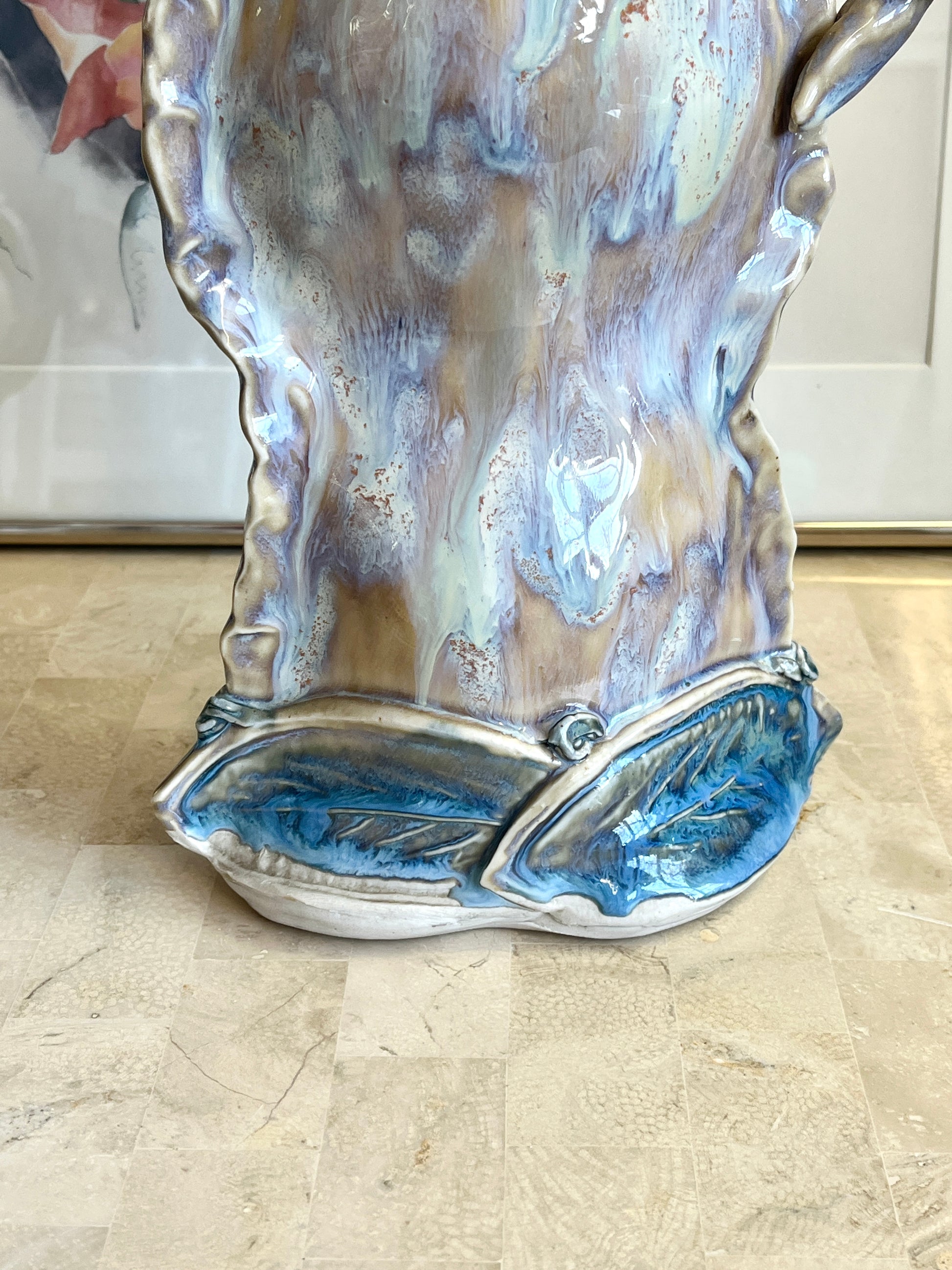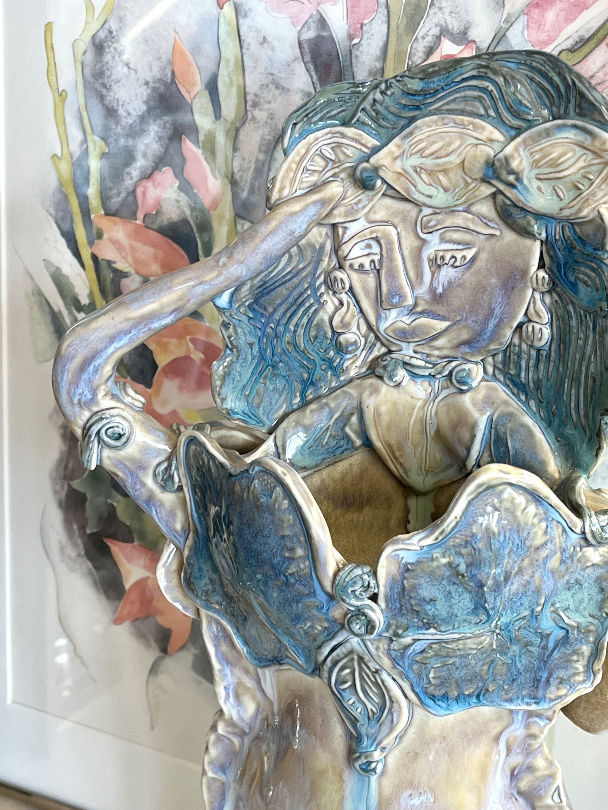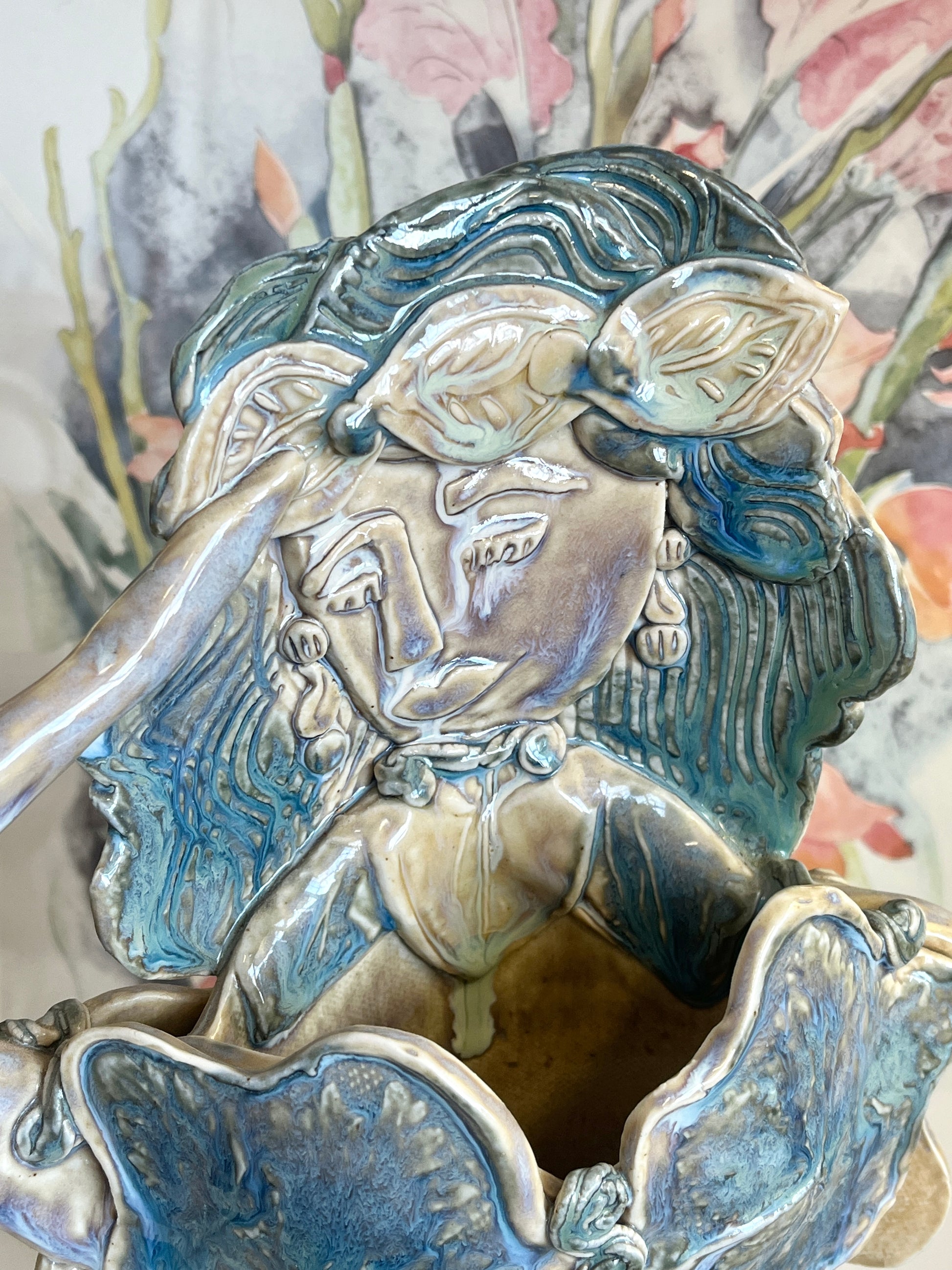 Studio Pottery sculptural vase in the shape of a woman. Figure has a mermaid-like appearance and face is in the style of Picasso. Figure has two ceramic arms, with one on the hip that also works as a handle. Back of vase shows the back of the figure, including cascading hair. Wonderful pale blue and lavender glazing. By artist Terry Acker, signed “Acker”.