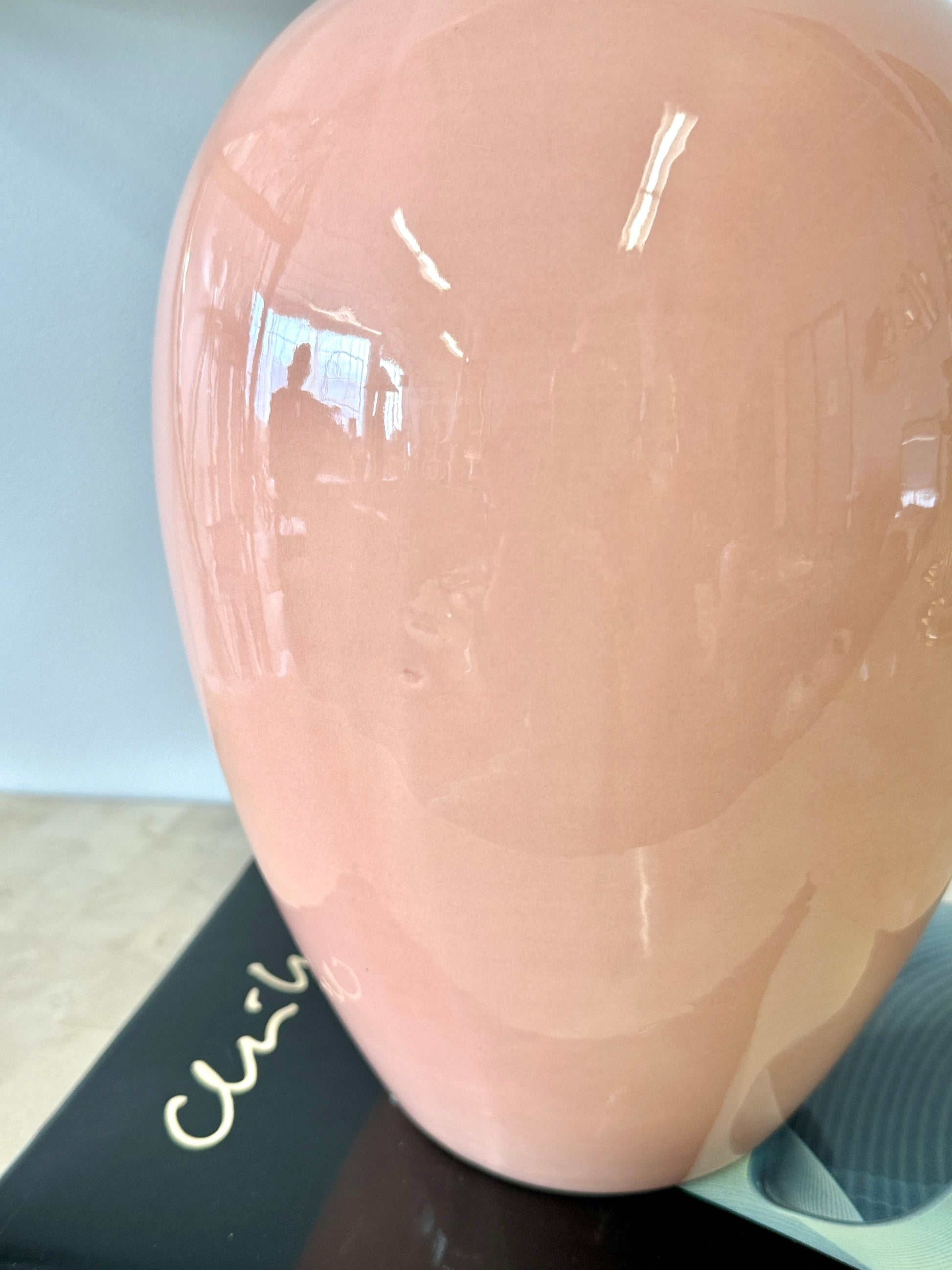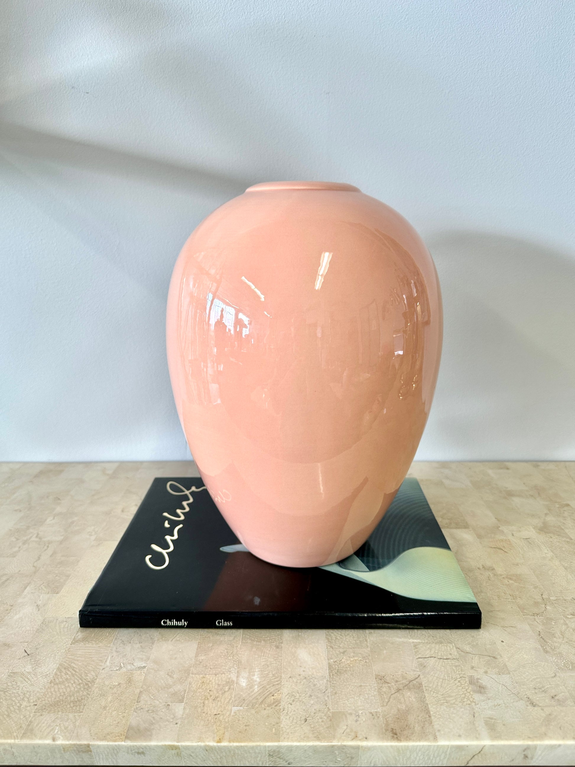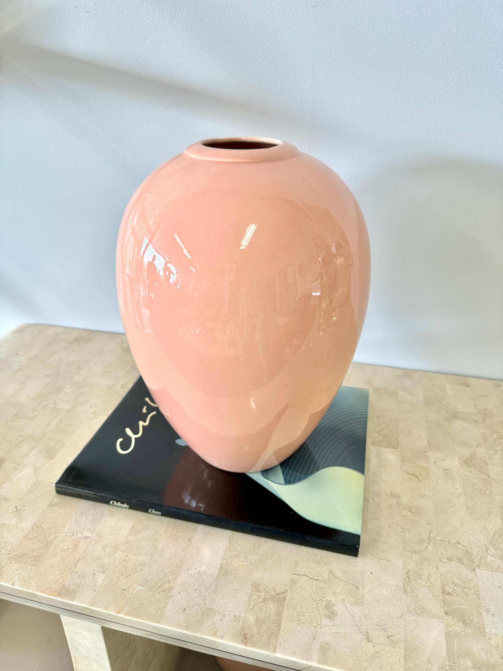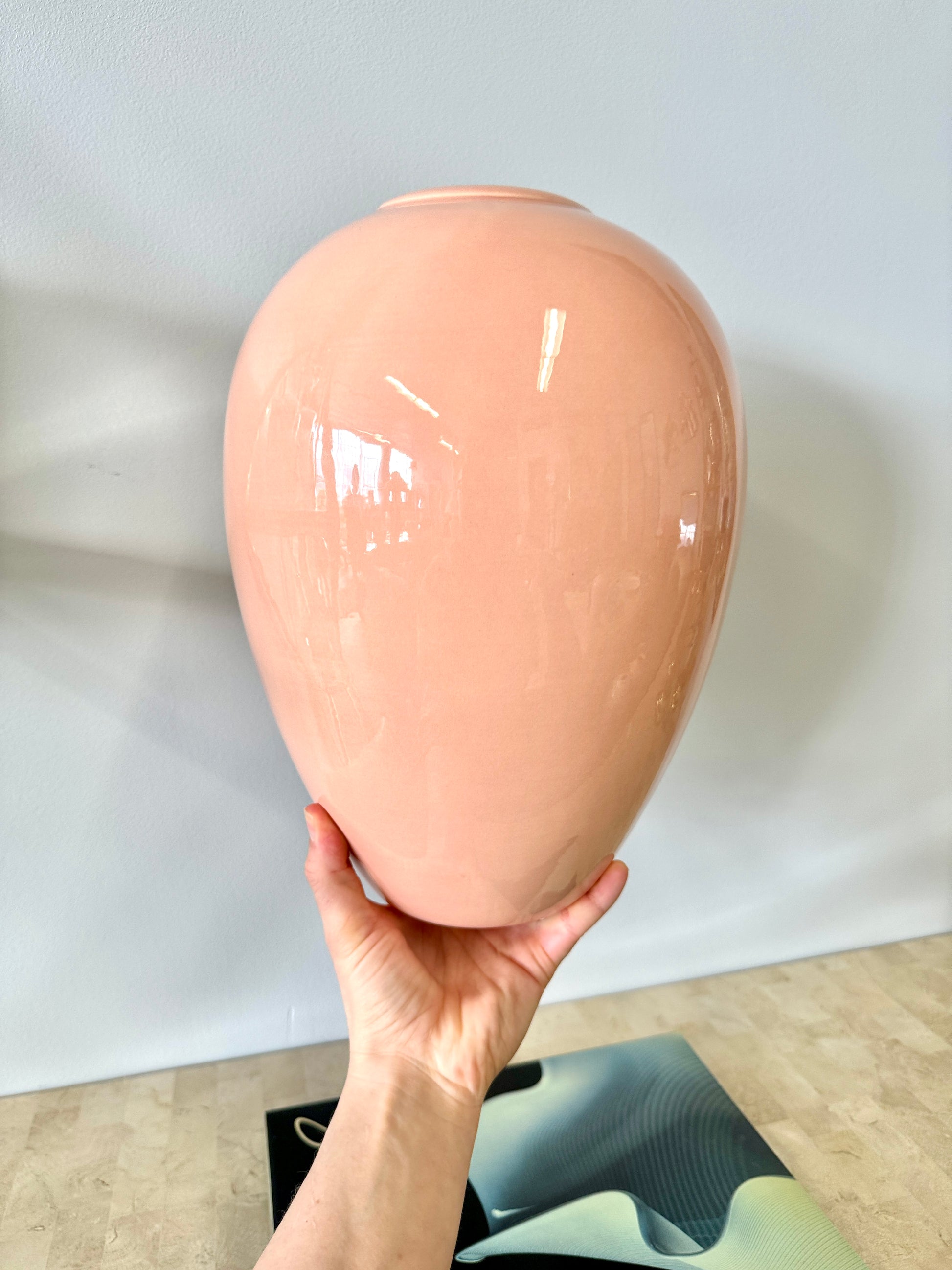 Wonderful vintage 1980s deco style Royal Haeger vase. High gloss glaze that varies from peach to light pink. Beautiful curved urn shape.