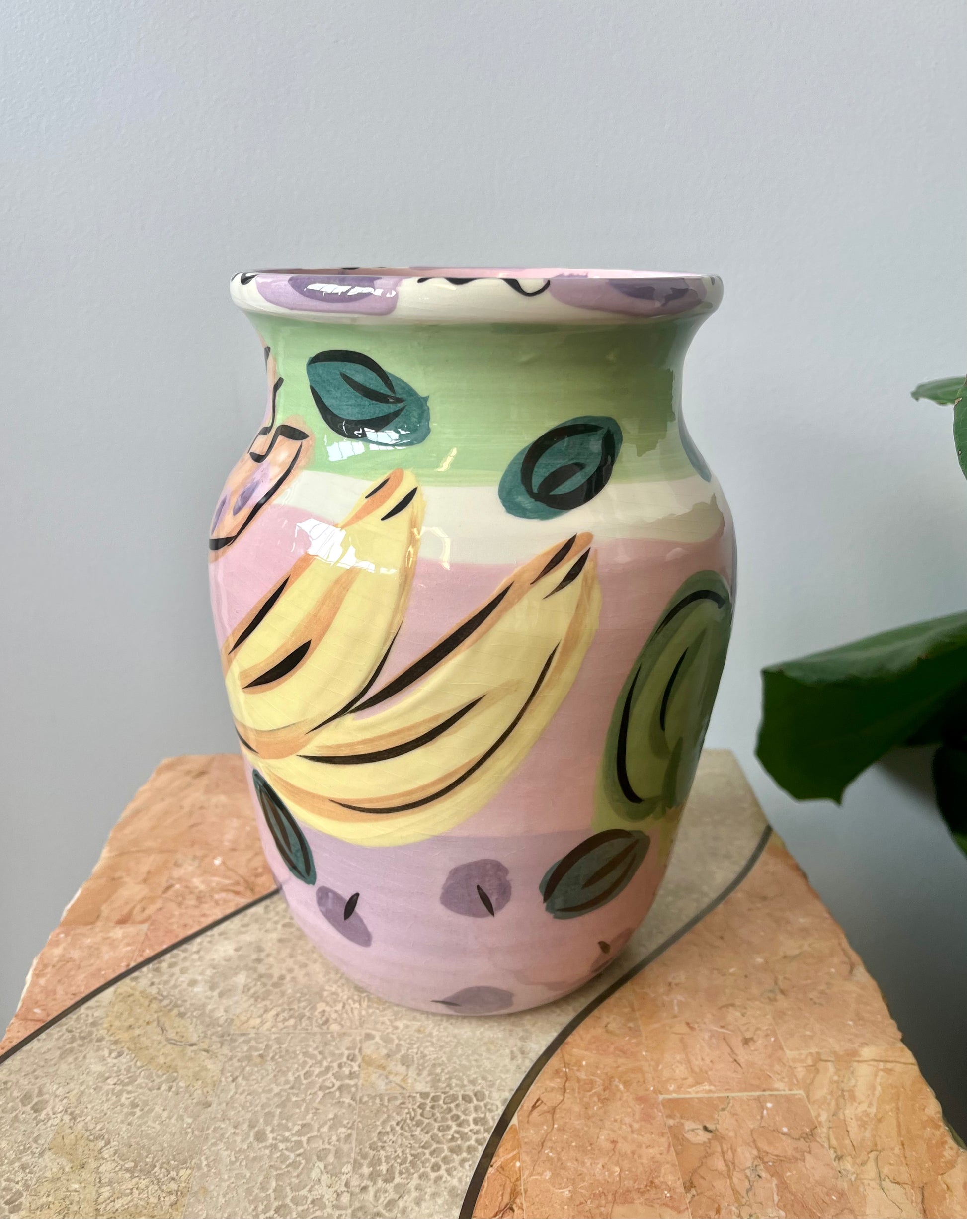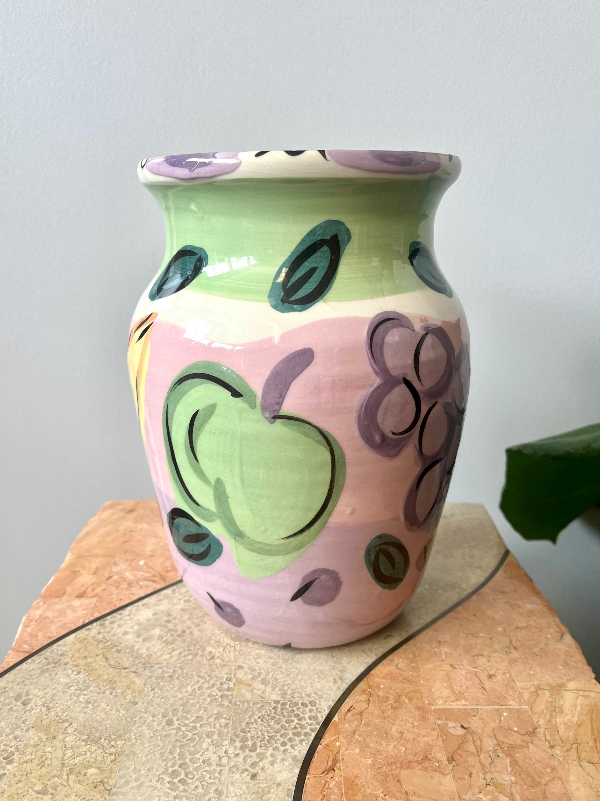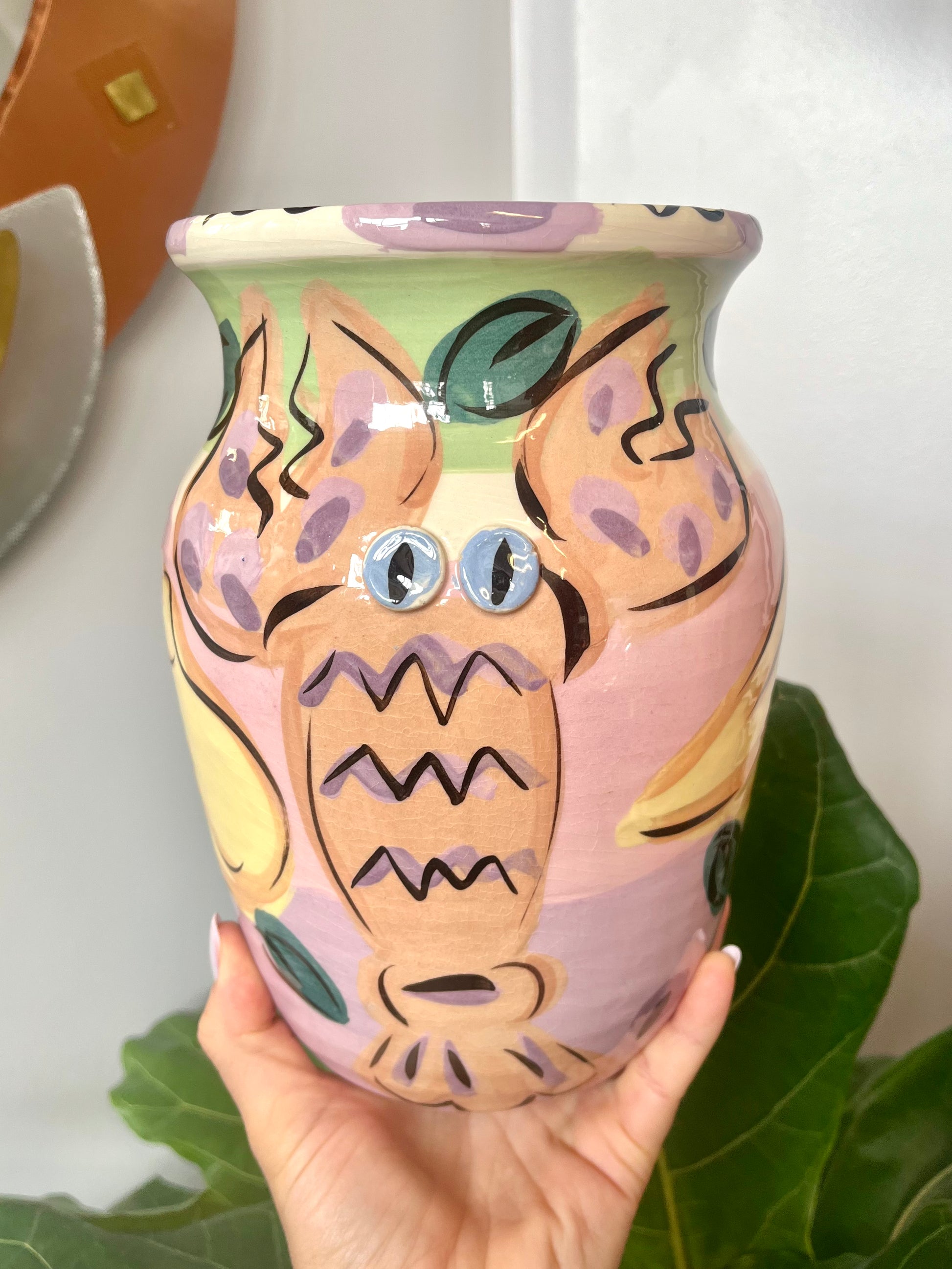 Wonderful vintage 1980s Susan Painter studio pottery lobster vase. Handpainted with fruit motif and a large lobster with applied ceramic eyes.