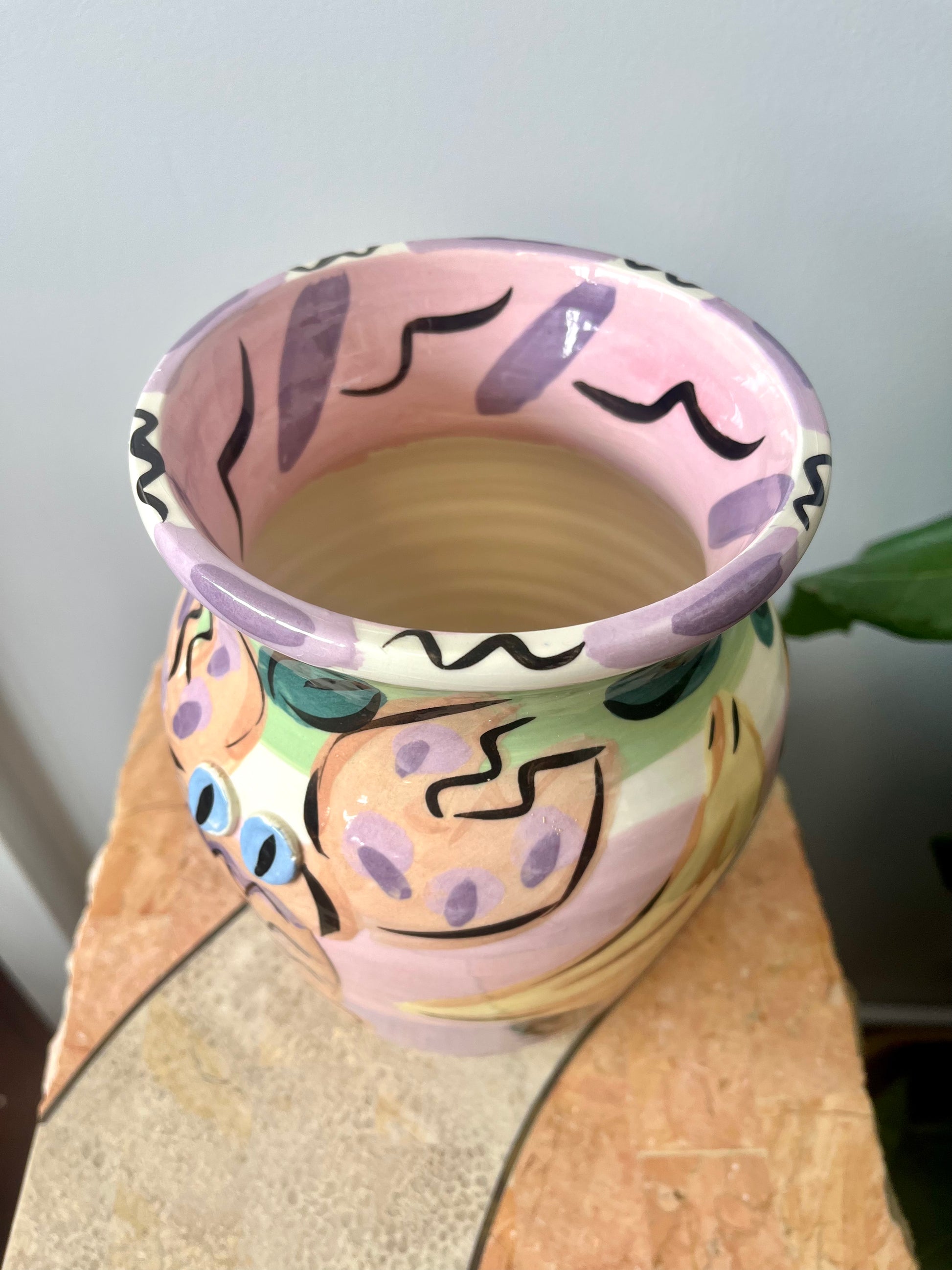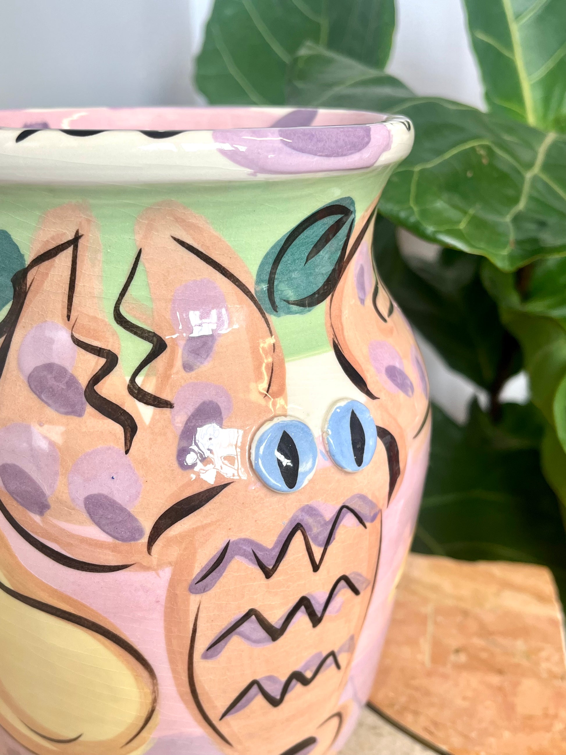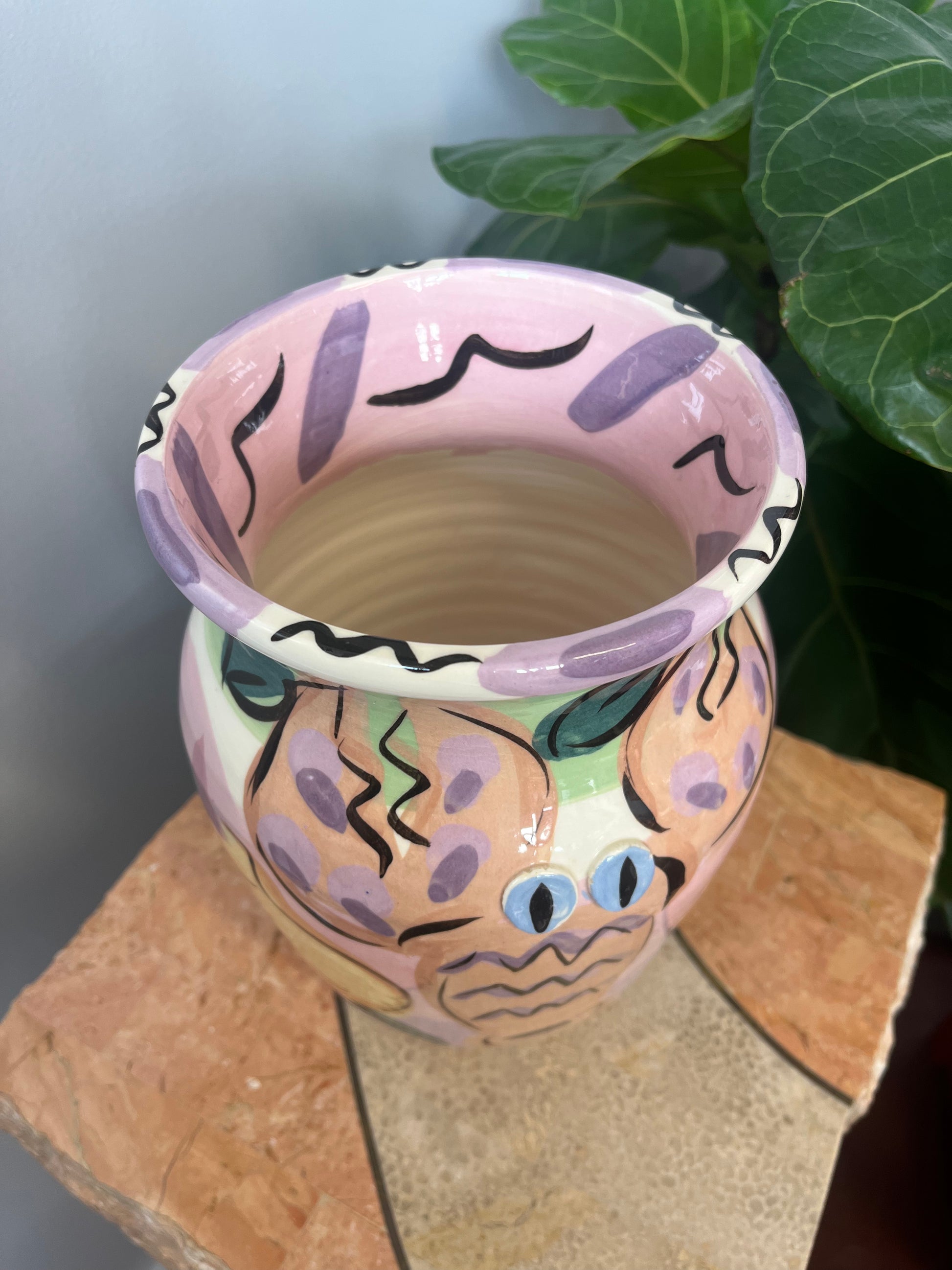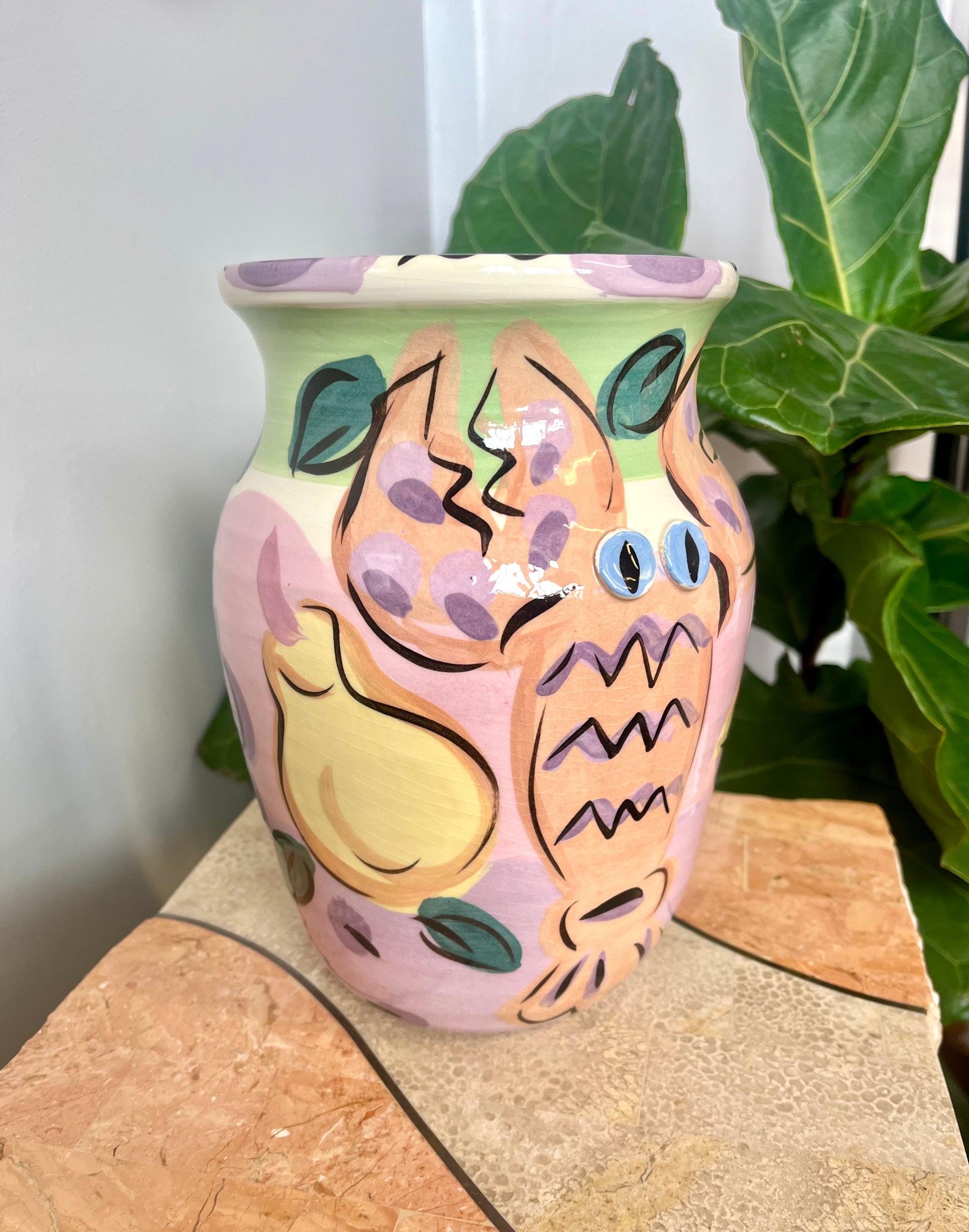 Wonderful vintage 1980s Susan Painter studio pottery lobster vase. Handpainted with fruit motif and a large lobster with applied ceramic eyes.