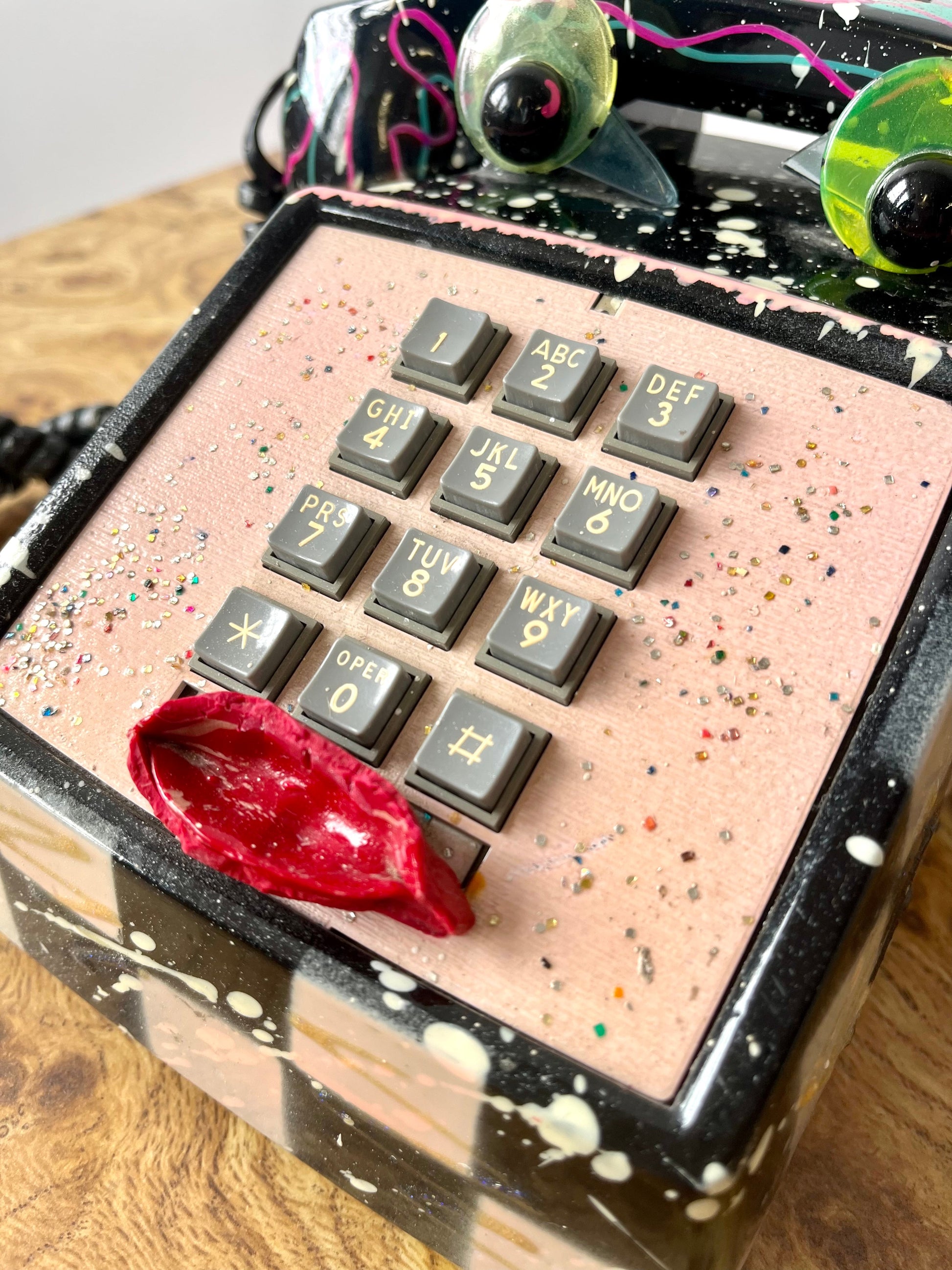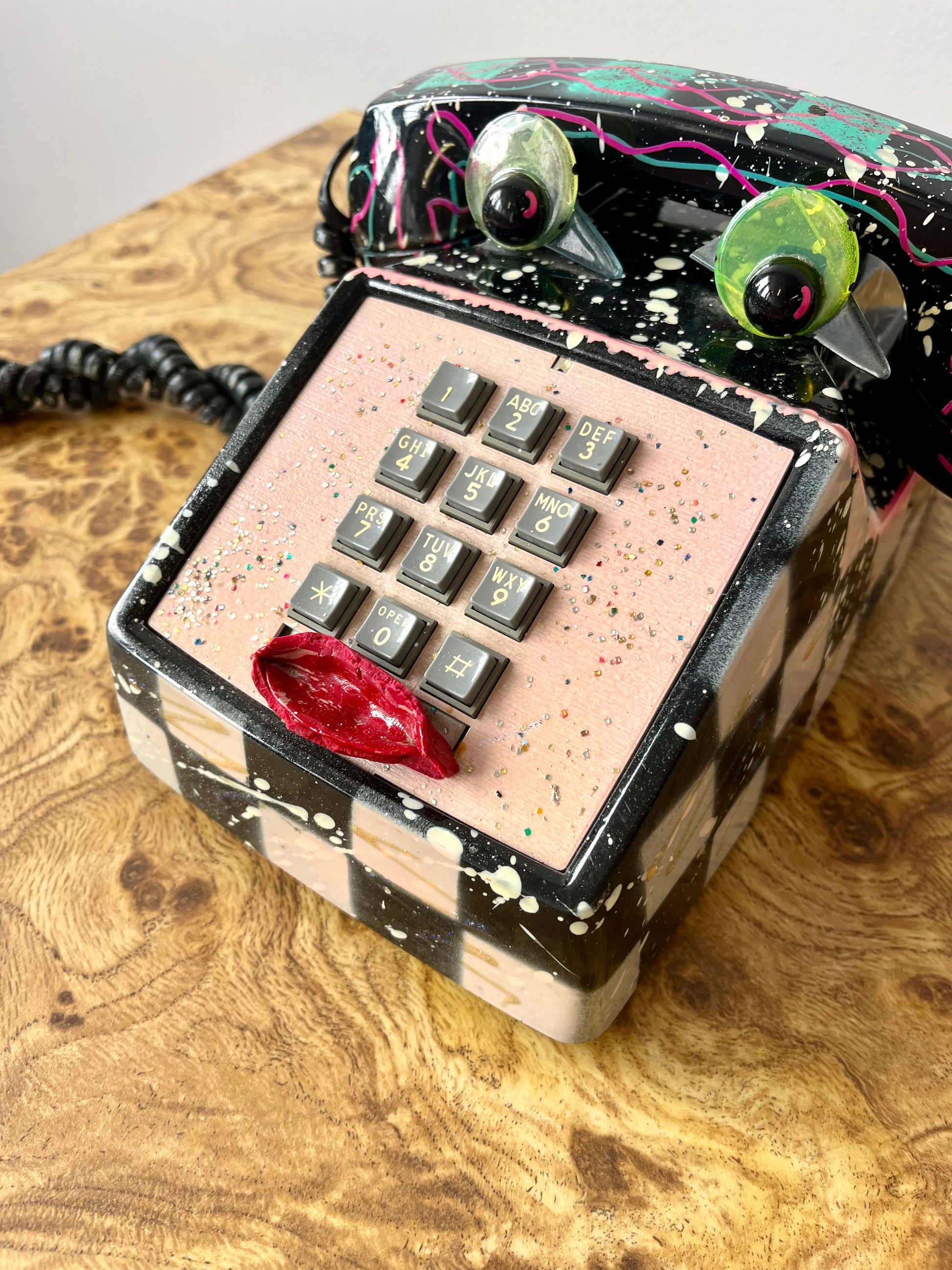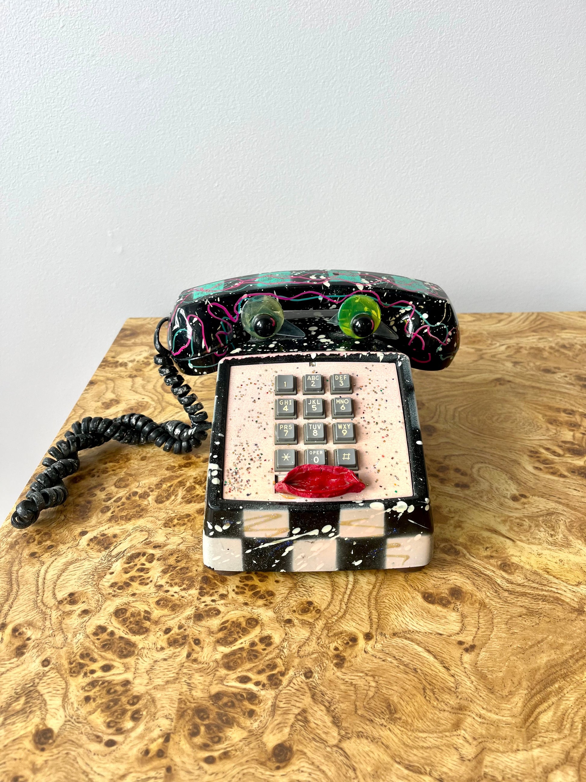 Utterly fabulous vintage 1990 Hollis Fingold painted telephone “Phoneys” sculpture. Very rare and the mother of all statement piece, with large plastic googly eyes and puckering red lips. Signed on back with sticker on bottom.