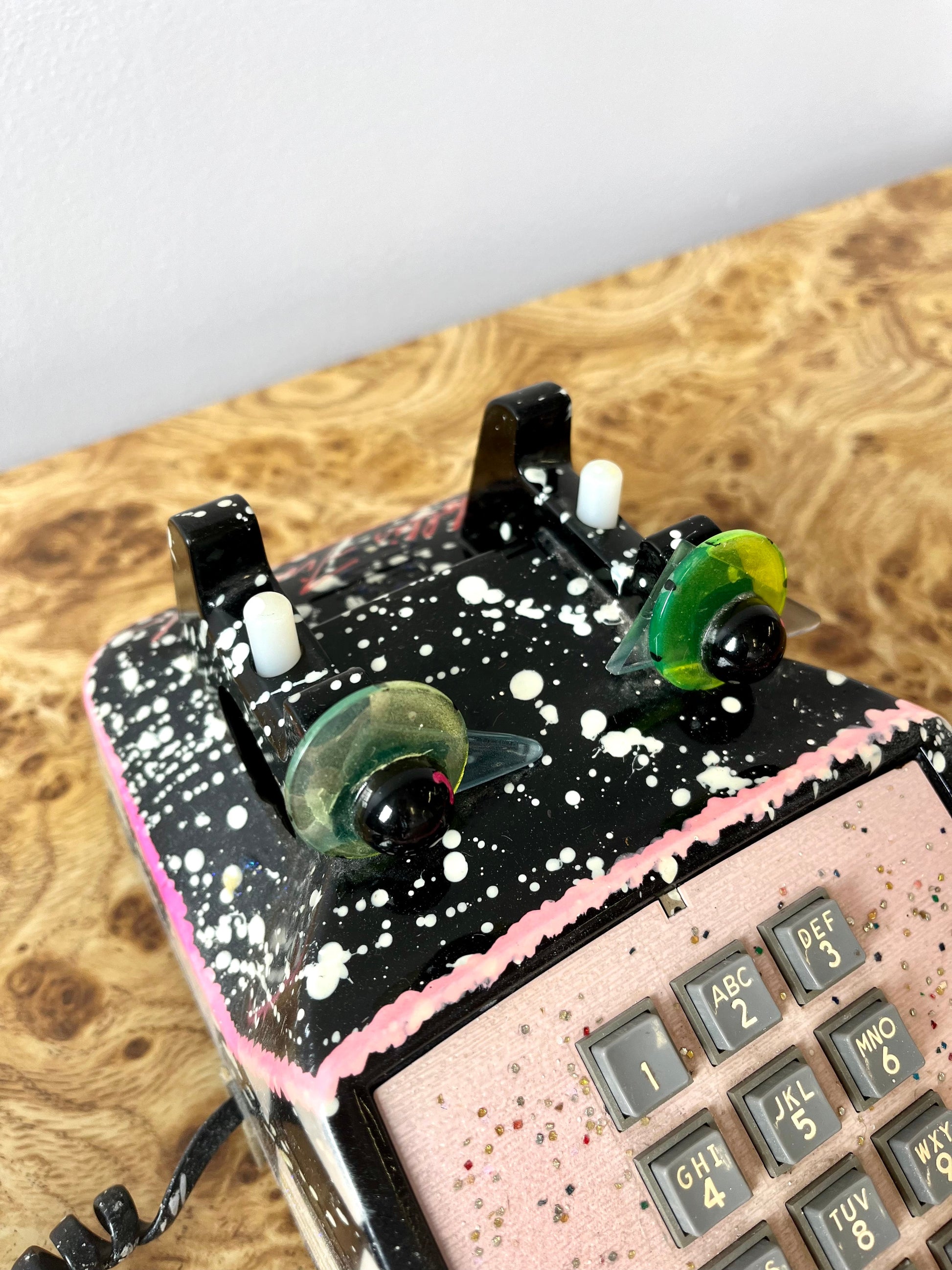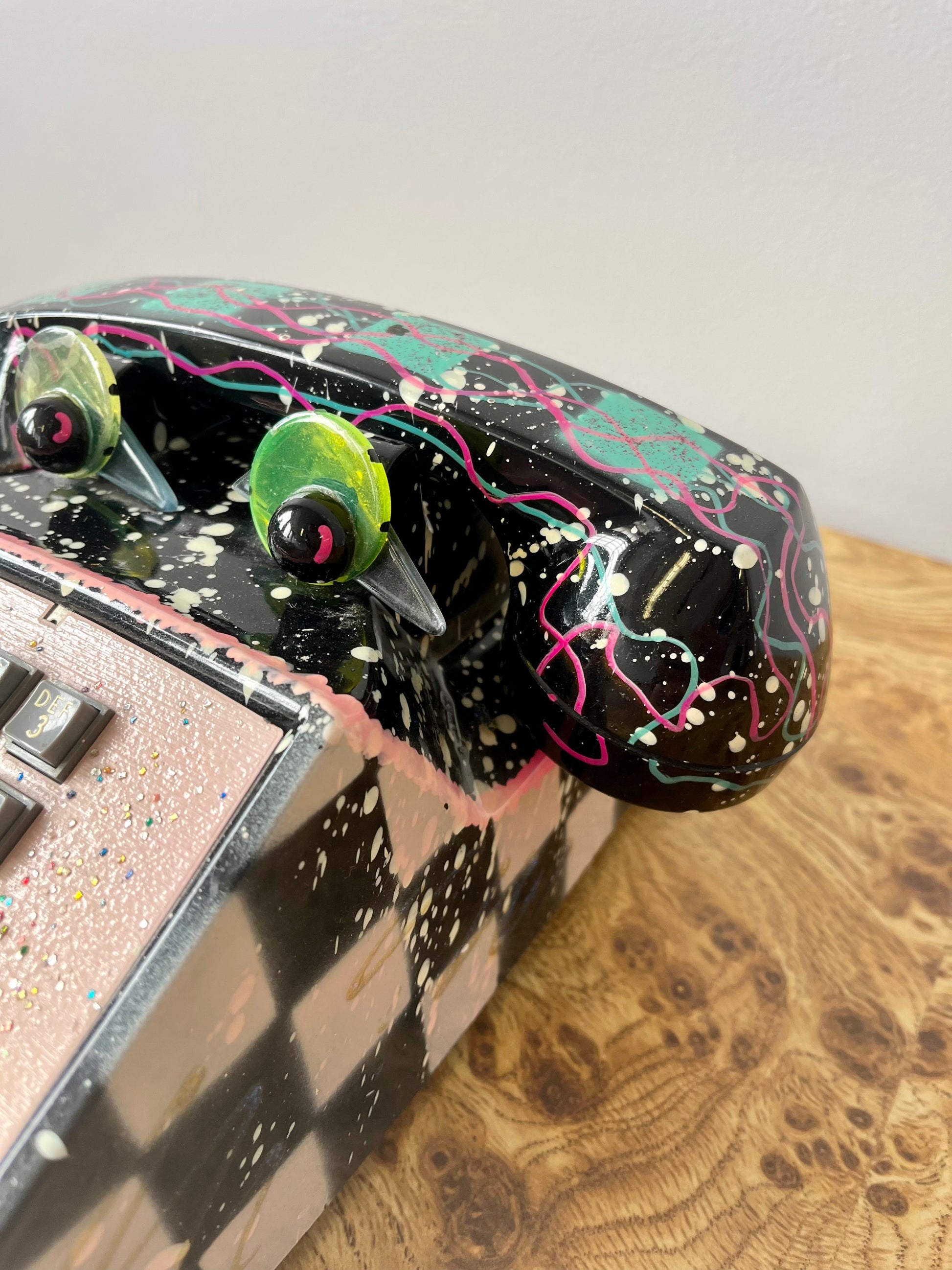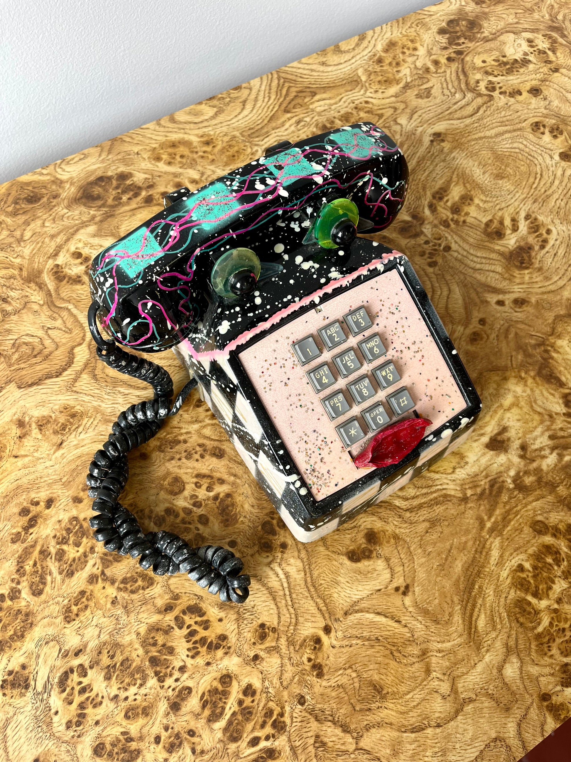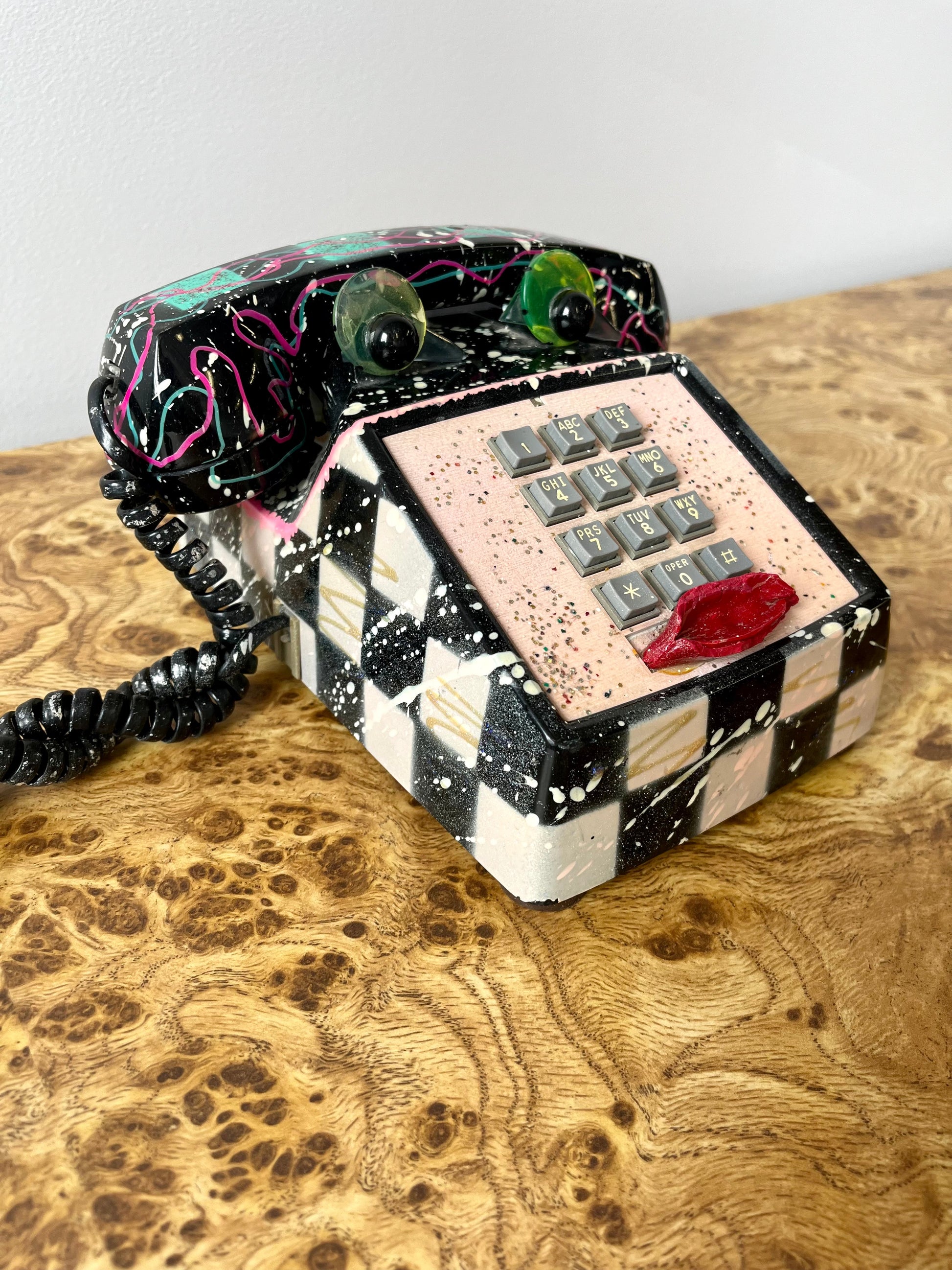 Utterly fabulous vintage 1990 Hollis Fingold painted telephone “Phoneys” sculpture. Very rare and the mother of all statement piece, with large plastic googly eyes and puckering red lips. Signed on back with sticker on bottom.
