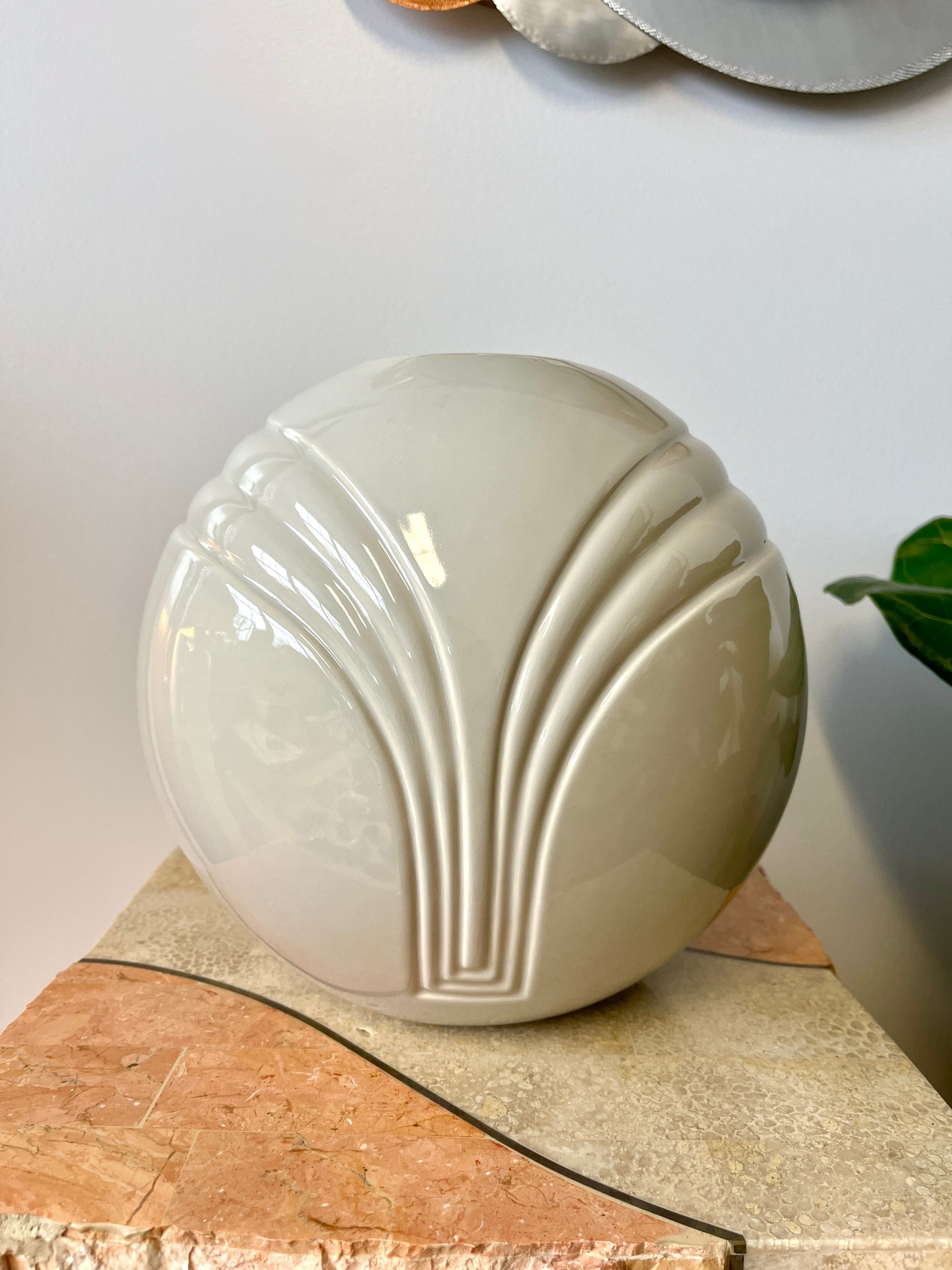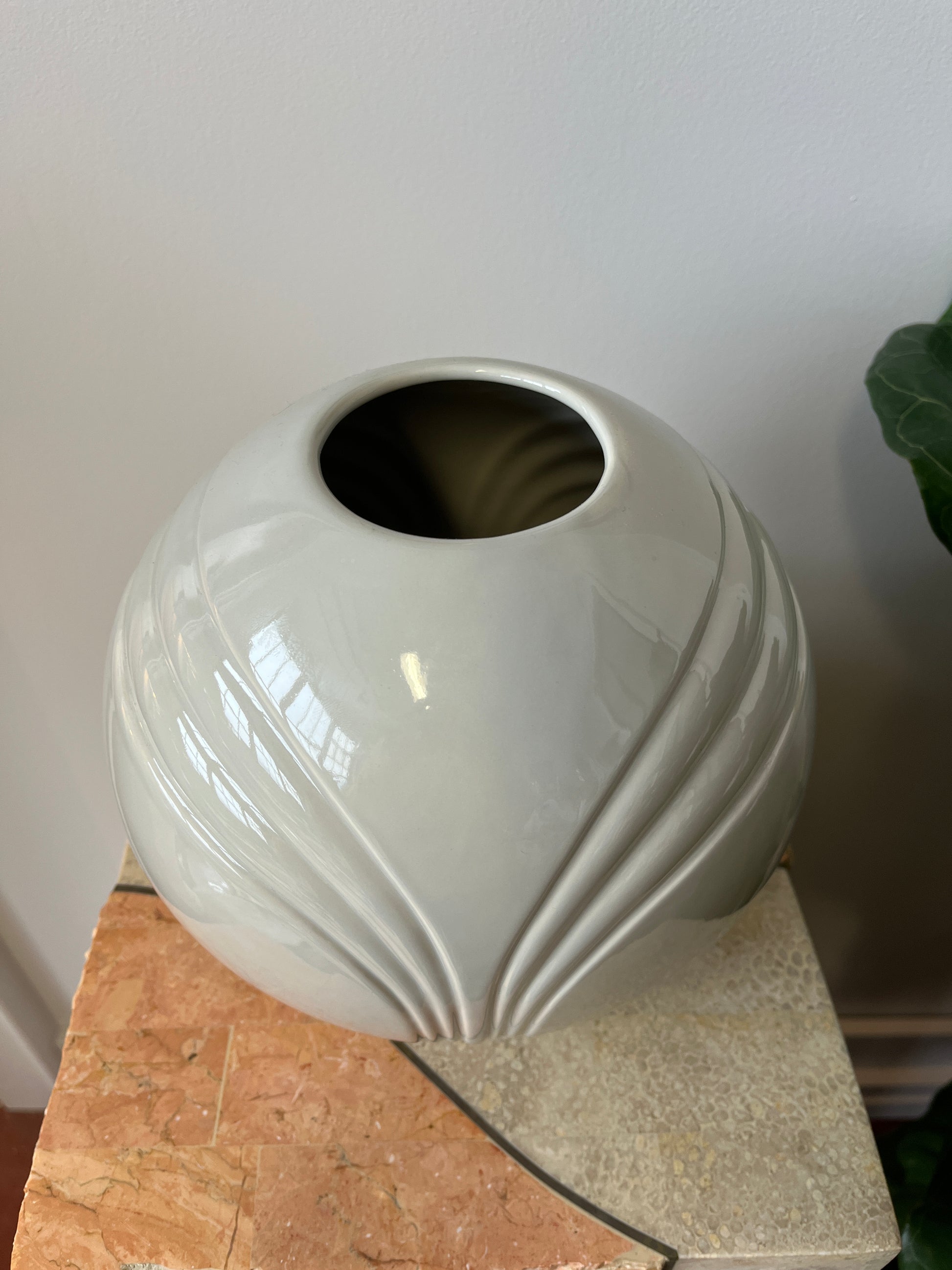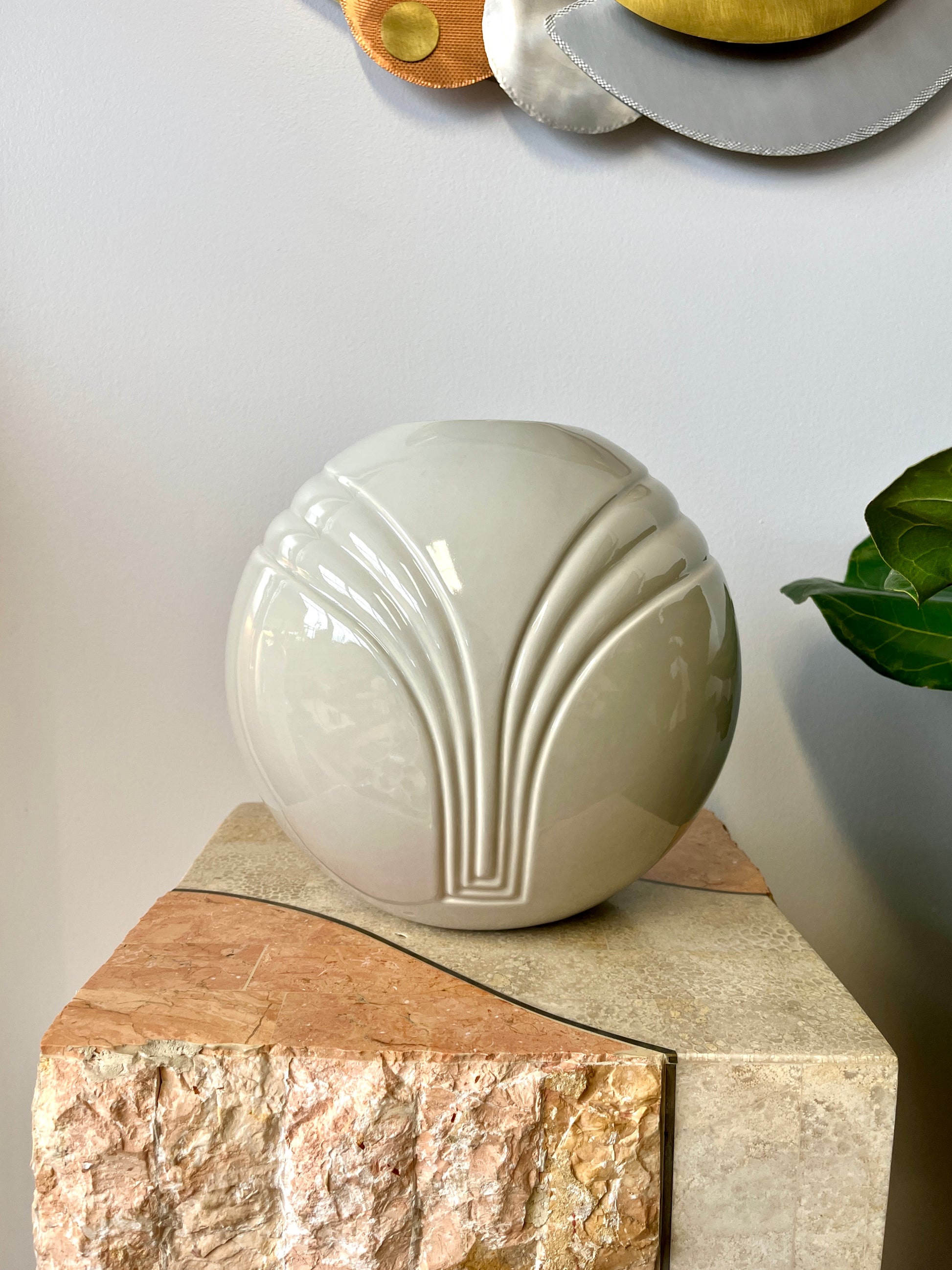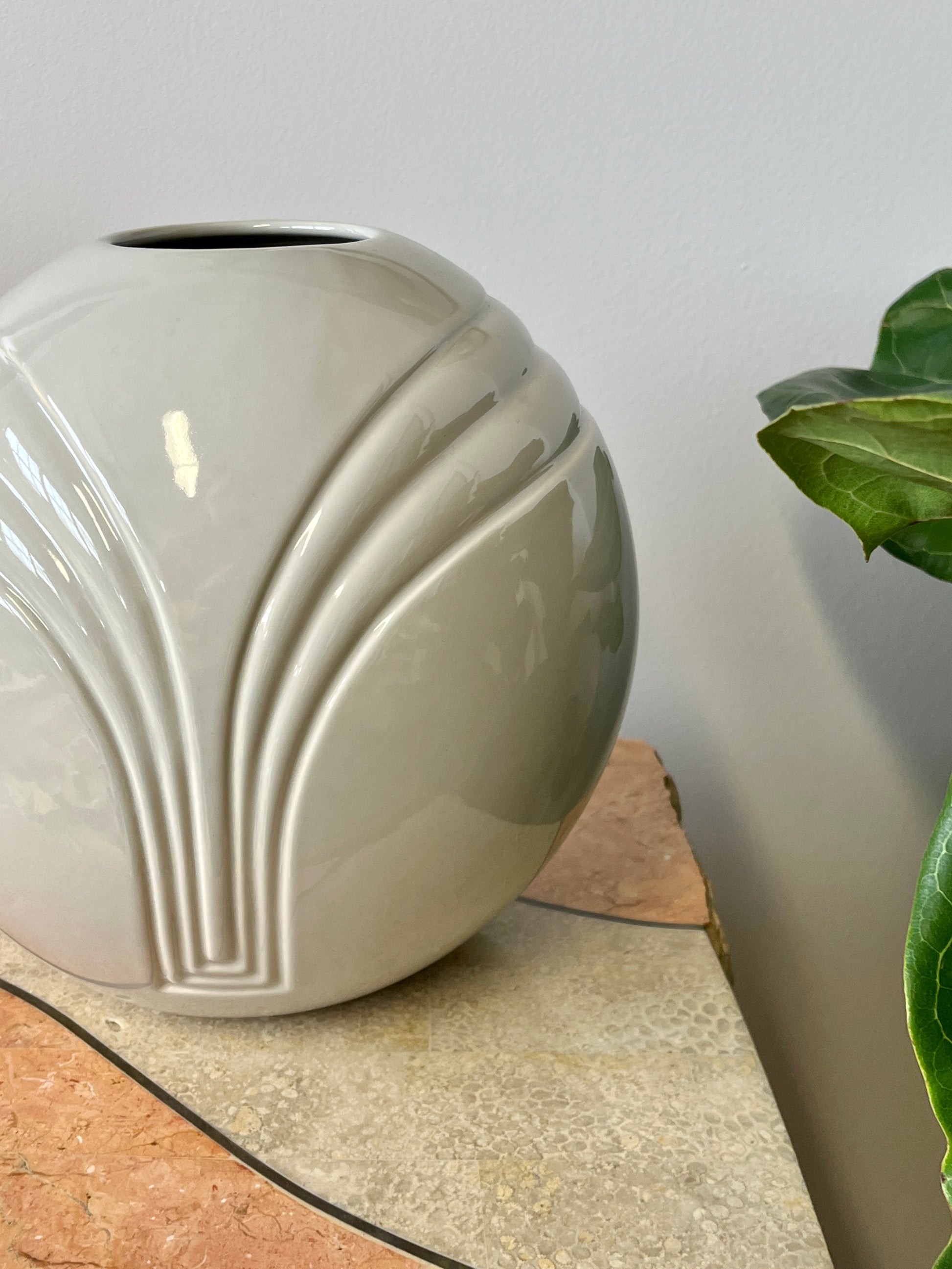 Beautiful and sleek pale grey vintage 1980s Deco sphere vase. Glossy and smooth. Art Deco-style embellishments.