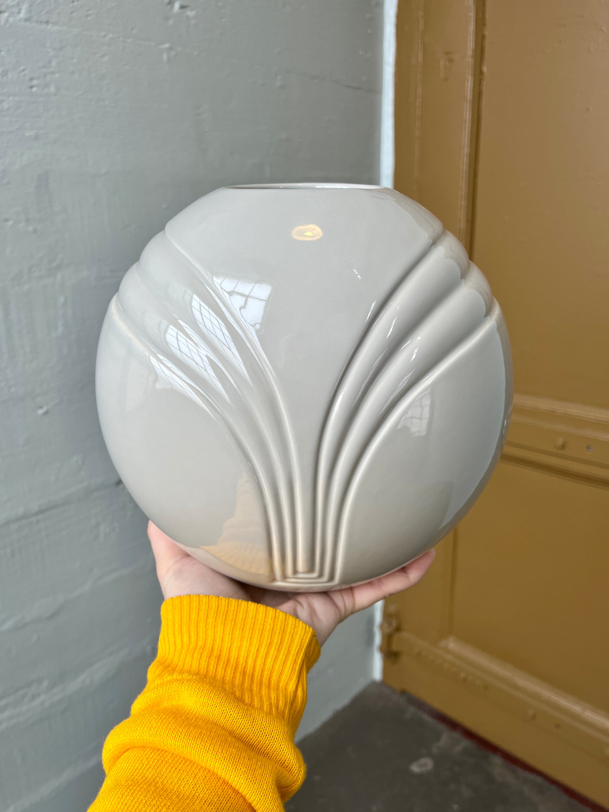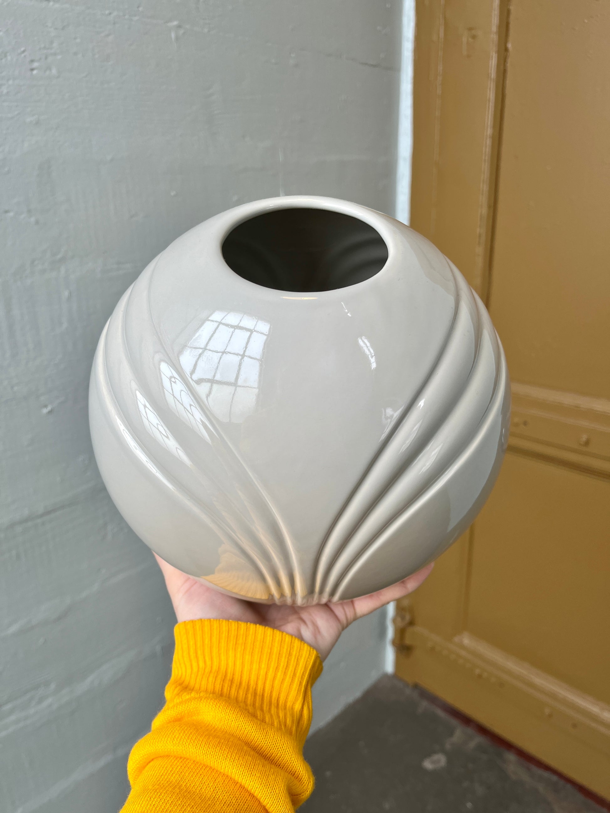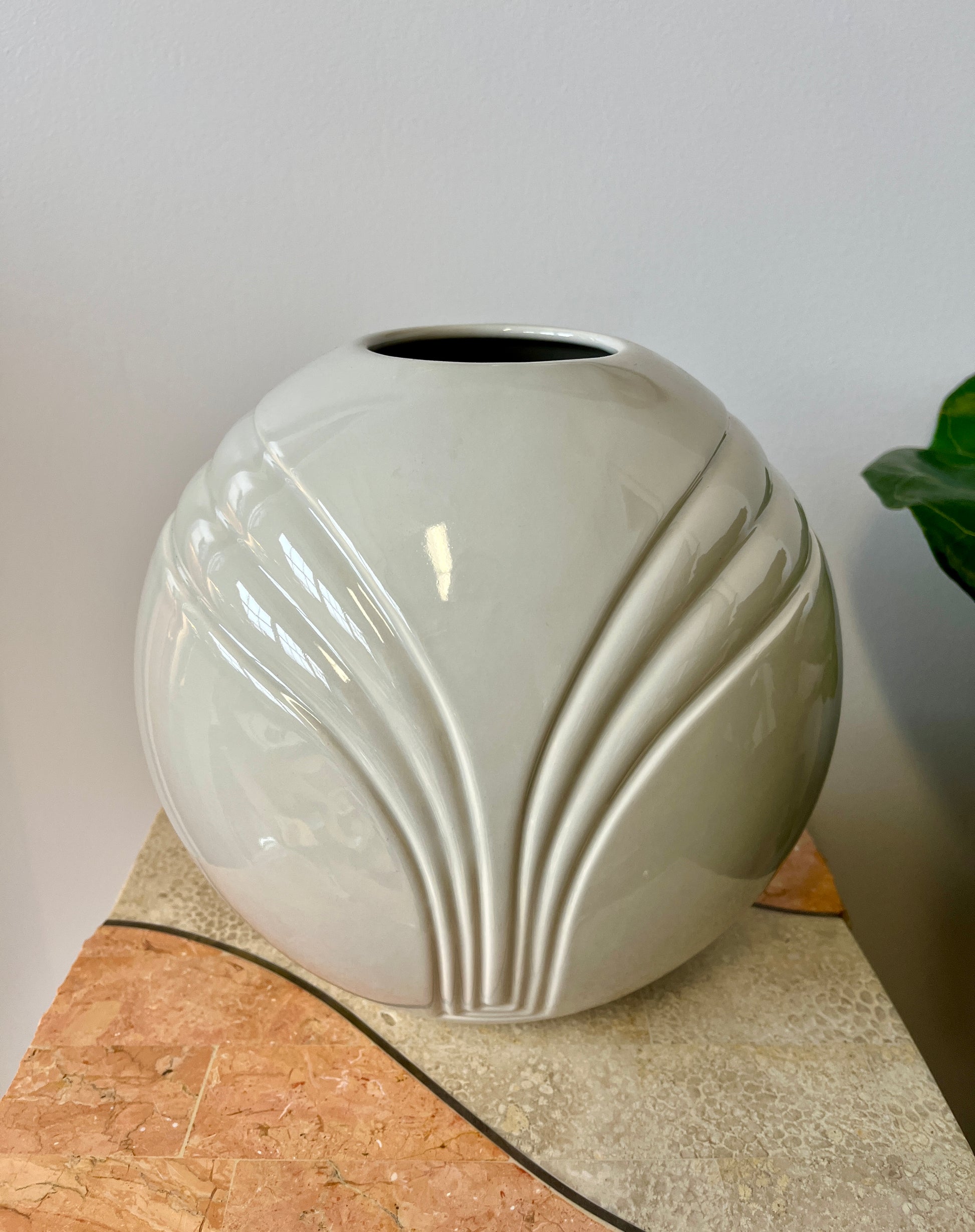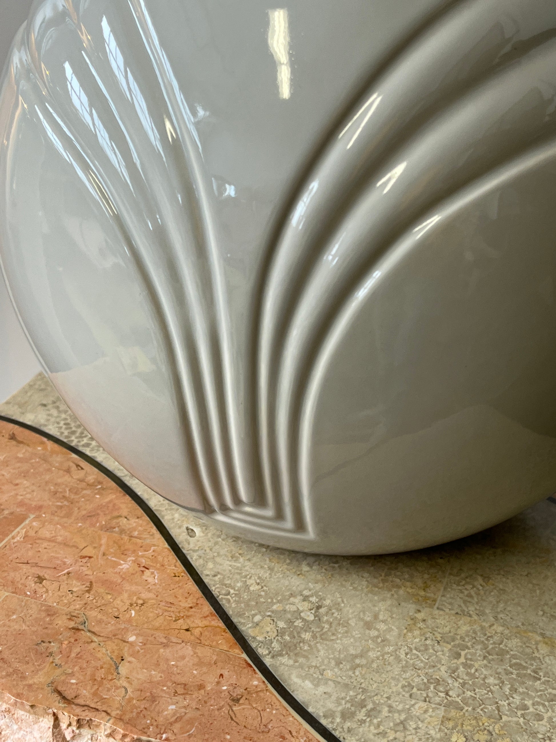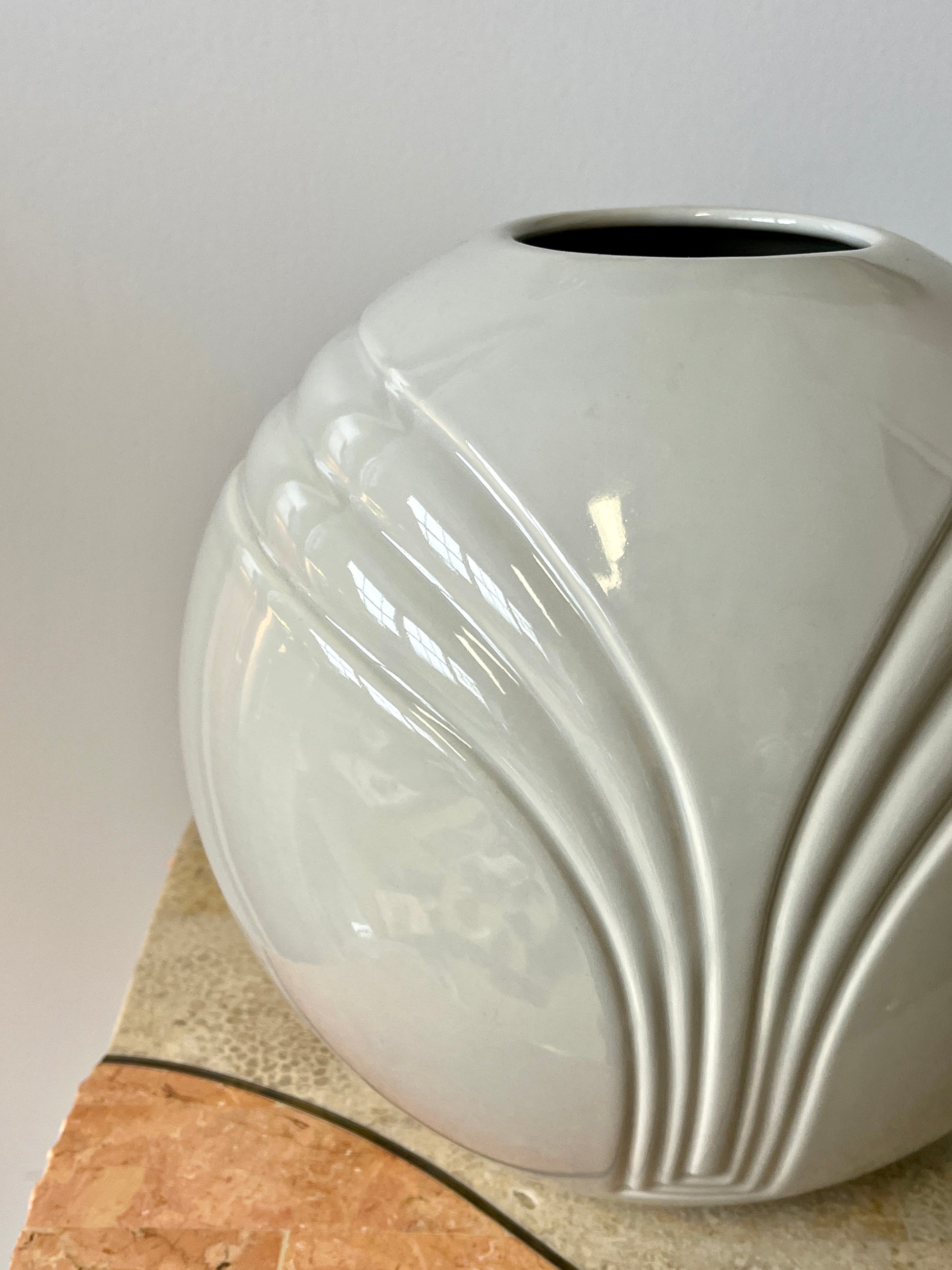 Beautiful and sleek pale grey vintage 1980s Deco sphere vase. Glossy and smooth. Art Deco-style embellishments.