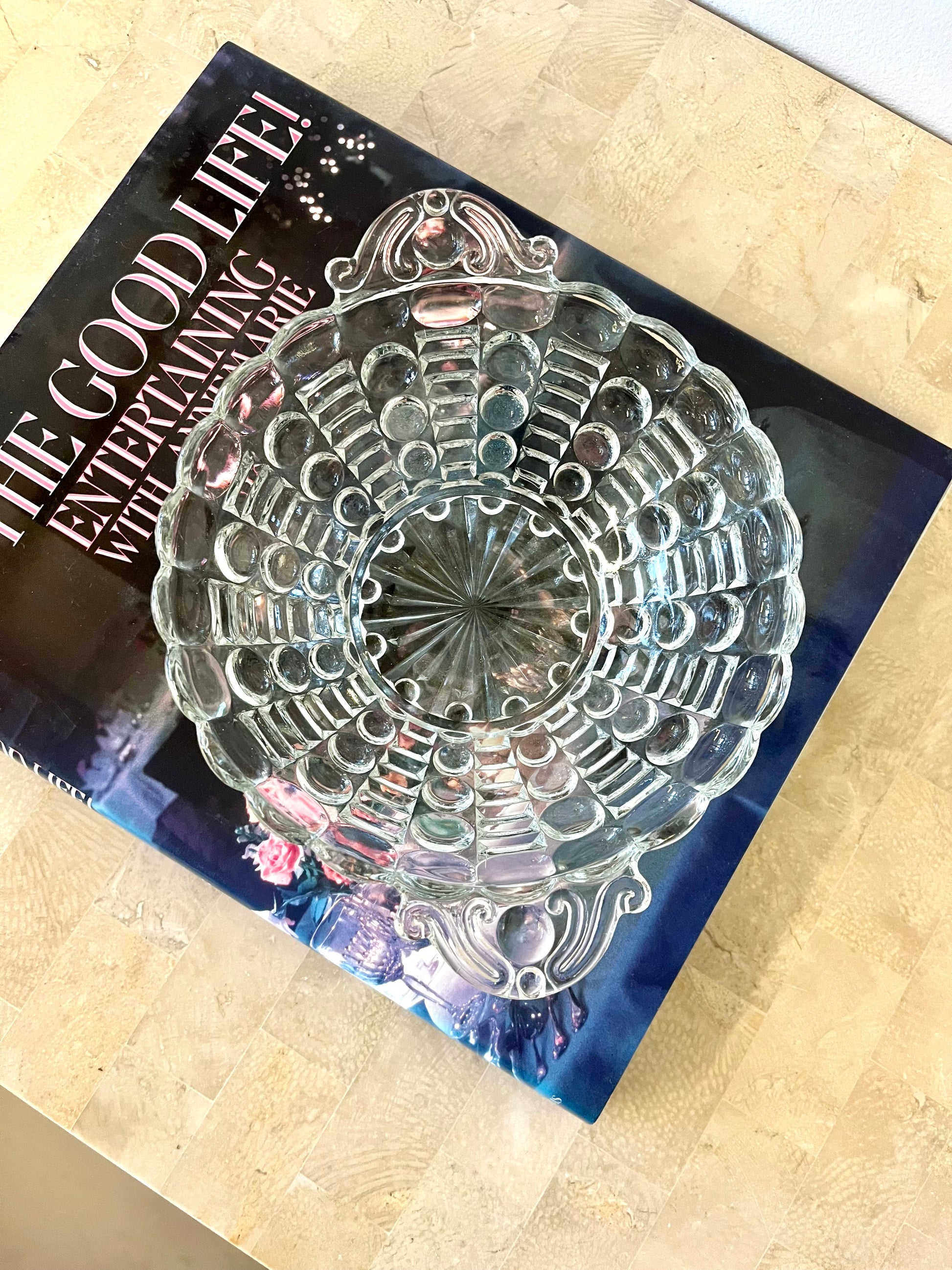 Lovely vintage Anchor Hocking bubble glass trinket dish with embellished handles. Classic design, reflective glass, charming piece.