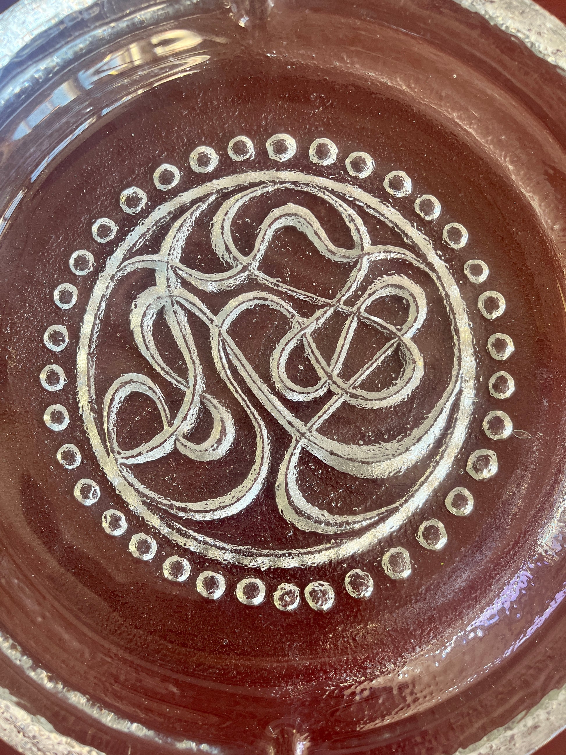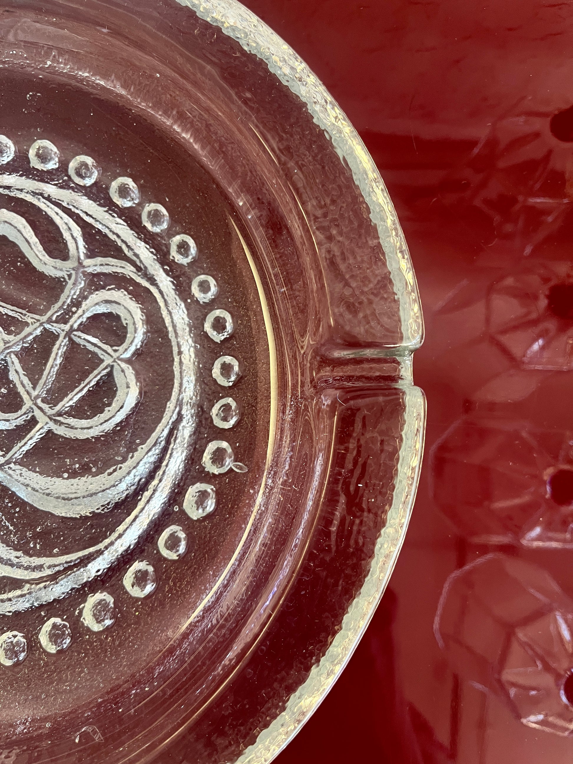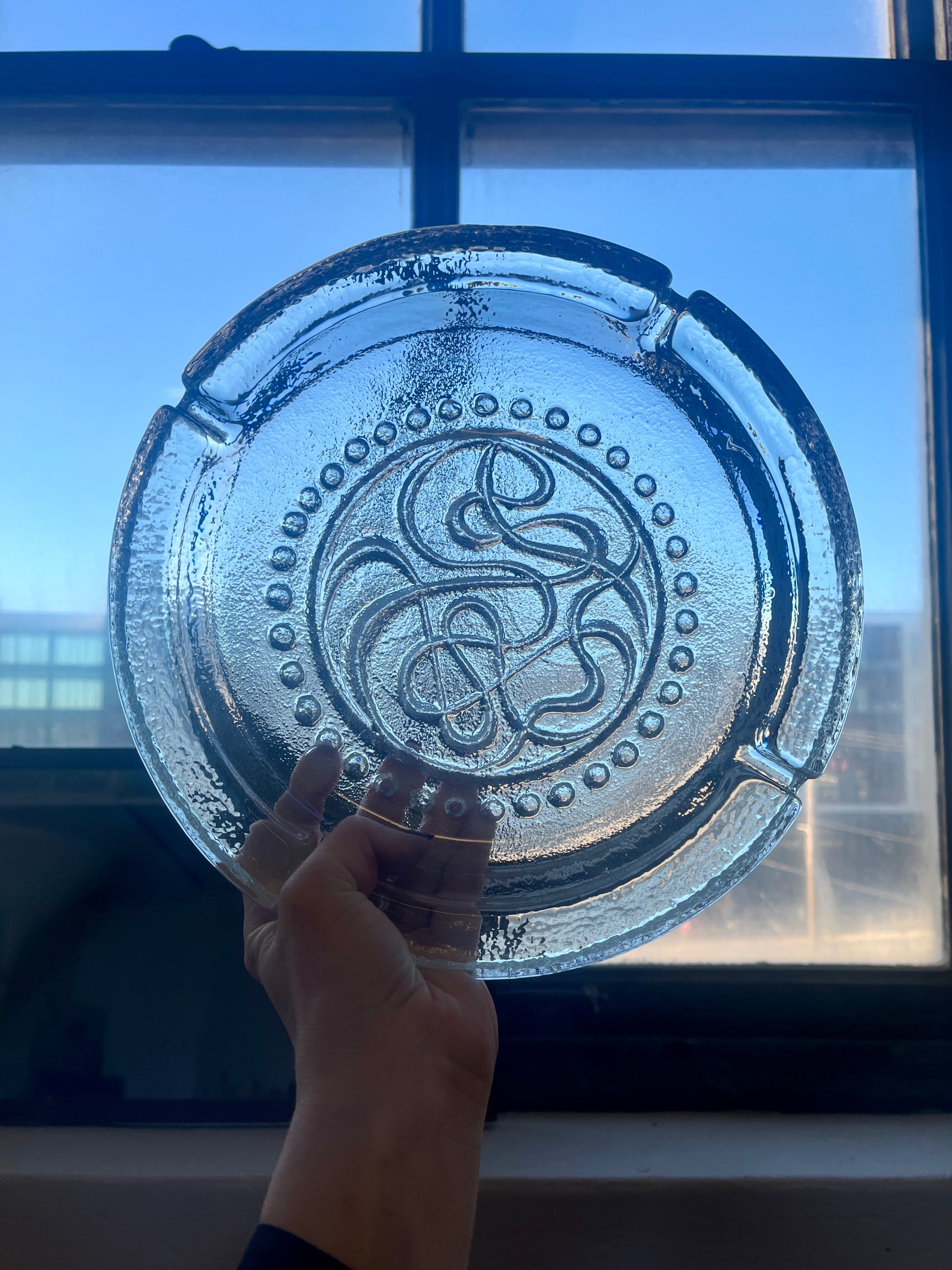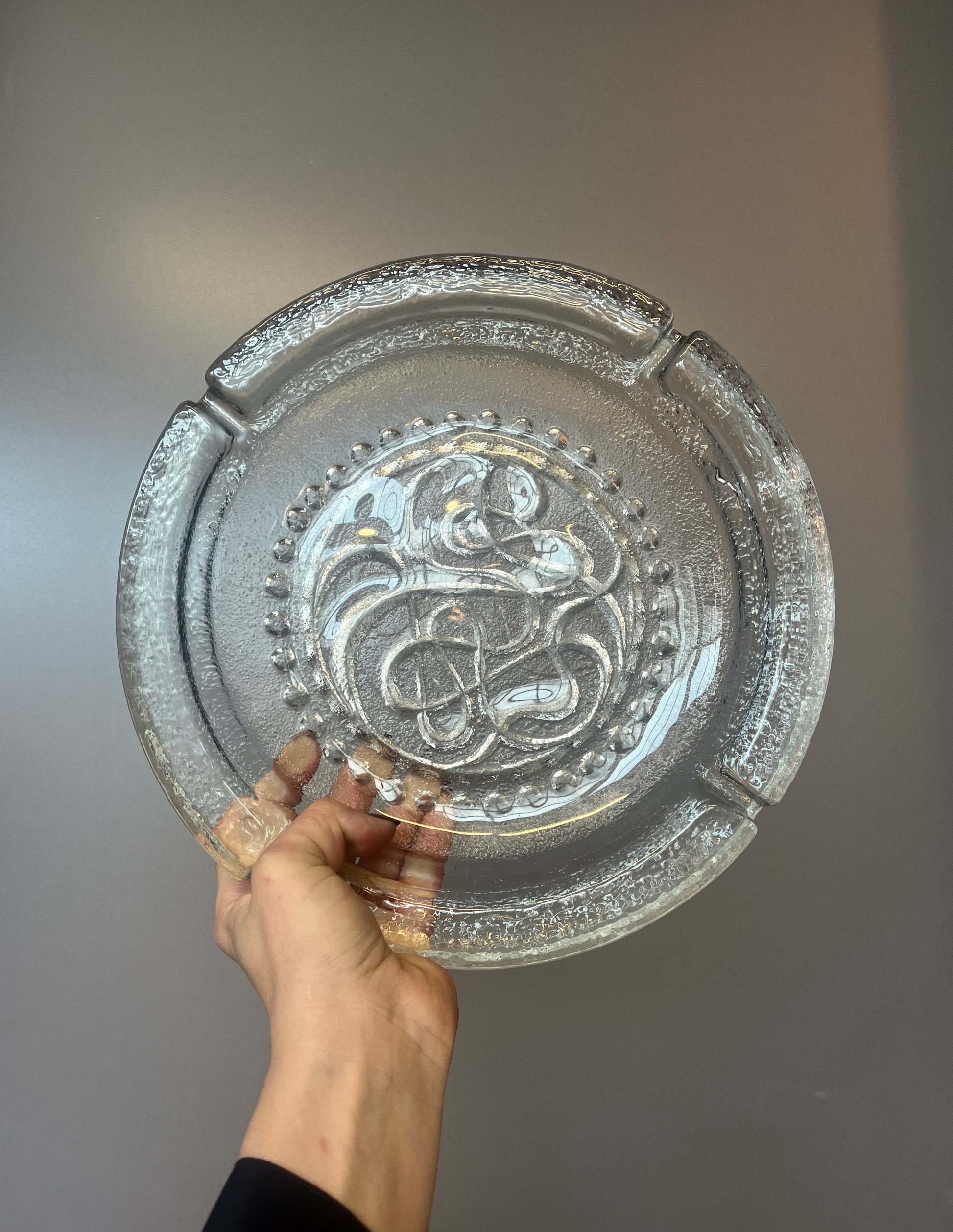 Very large and heavy, thick textured Blenko glass ashtray, with four cigarette slots. Very mid-century swirl design on bottom.