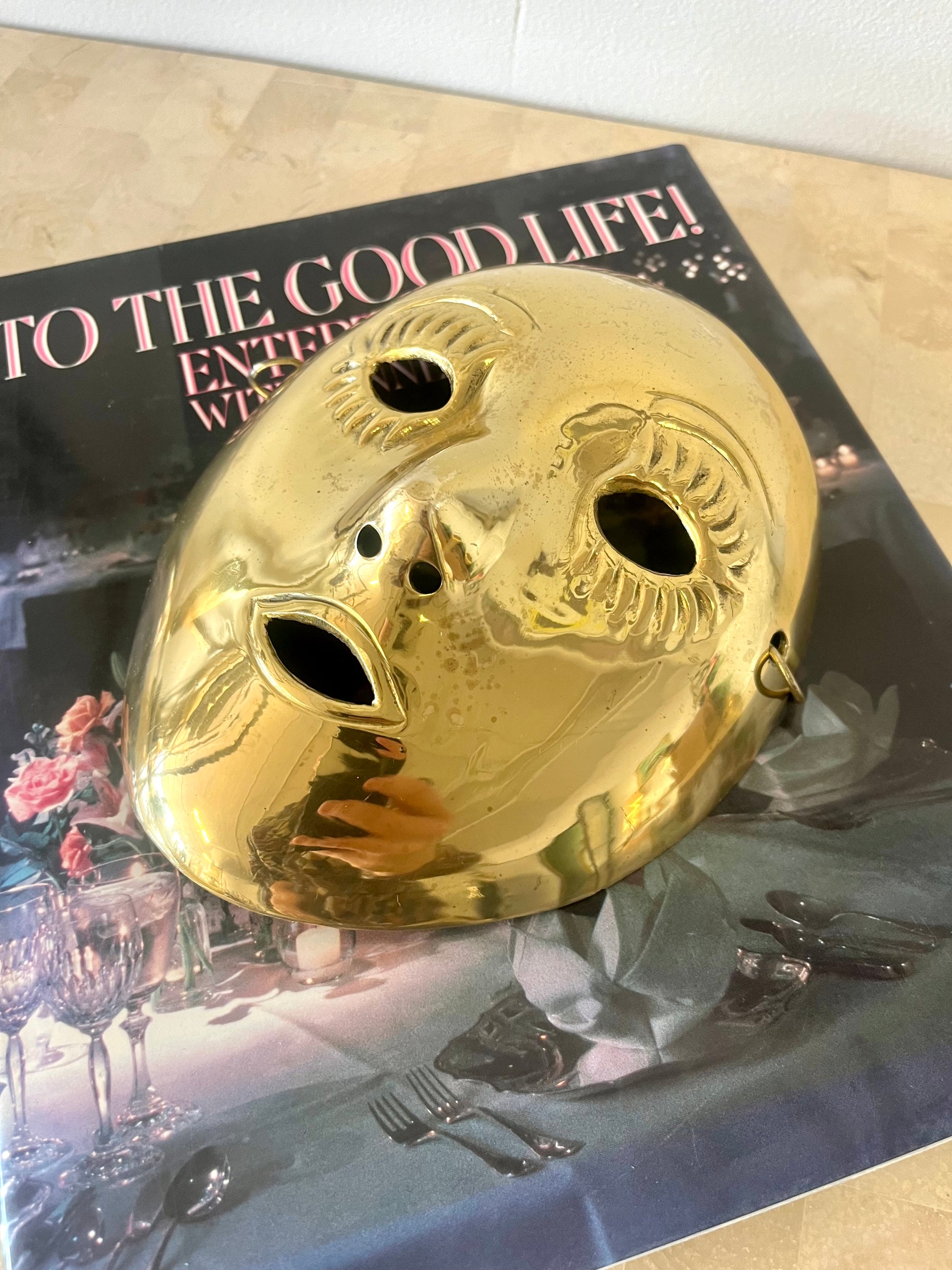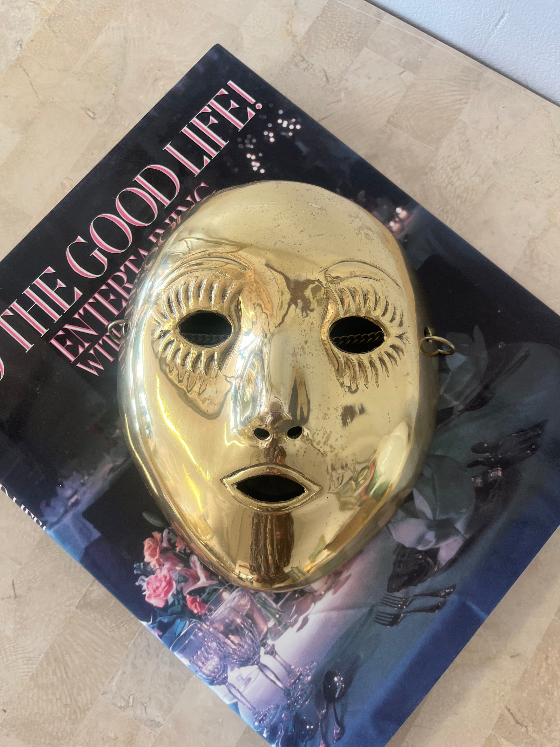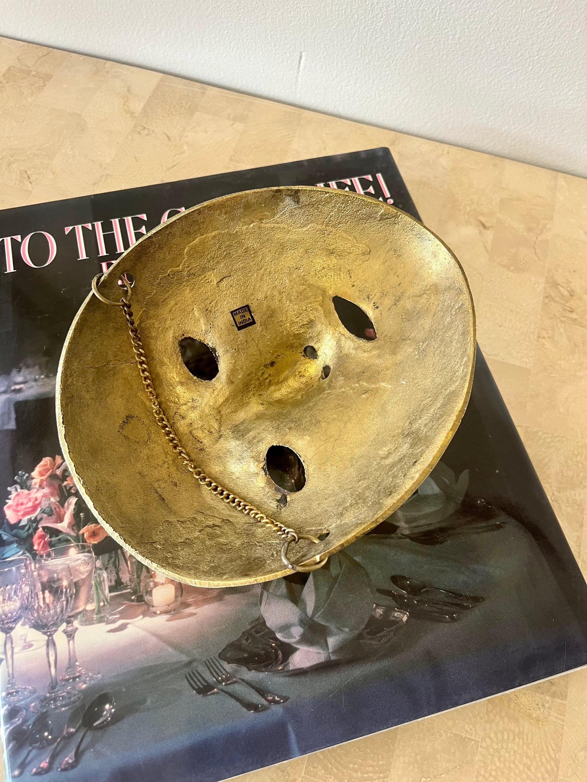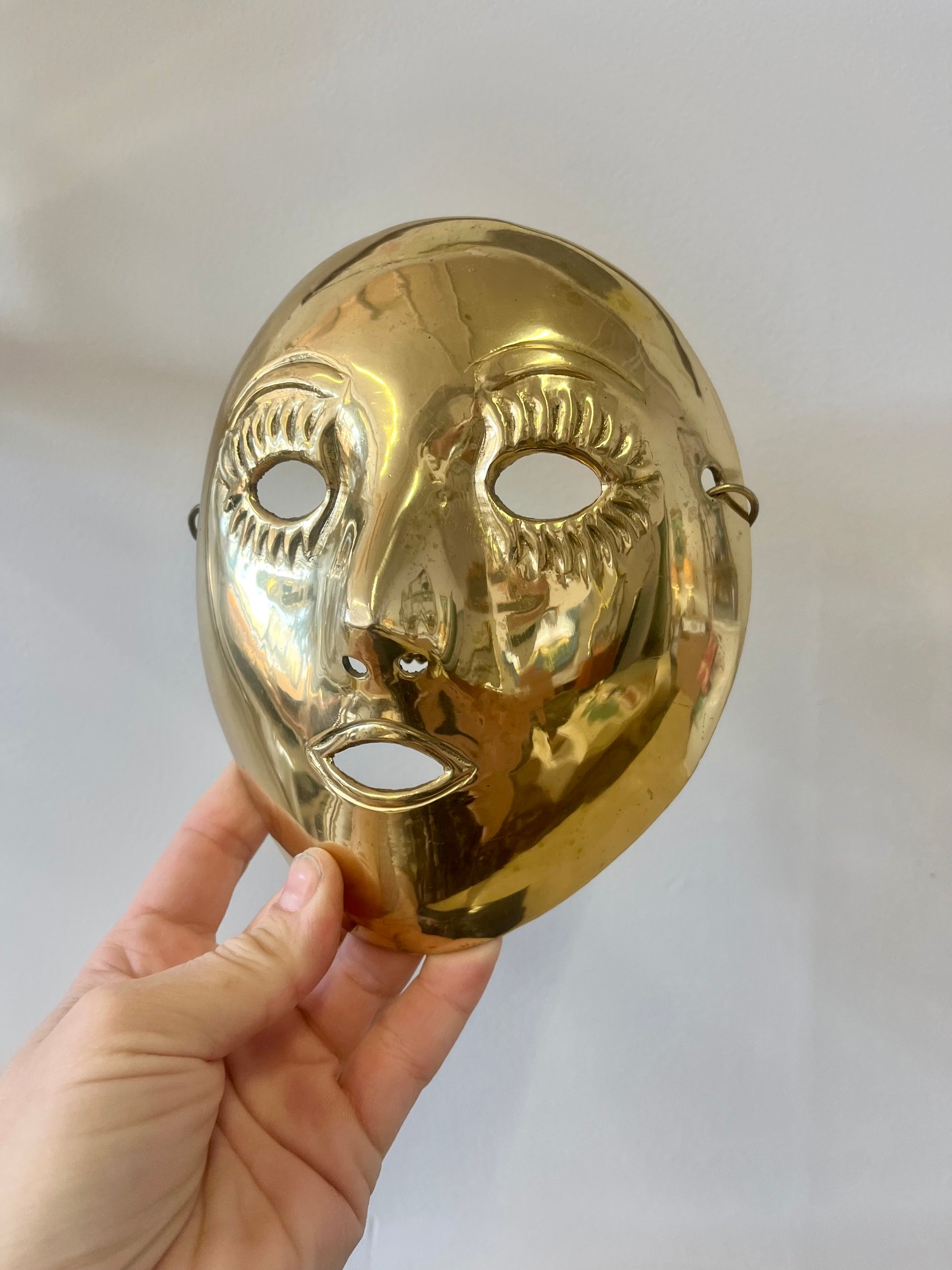 Amazing vintage brass mask with hanging chain on back. Wondering eyelash and eyebrow detailing. Made in India.