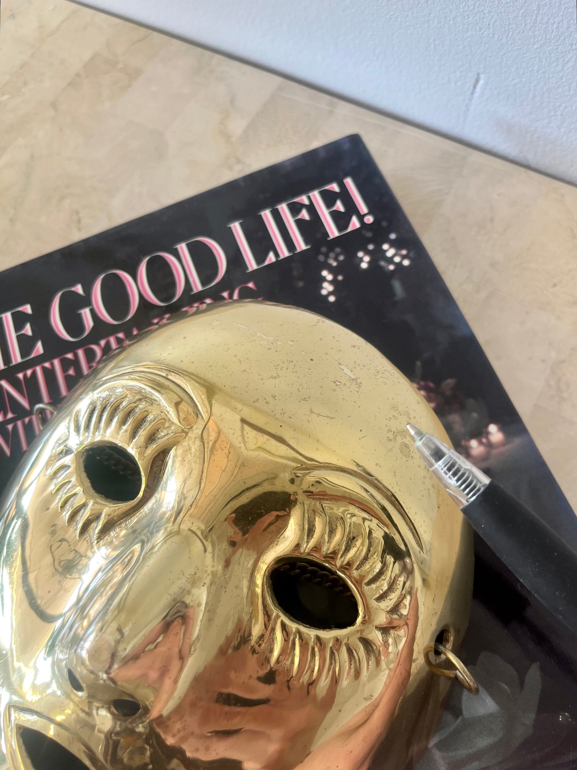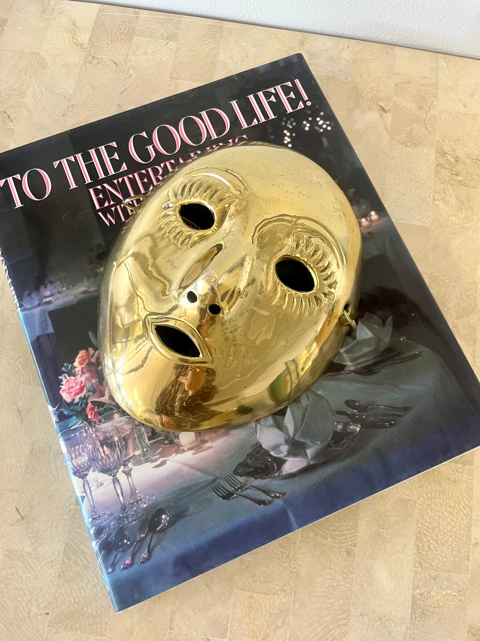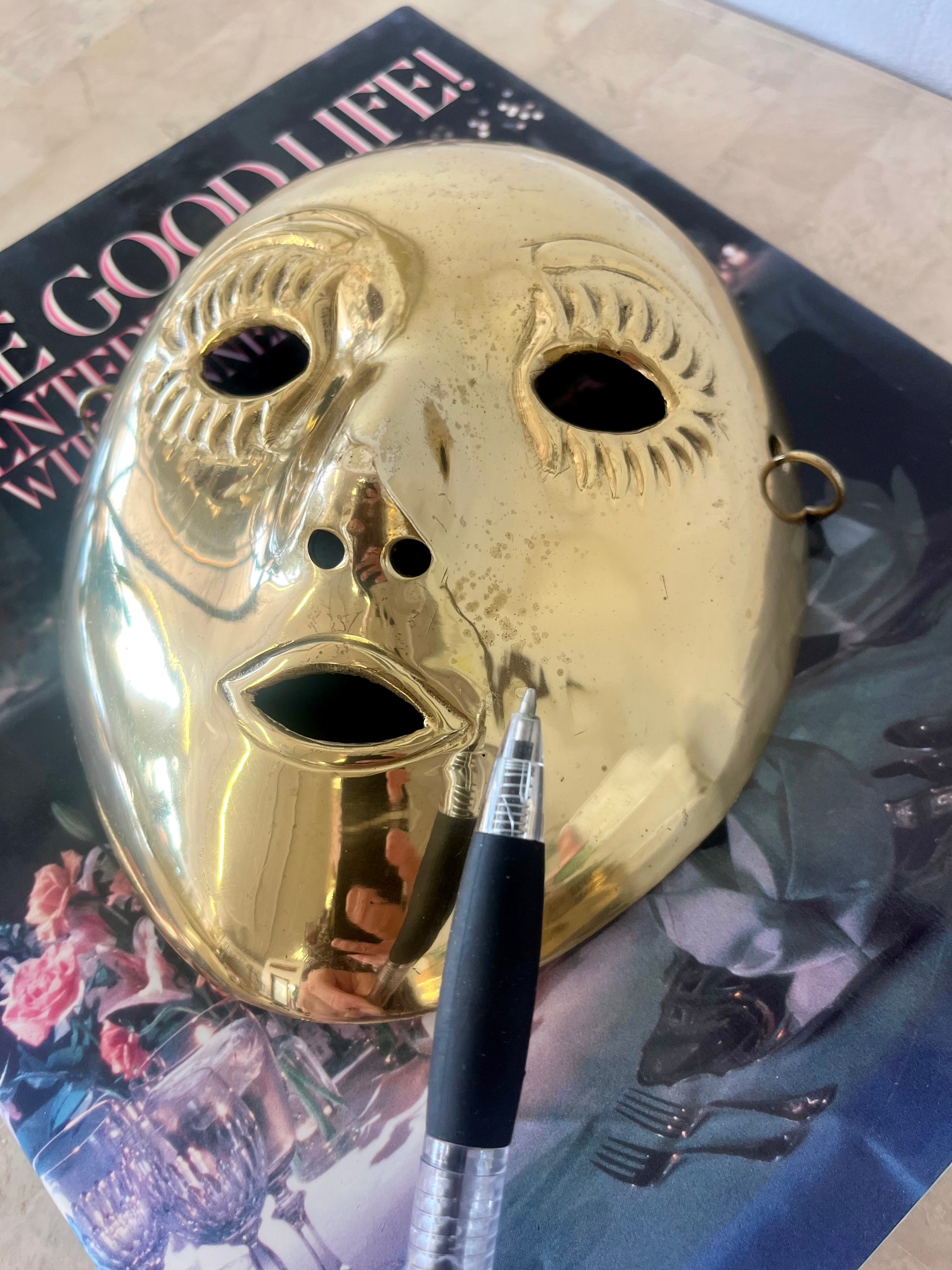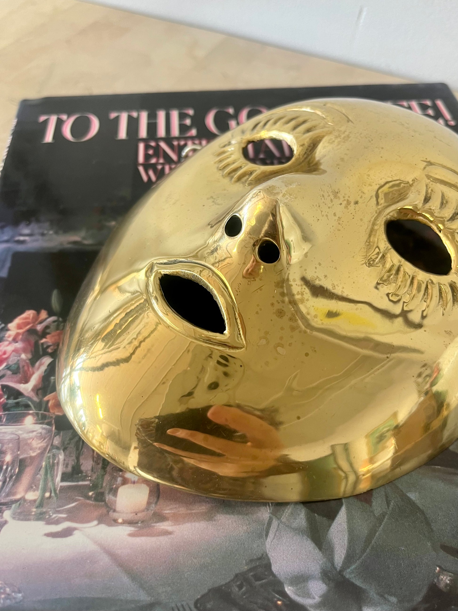 Amazing vintage brass mask with hanging chain on back. Wondering eyelash and eyebrow detailing. Made in India.