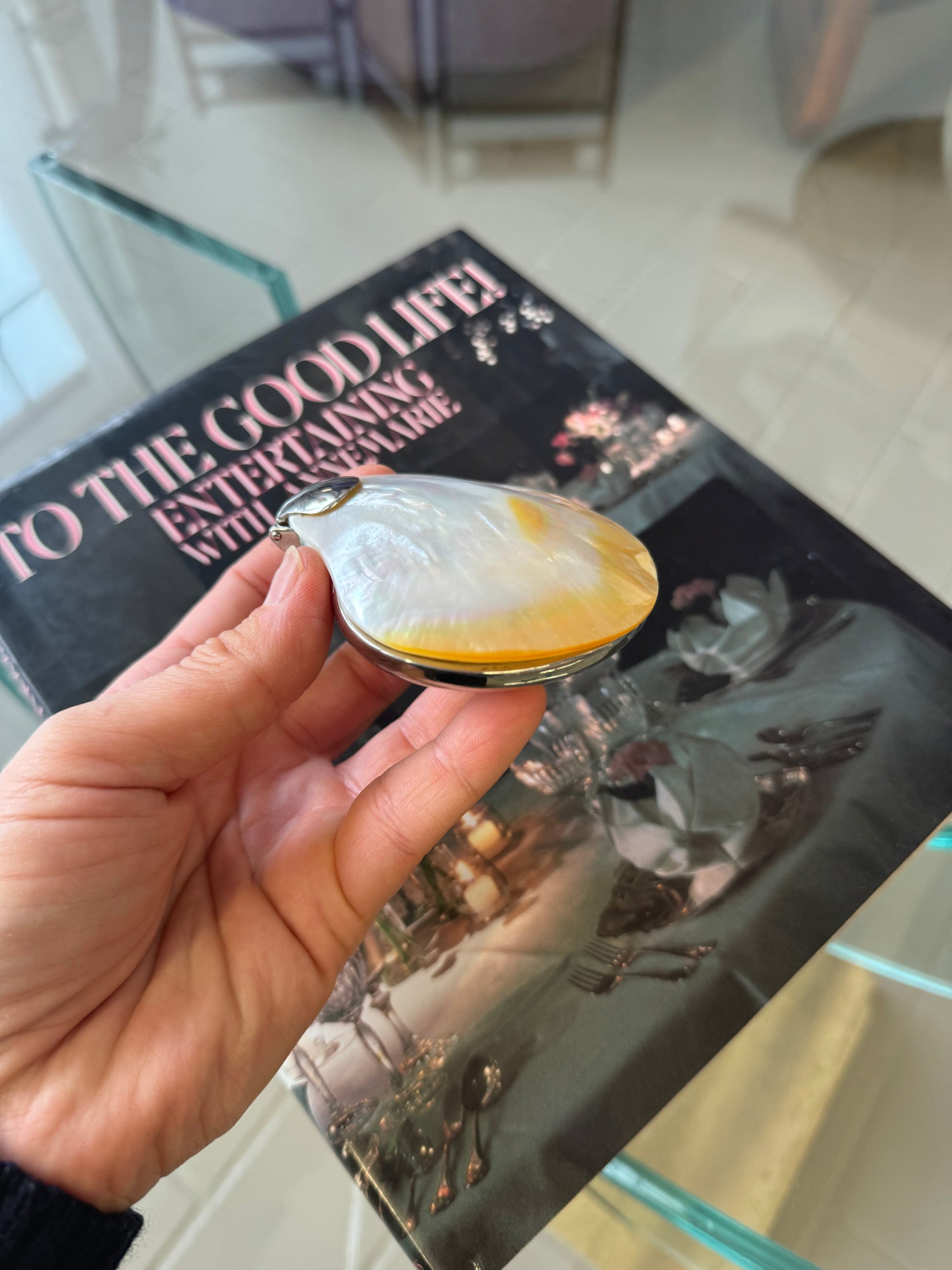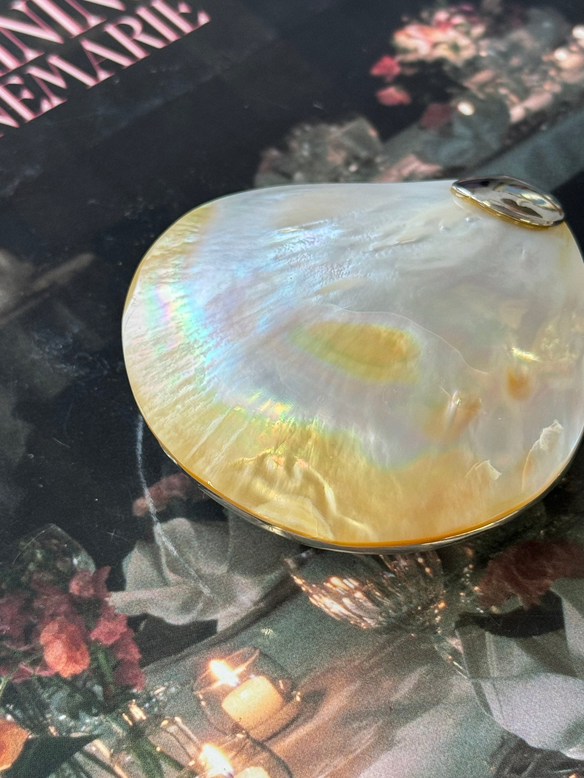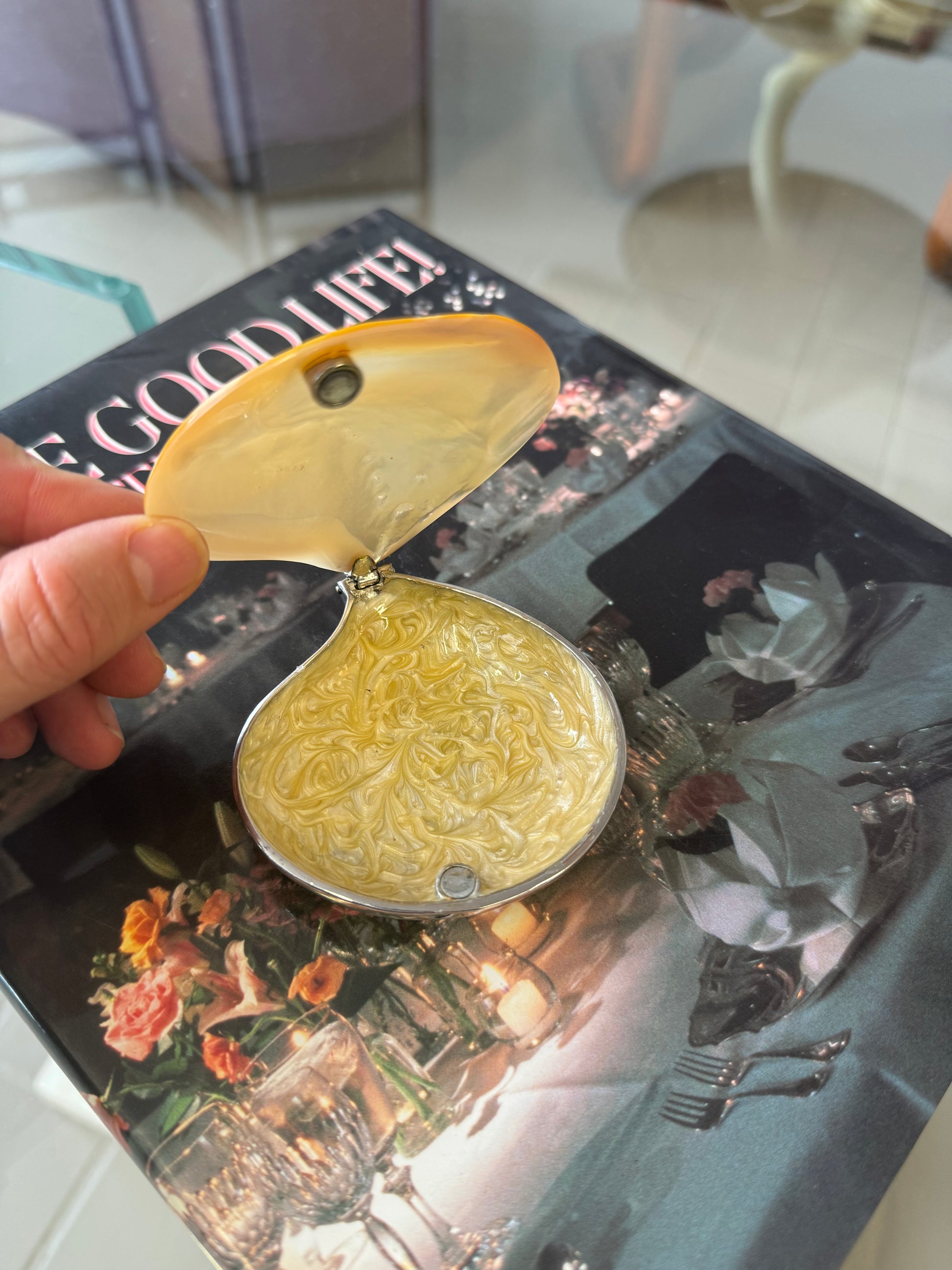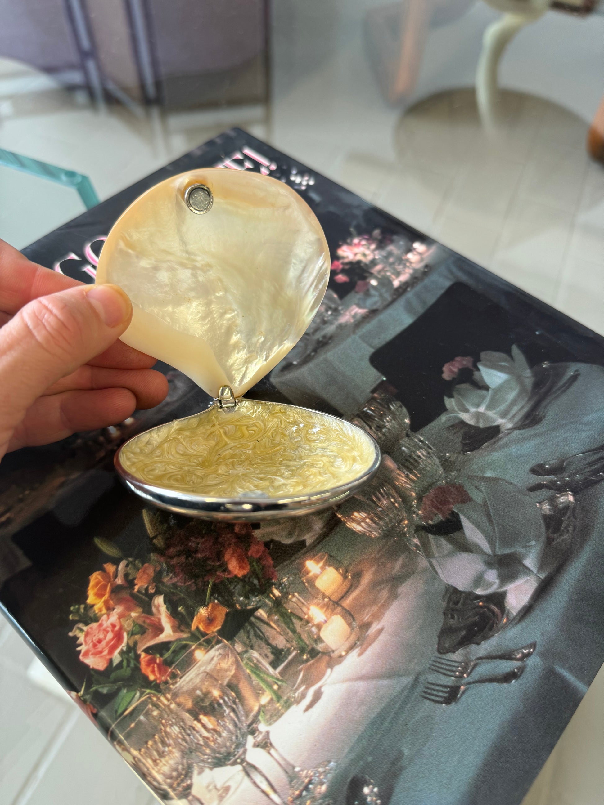 Lovely vintage mother-of-pearl trinket box. Metal base, marbled enamel interior. Magnetic latch.