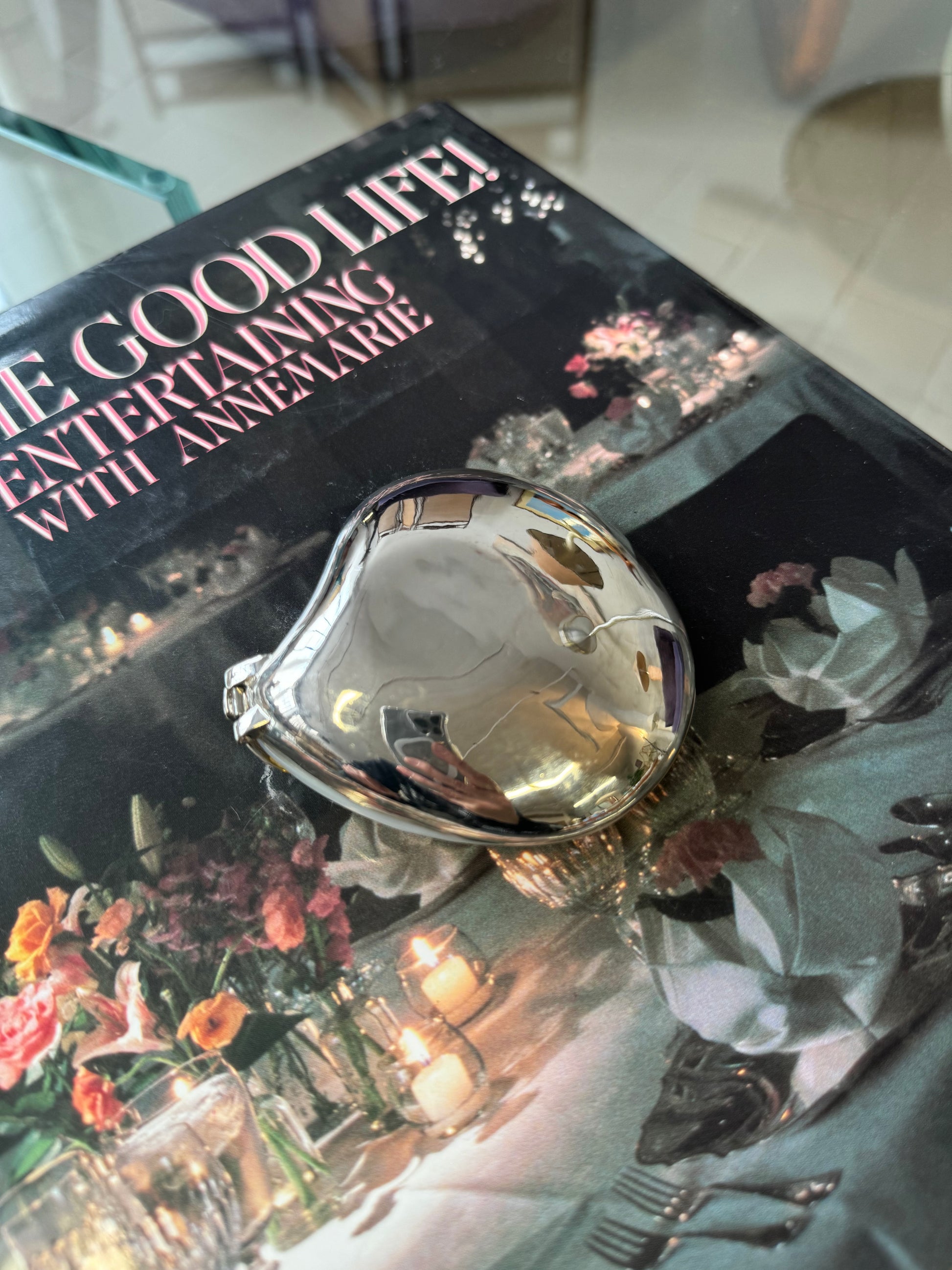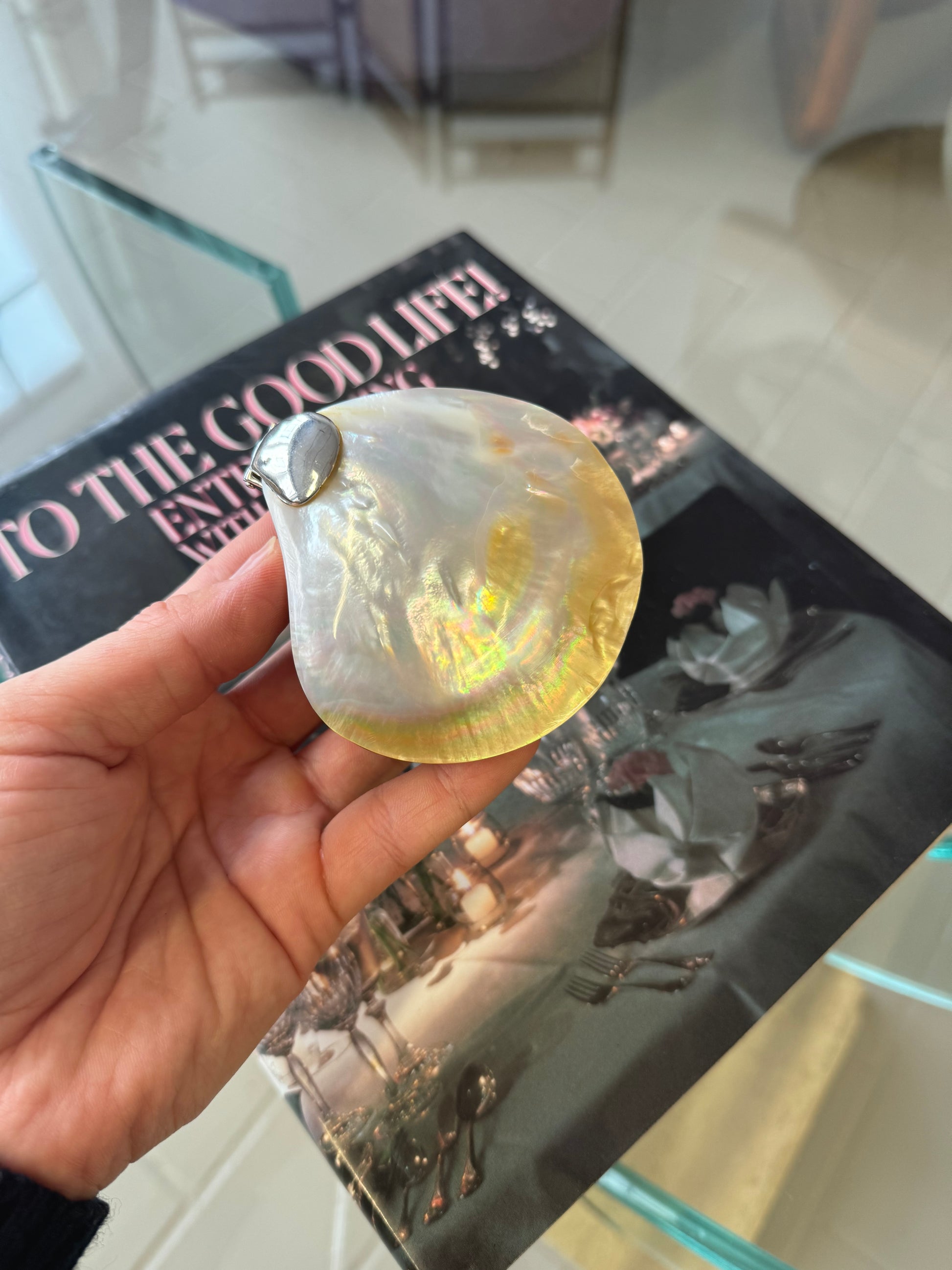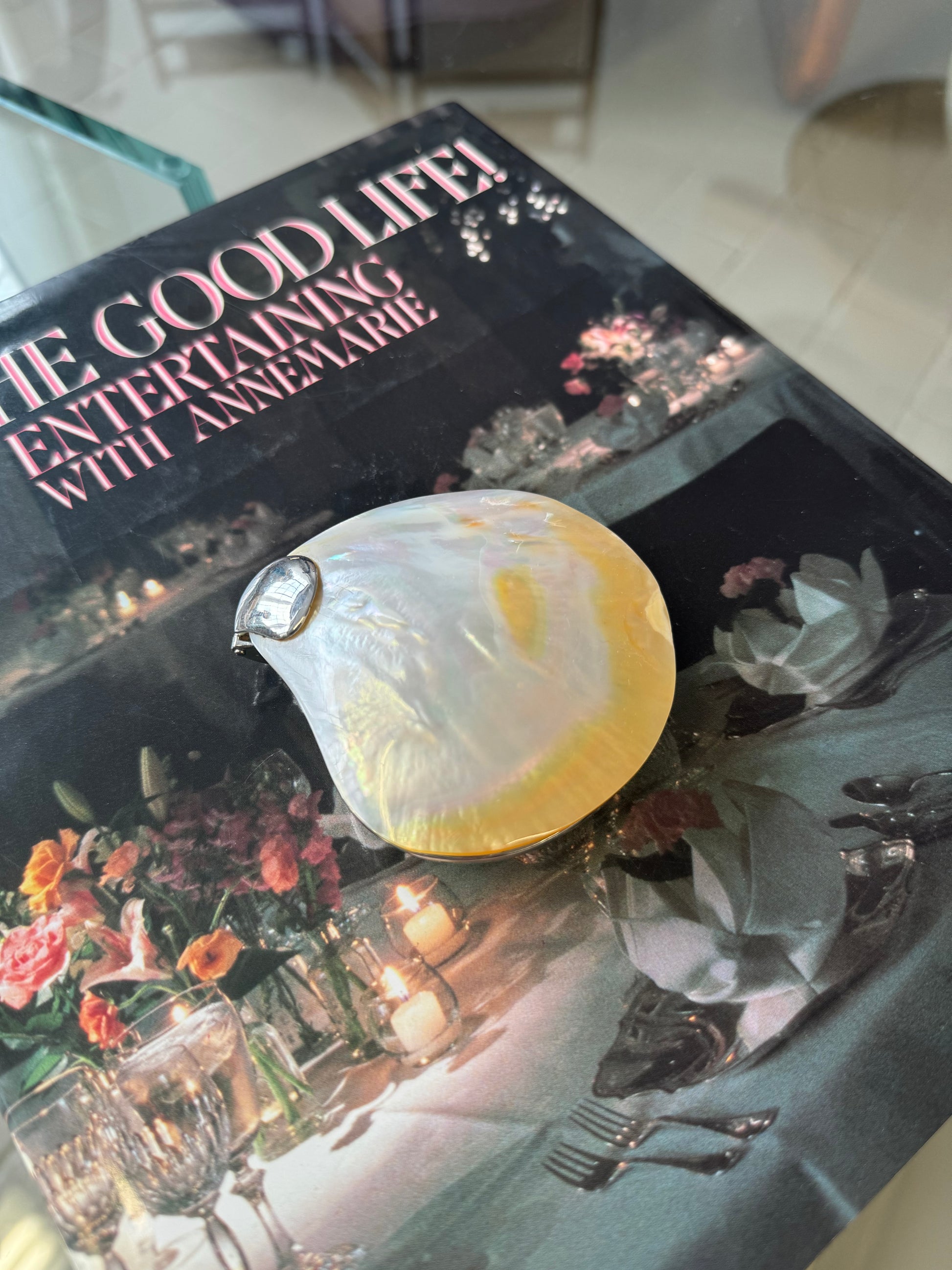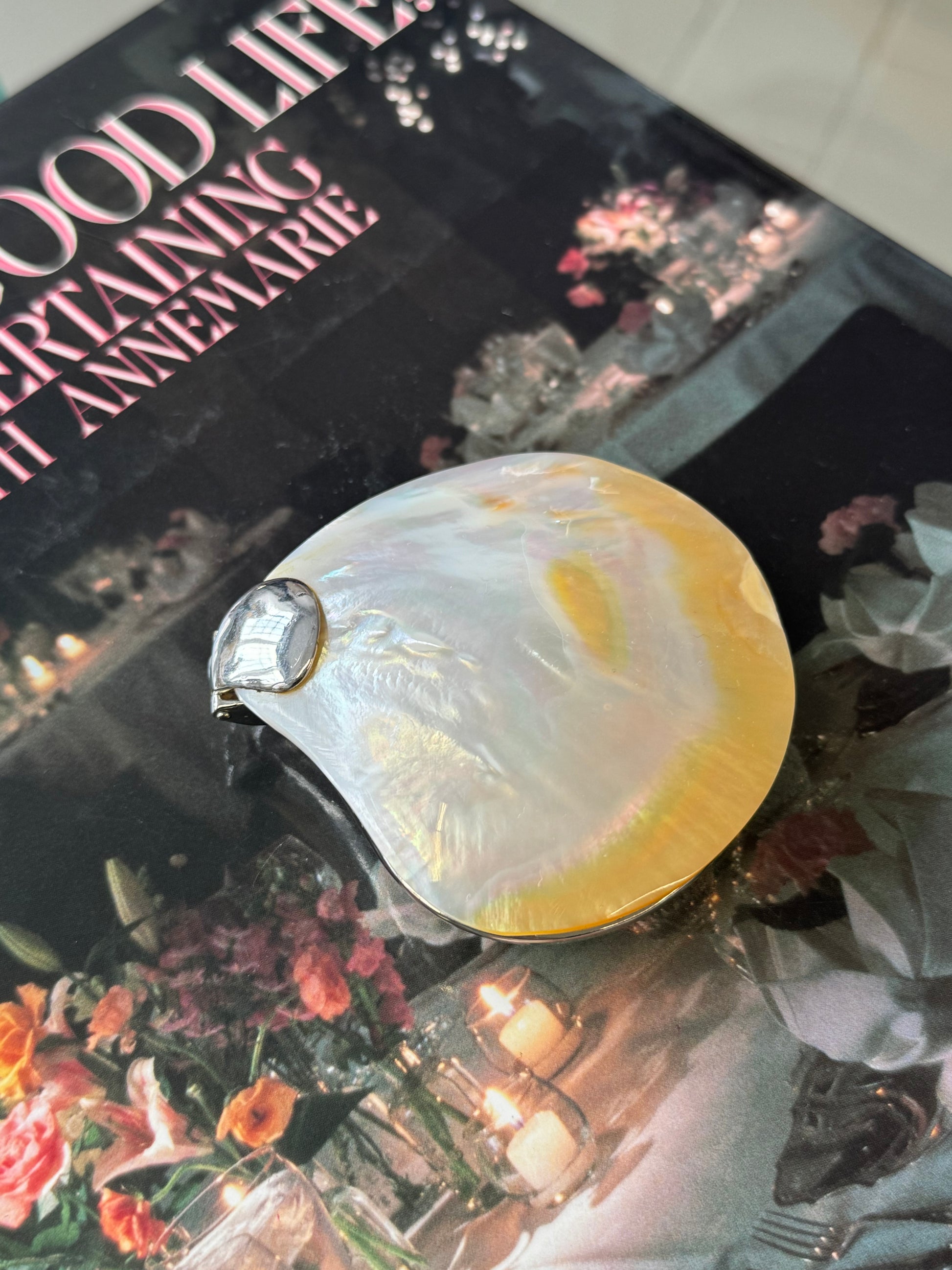 Lovely vintage mother-of-pearl trinket box. Metal base, marbled enamel interior. Magnetic latch.