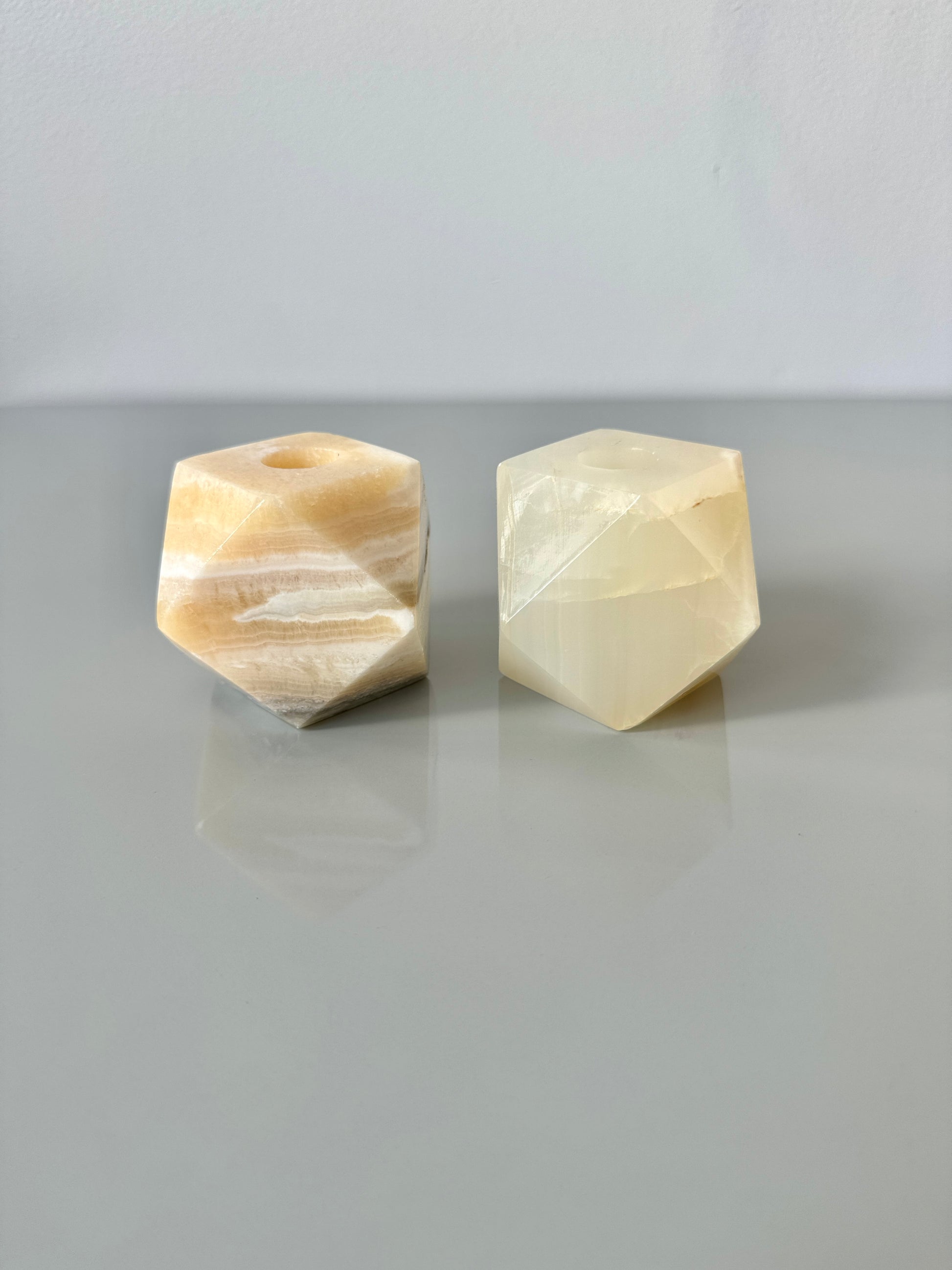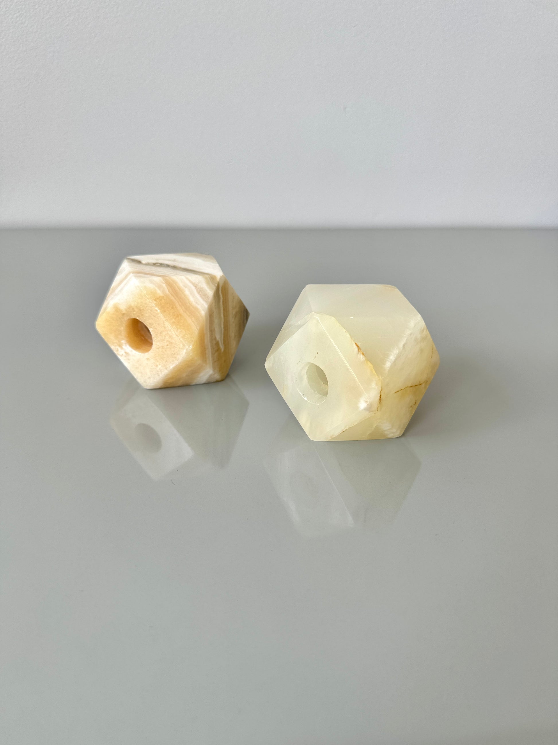 Beautiful vintage polyhedron onyx candle holders. One with lots of cream and white veining throughout, one more crystalline translucent. Would also make a lovely paperweight. Made in Mexico. Sold individually.