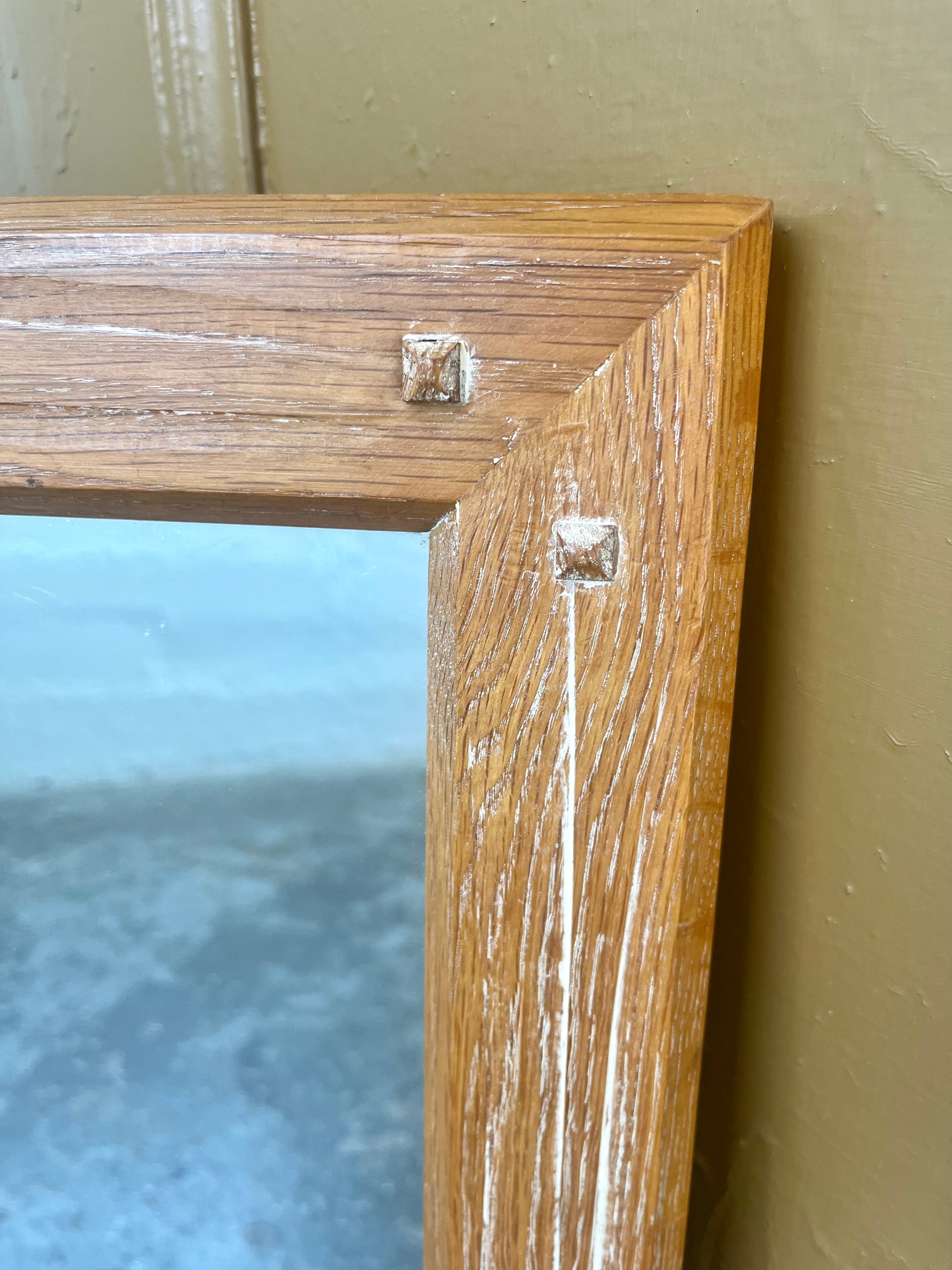 Wonderful vintage 1960s-70s solid oak rectangular wall mirror. Carved and cerused - similar to whitewashing, but more subtle, where color, in this case white, is rubbed into the pores of wood to highlight the patterns of the wood grain. In this mirror, with the carved corners, it gives the mirror its rustic “Ranch Oak” look. Beautiful, heavy piece. Made in the USA and originally purchased at Kunzelmann-Esser in Milwaukee. Wire on back.